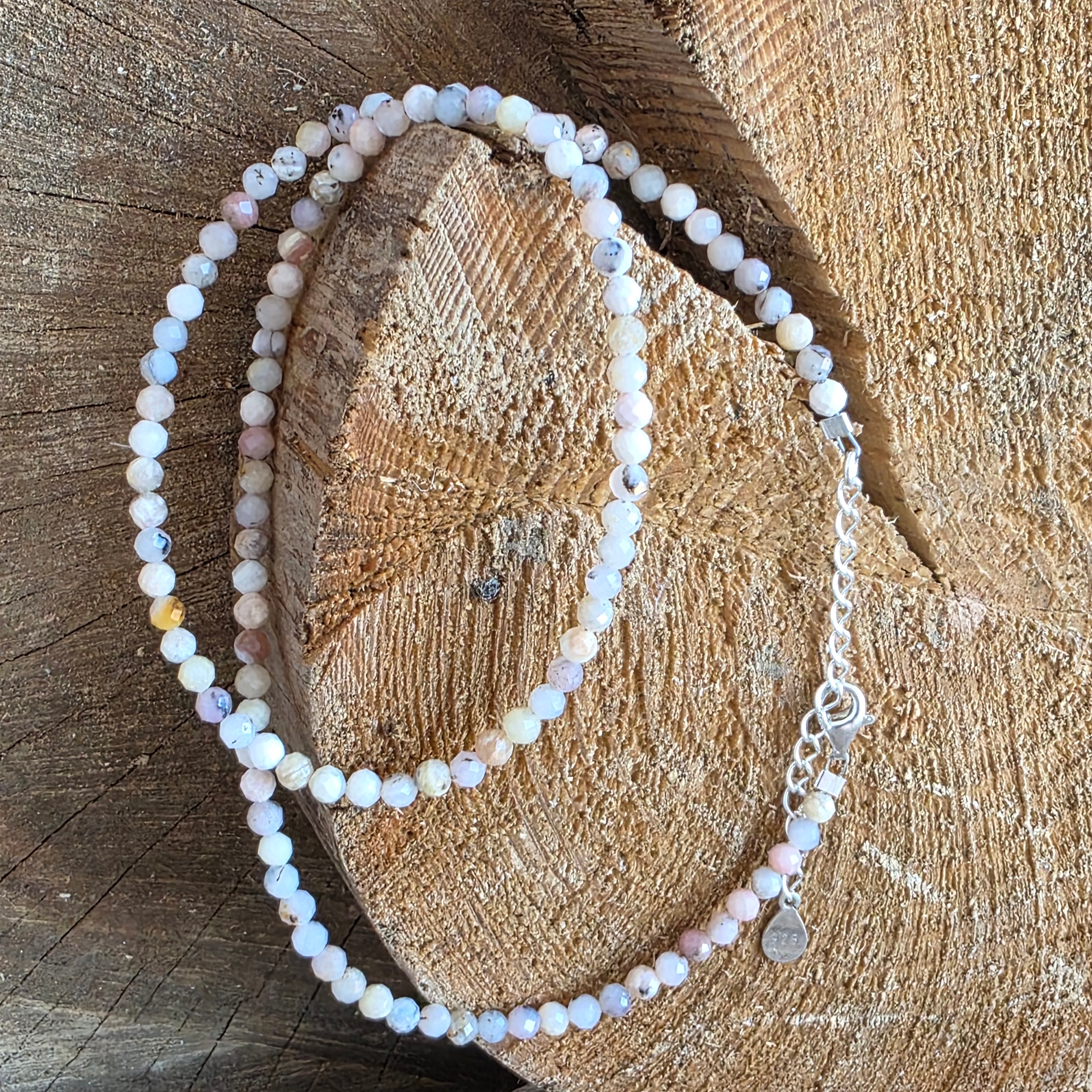 Egy finom és ragyogó nyaklánc, 3 mm-es rózsaszín opál csiszolt gyöngyökből, amelyek finom és harmonikus vonalat alkotnak a nyak körül. A lágy, tejes rózsaszín árnyalatok finom visszfényekkel és enyhén áttetsző textúrával meleg és kifinomult hangulatot kölcsönöznek az ékszernek. A finom csiszolás mélységet és visszafogott fényt ad, anélkül, hogy uralkodna, elegáns vizuális egyensúlyt tartva.