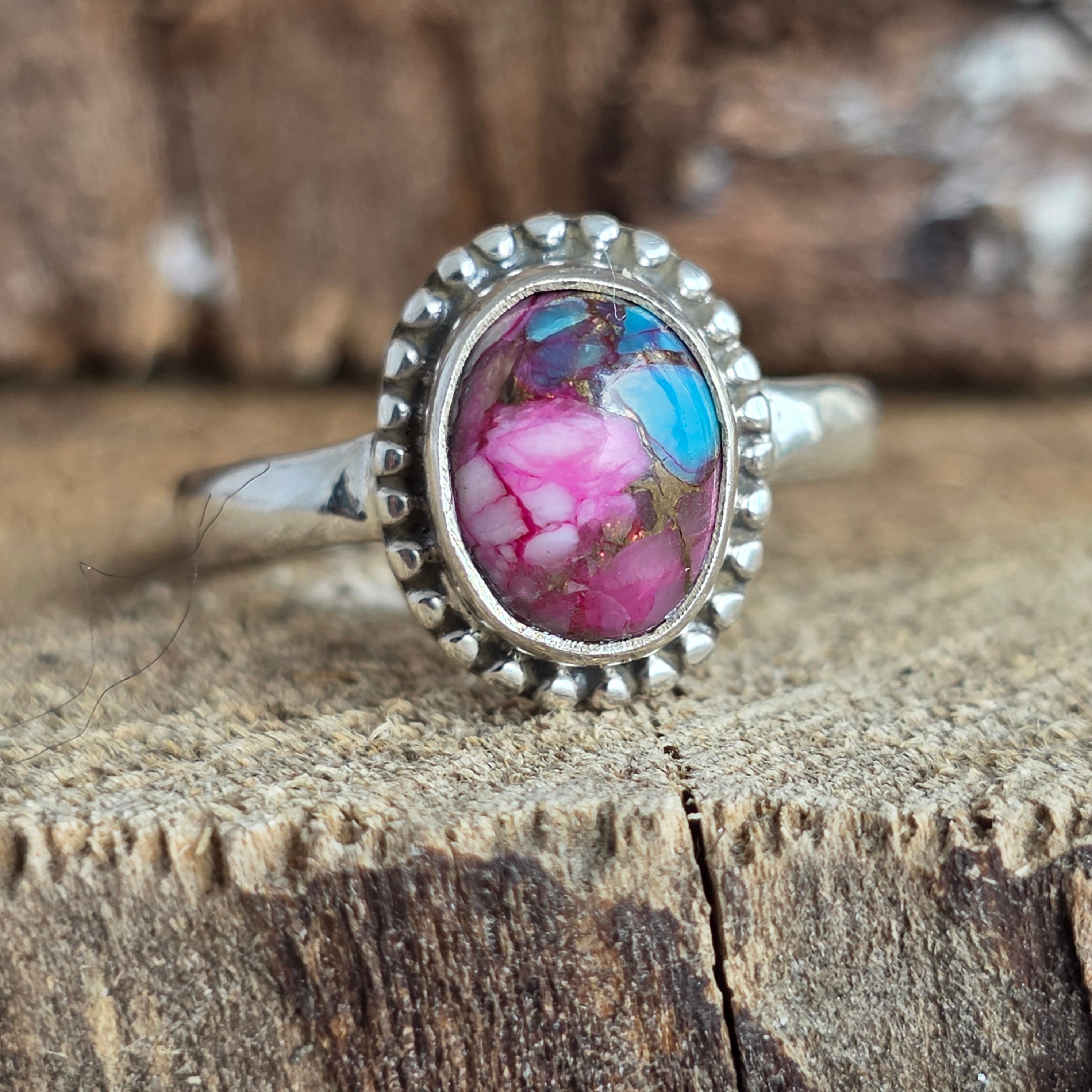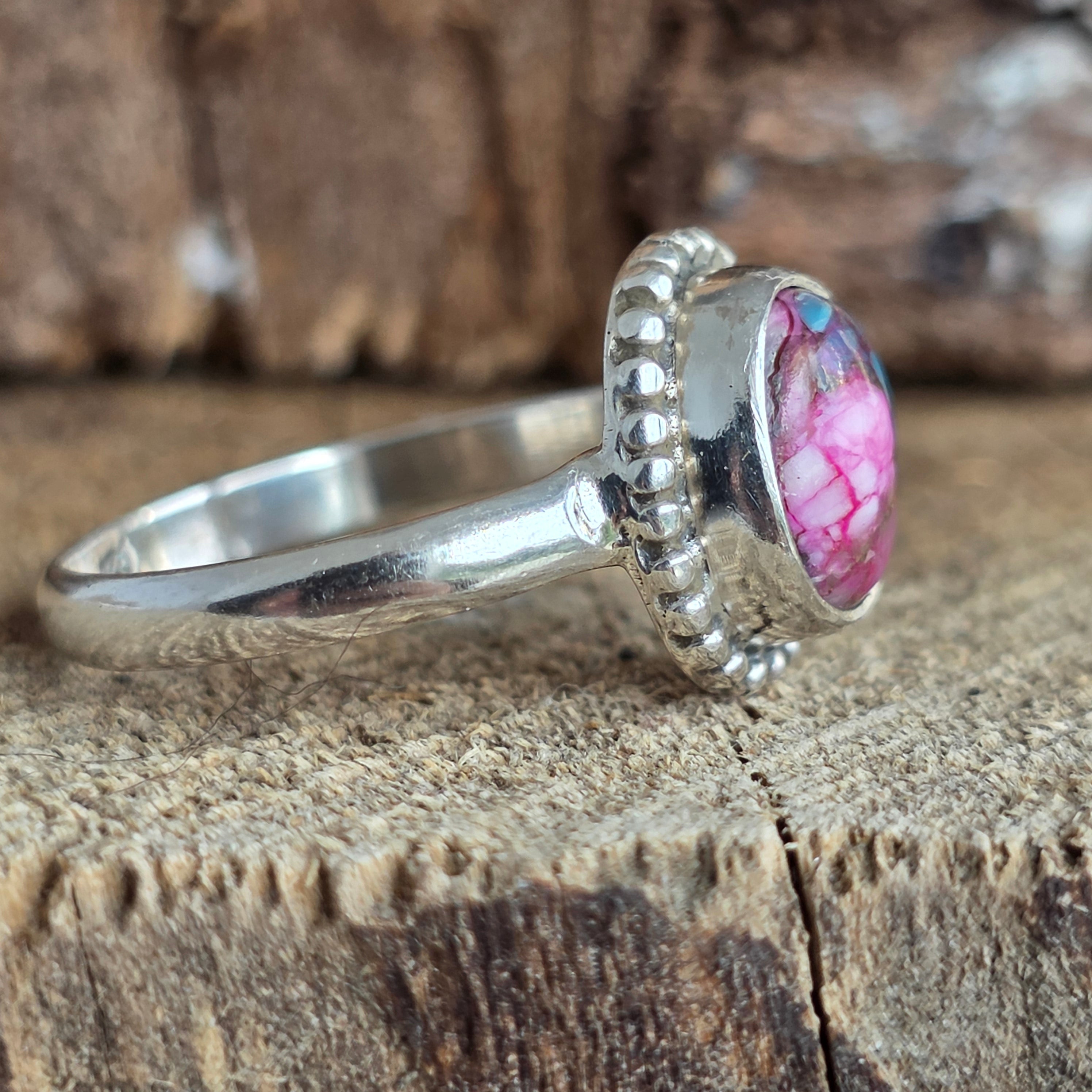 Egy finom gyűrű, élénk jelenléttel – kézzel készült 925 ezüstből, és kővel nemesi díszítéssel. Rózsaszín dahlia réz-türkiz, amely élénk fukszia árnyalatokat, intenzív rózsaszínt, türkizkéket és meleg rézszíni tükörképeket ötvöz.