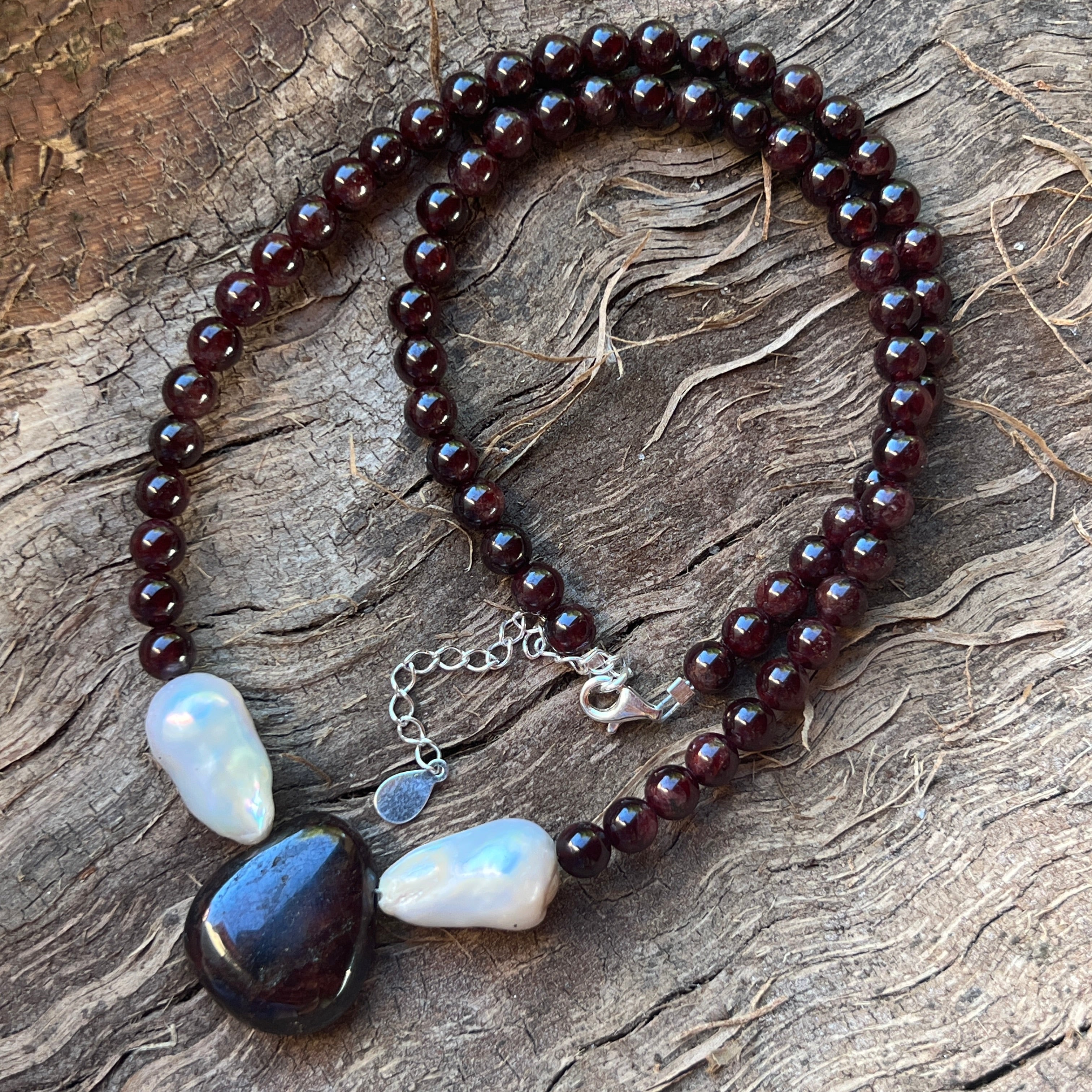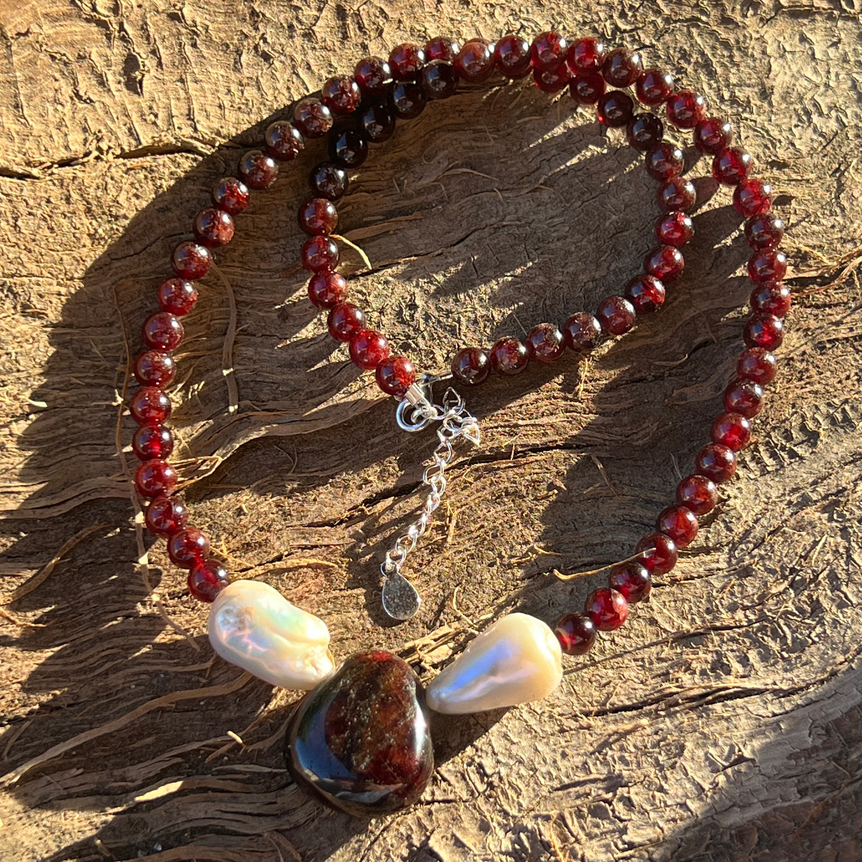 A gránát a szenvedély, a bátorság és az elszántság köve. Támogatja a lehorgonyzást, az érzelmi regenerálódást és a vitalitás aktiválását. A gyöngyök a női bölcsességet, az eleganciát és a szeretni megtanult lélek harmóniáját idézik.