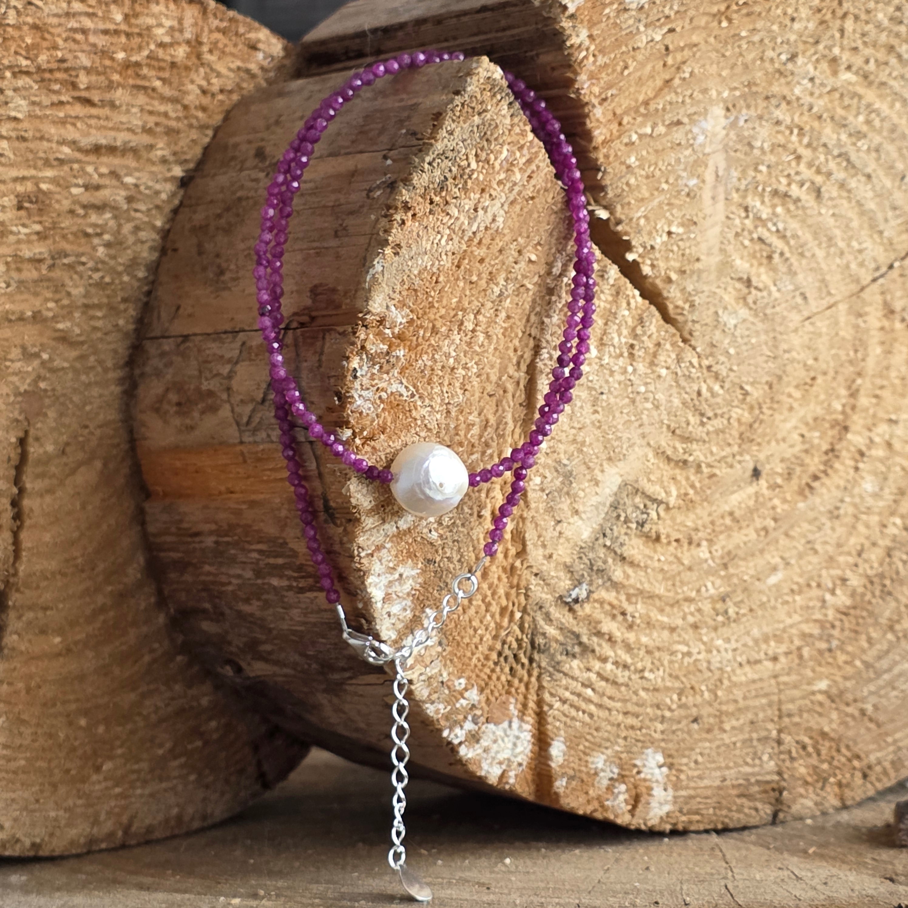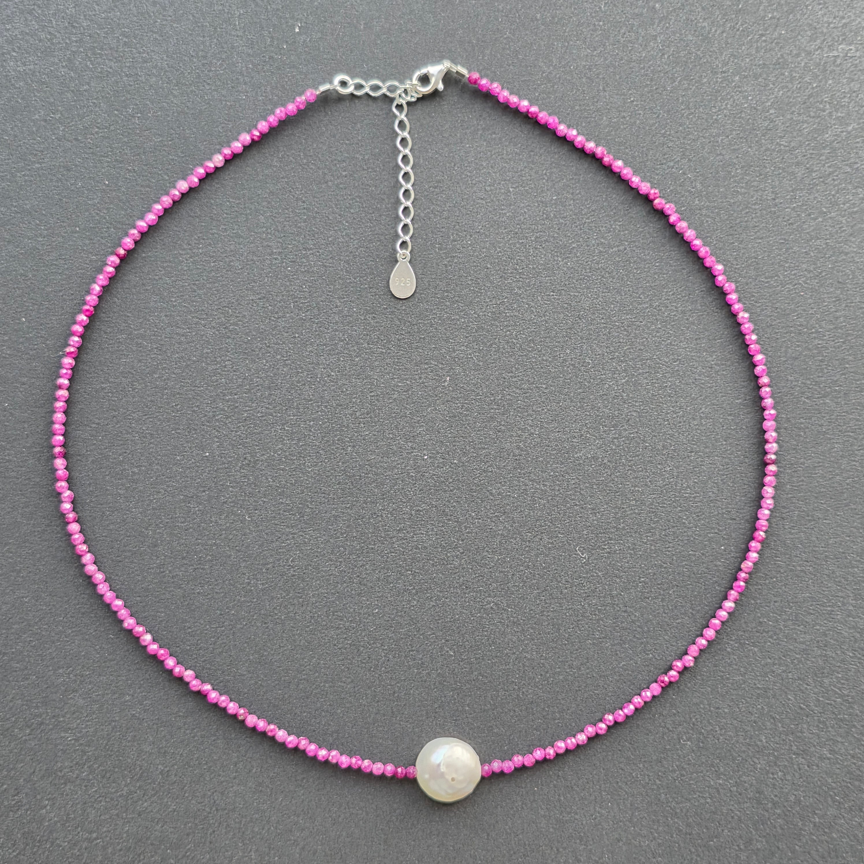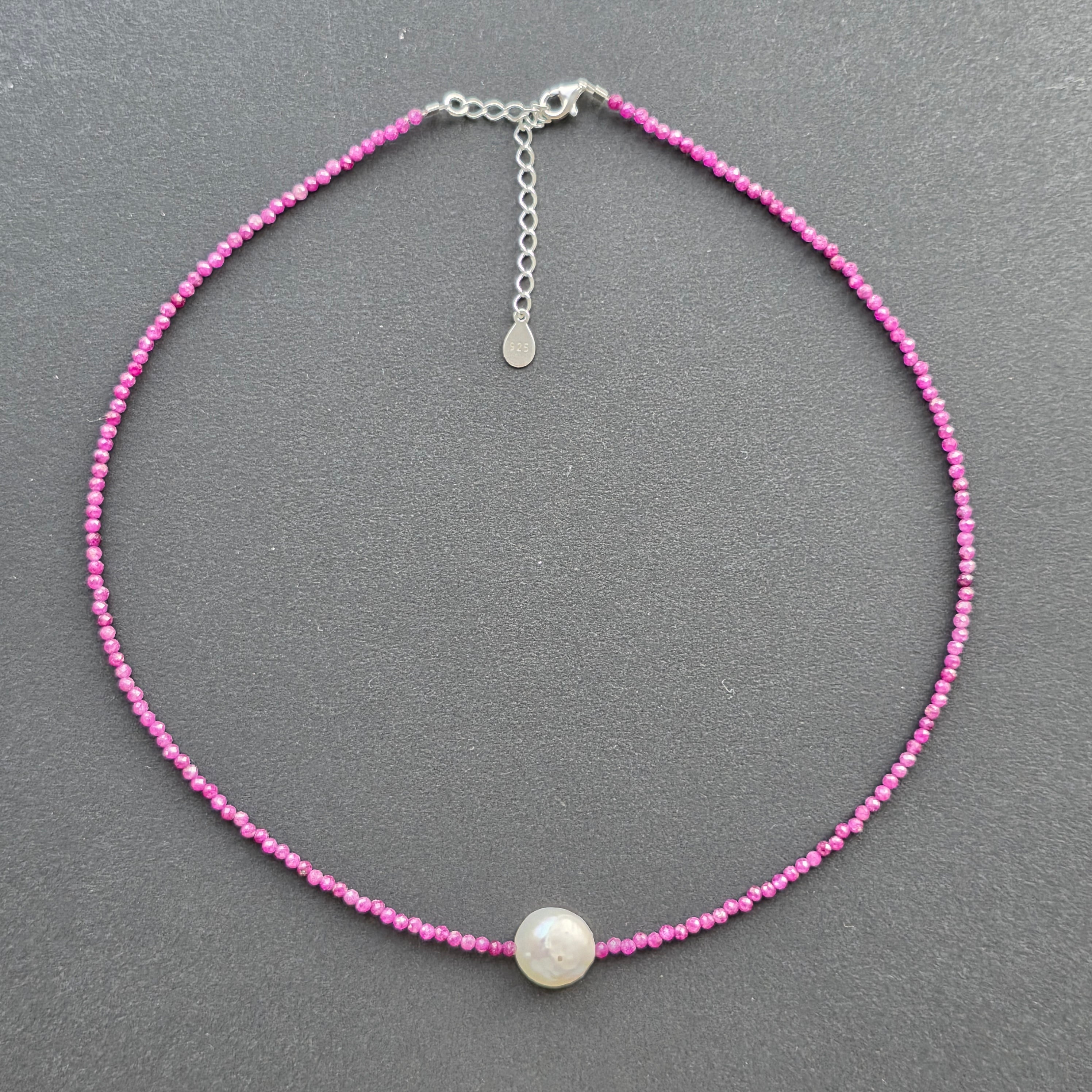 Finom nyaklánc, de jelenléttel készült 2,5 mm-es natúr rubin csiszolt gömbök, mély árnyékában intenzív cseresznye, meleg és szinte királyi reflexekkel. Minden apró, néma gyöngy diszkréten tükrözi vissza a fényt, mint a szenvedély, a szándék és a belső nemesség suttogása.