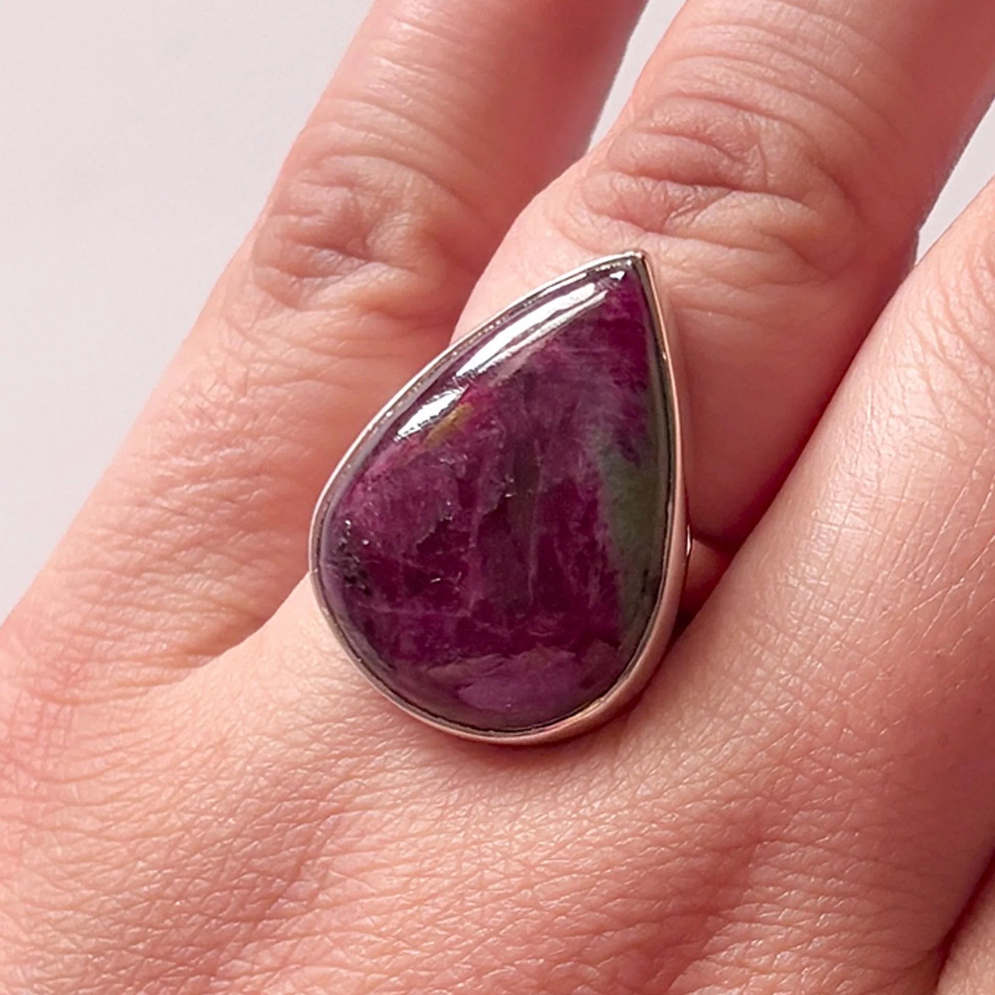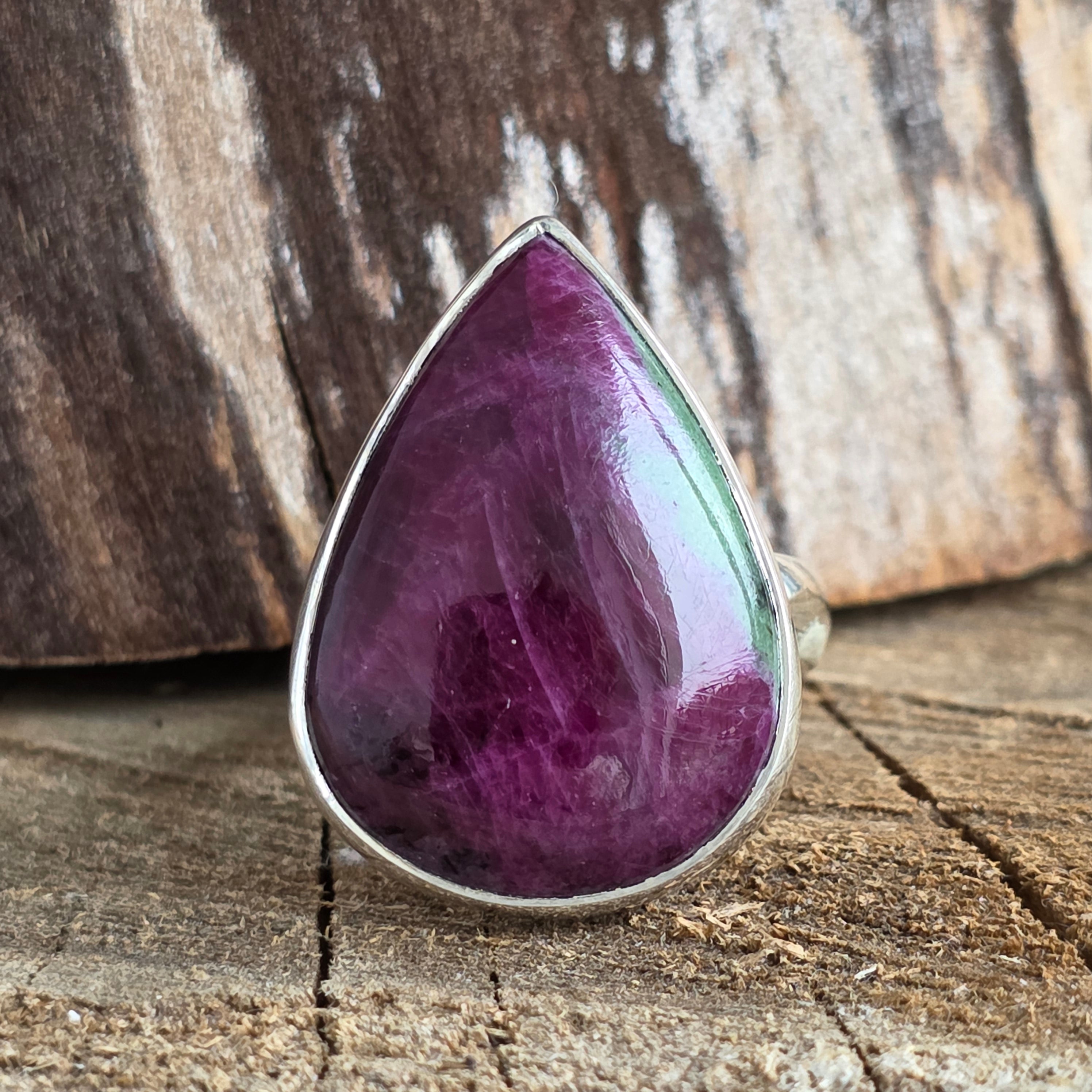 Viseld ezt a rubinnal és zosszittal díszített ezüstgyűrűt, hogy energiát, egyensúlyt és természetes eleganciát hozz az életedbe – egy egyedi darab, amelyet azoknak a lelkeknek terveztek, akik szeretik a ritka ékszereket.