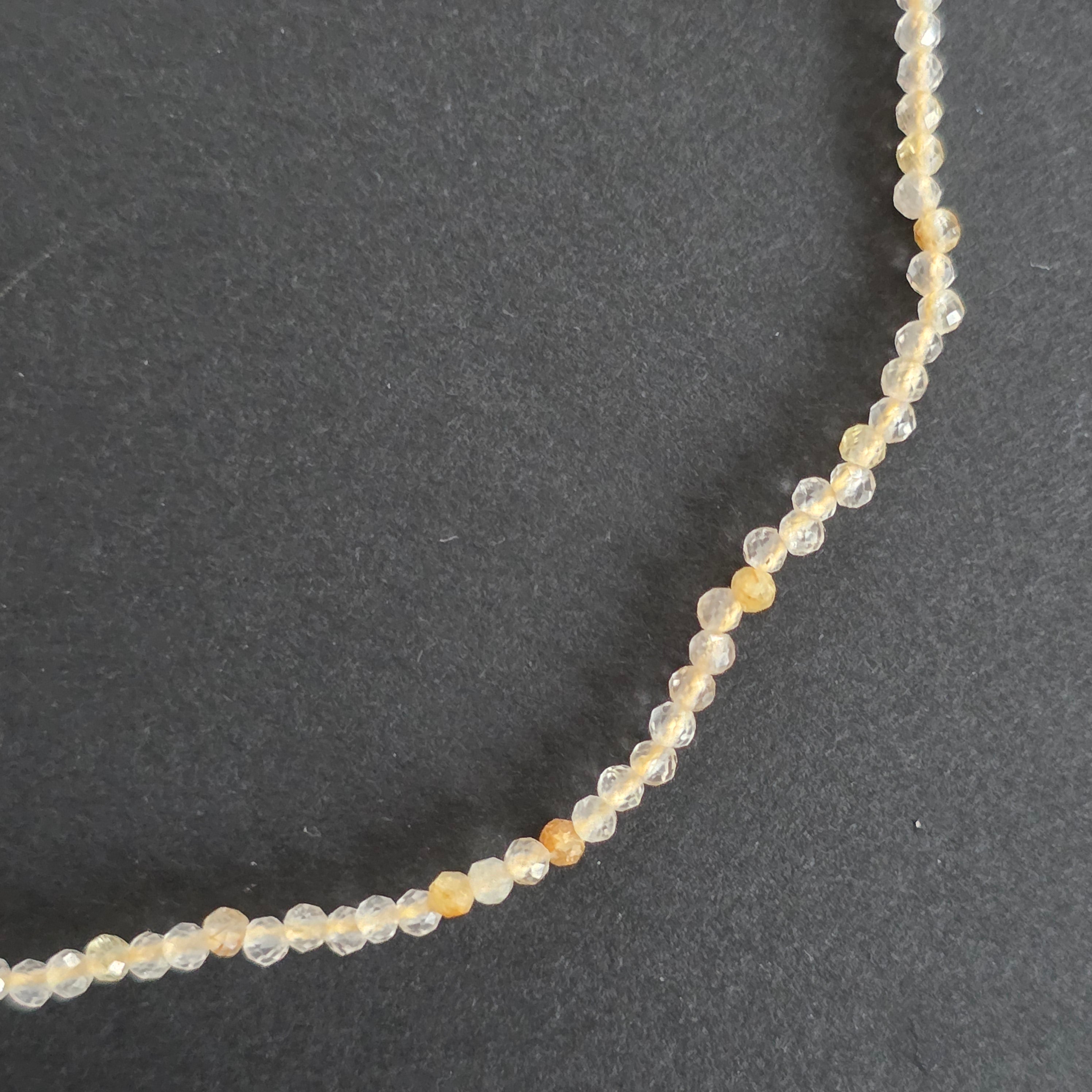 Finom és napsütéses nyaklánc, amelyet meleg csillogásáért és a lágy fényért értékelnek, amit visszaver. A pasztell sárga, áttetsző és finoman irizáló árnyalatok tiszta, fényes, szinte éteri megjelenést kölcsönöznek a nyakláncnak. Minden csiszolt gömb diszkrét fényjátékkal teszi elegánssá a darabot, tökéletes kiegészítő azok számára, akik szeretik a finom és természetes ékszereket.