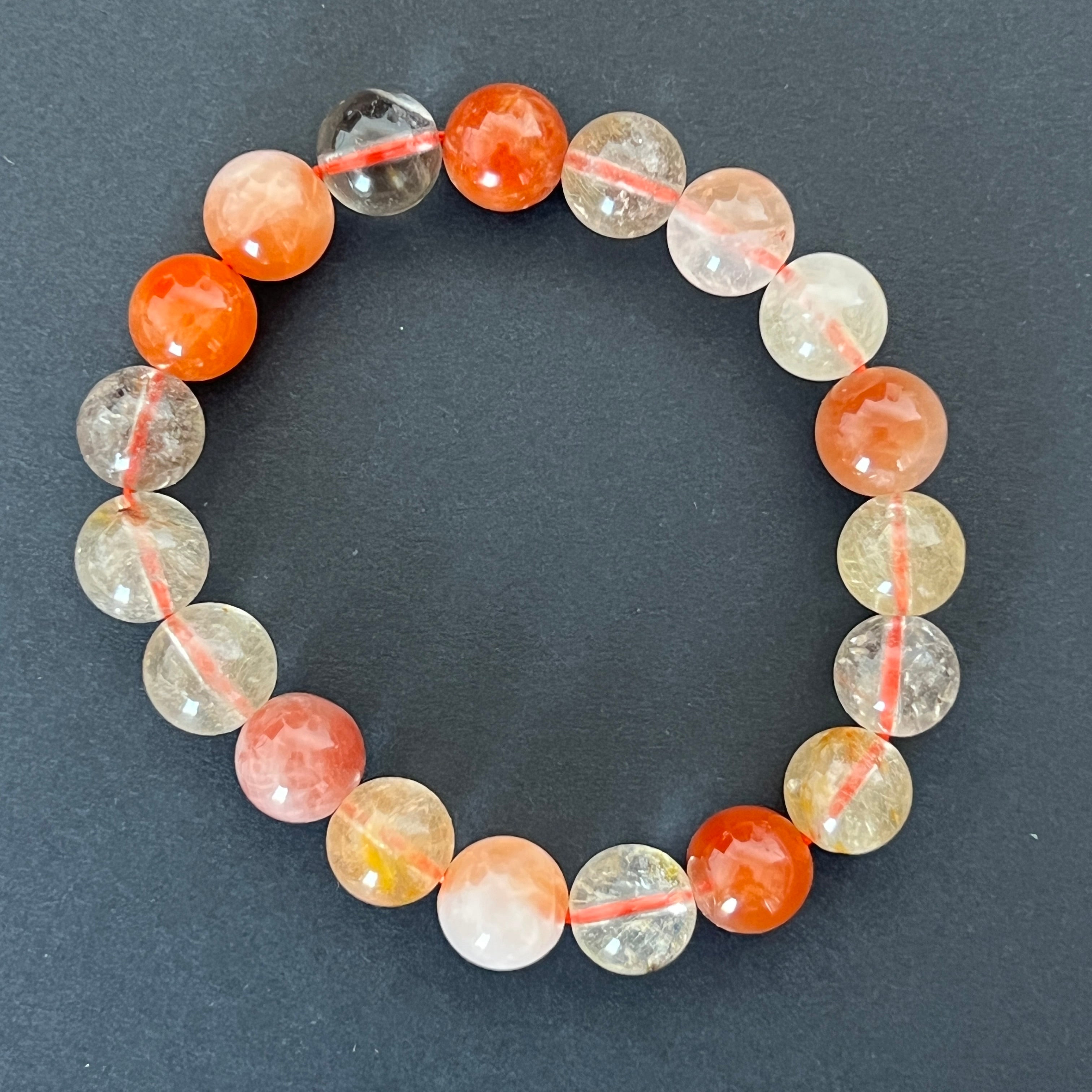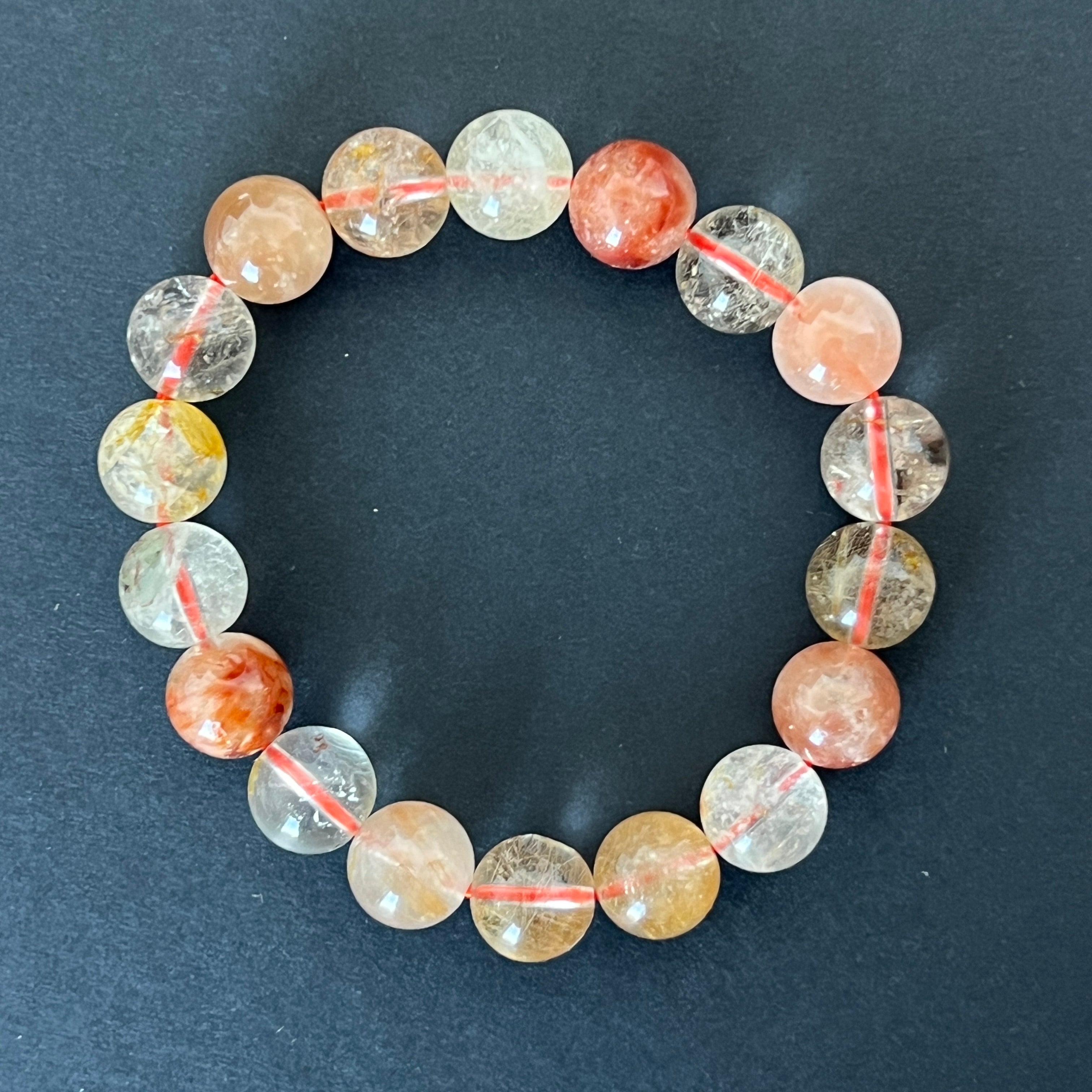Ez a 11 mm-es gömbgyöngyökből készült rutilkvarc karkötő megmutatja a kristály egyedi szépségét, finom rutil szálakkal díszítve. A színkeverék – a tisztától a füstösön át az aranyig – lenyűgöző vizuális játékot hoz létre, ahol minden darab egy kis természetes műalkotás.