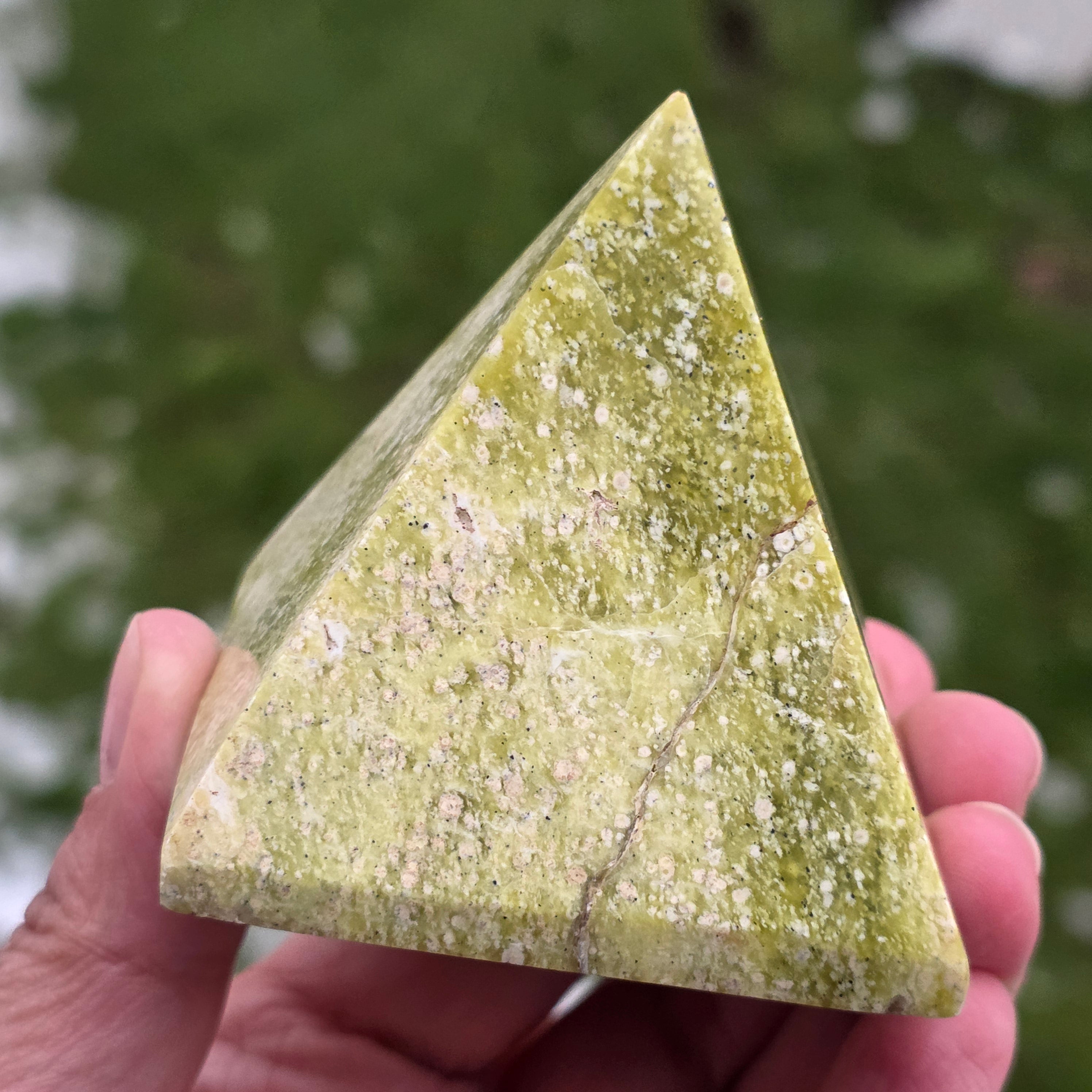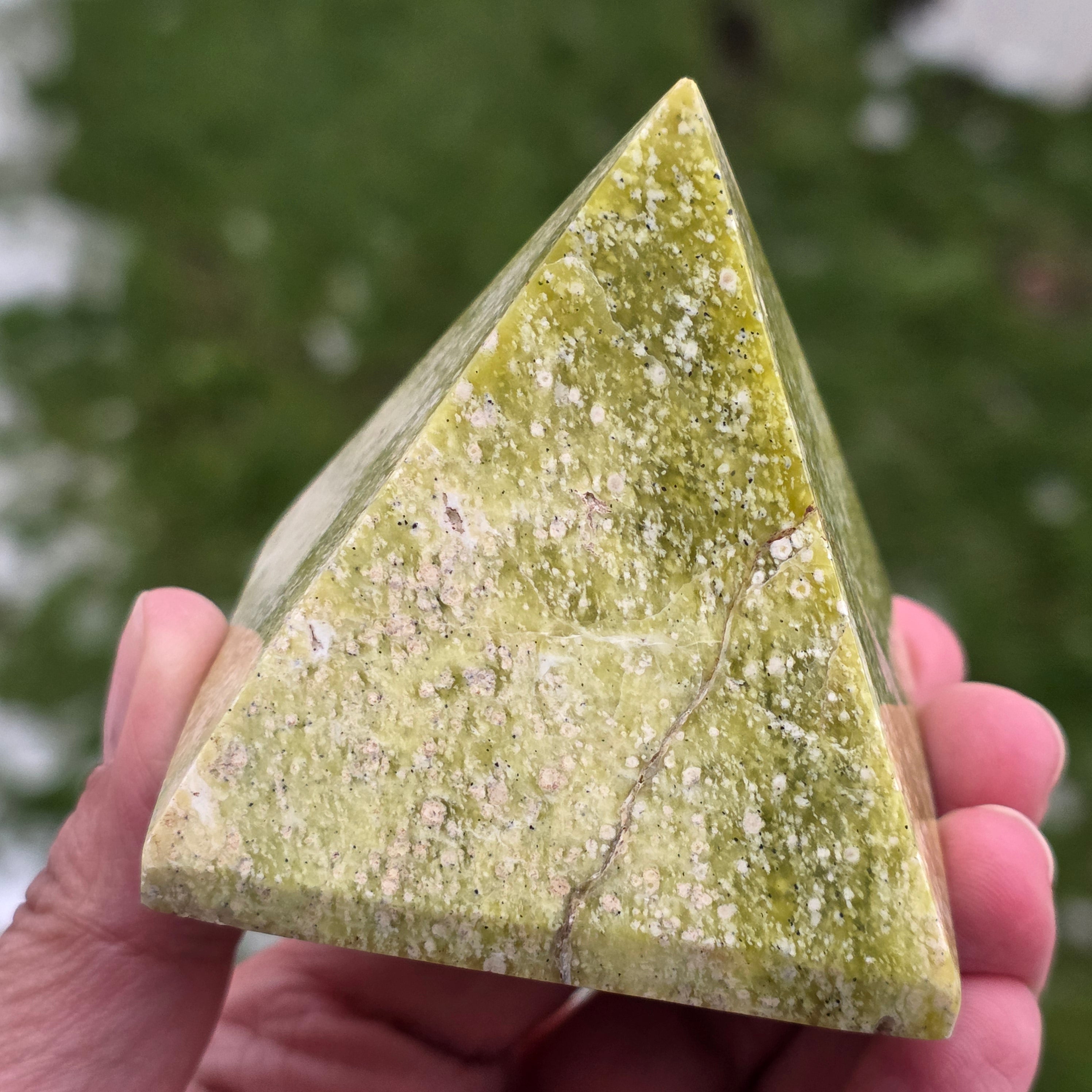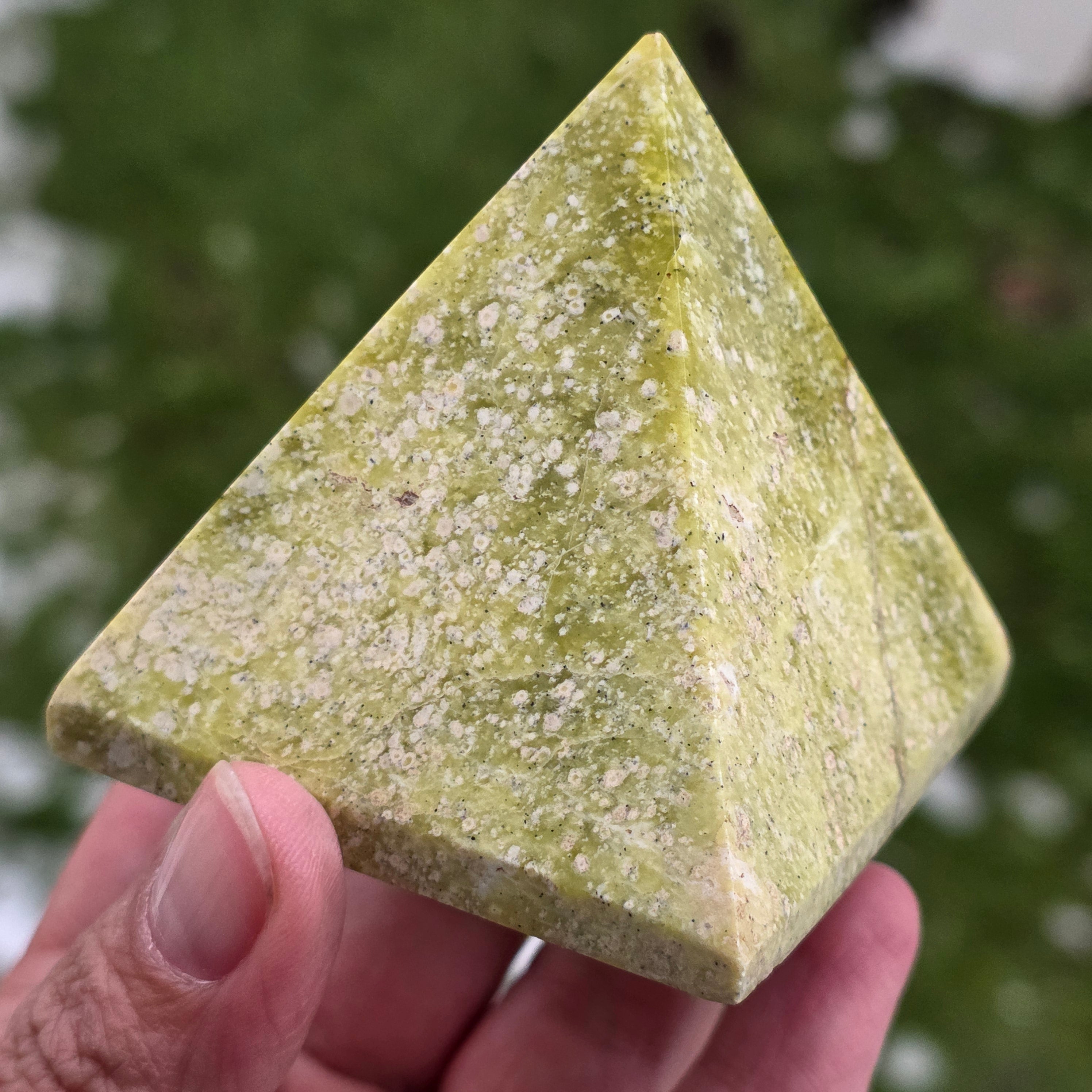 Ez a természetes sárga szerpentinit piramis egy fénylő és kiegyensúlyozó darab, amely alkalmas meditációs terekbe, irodába vagy a belső regenerálódásra szánt helyekre. A sárga szerpentinit az energia újraélesztésével, a szellemi tisztasággal és az érzelmi egyensúly folyamatainak támogatásával társul. A piramis forma segít az energia koncentrálásában és stabilizálásában, ezzel a darabot finom támogatási ponttá alakítva a fókusz, az összhang és a újracsatlakozás számára.