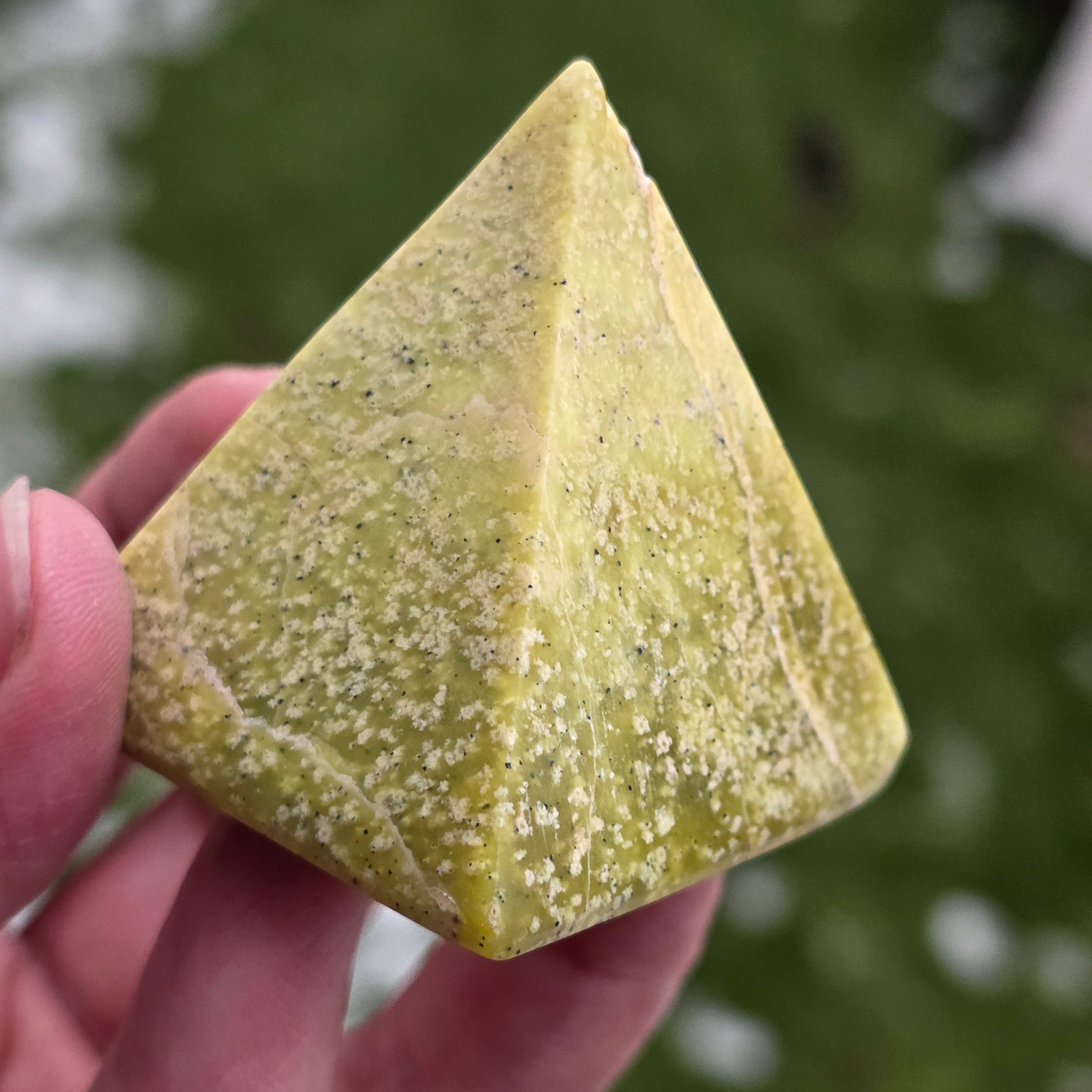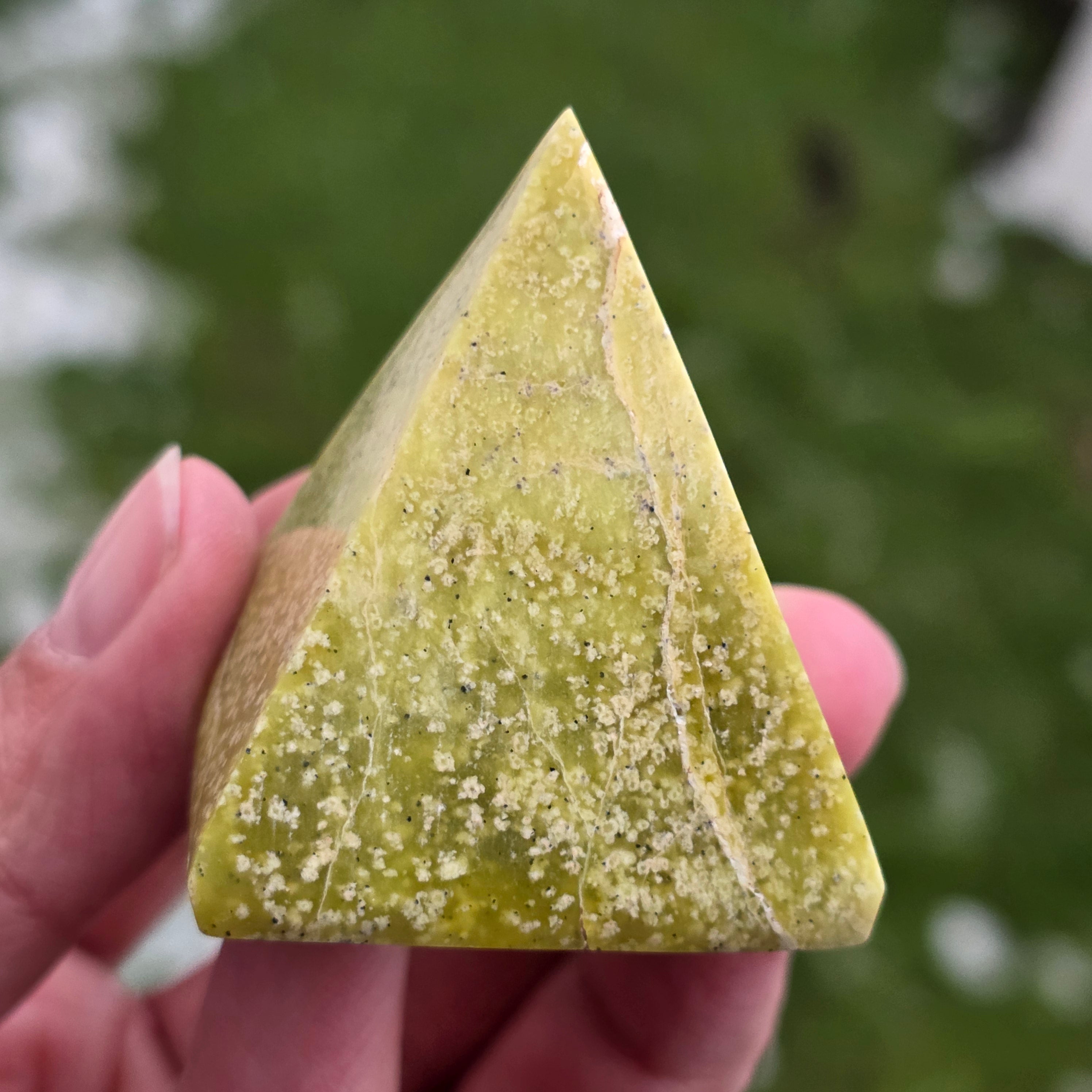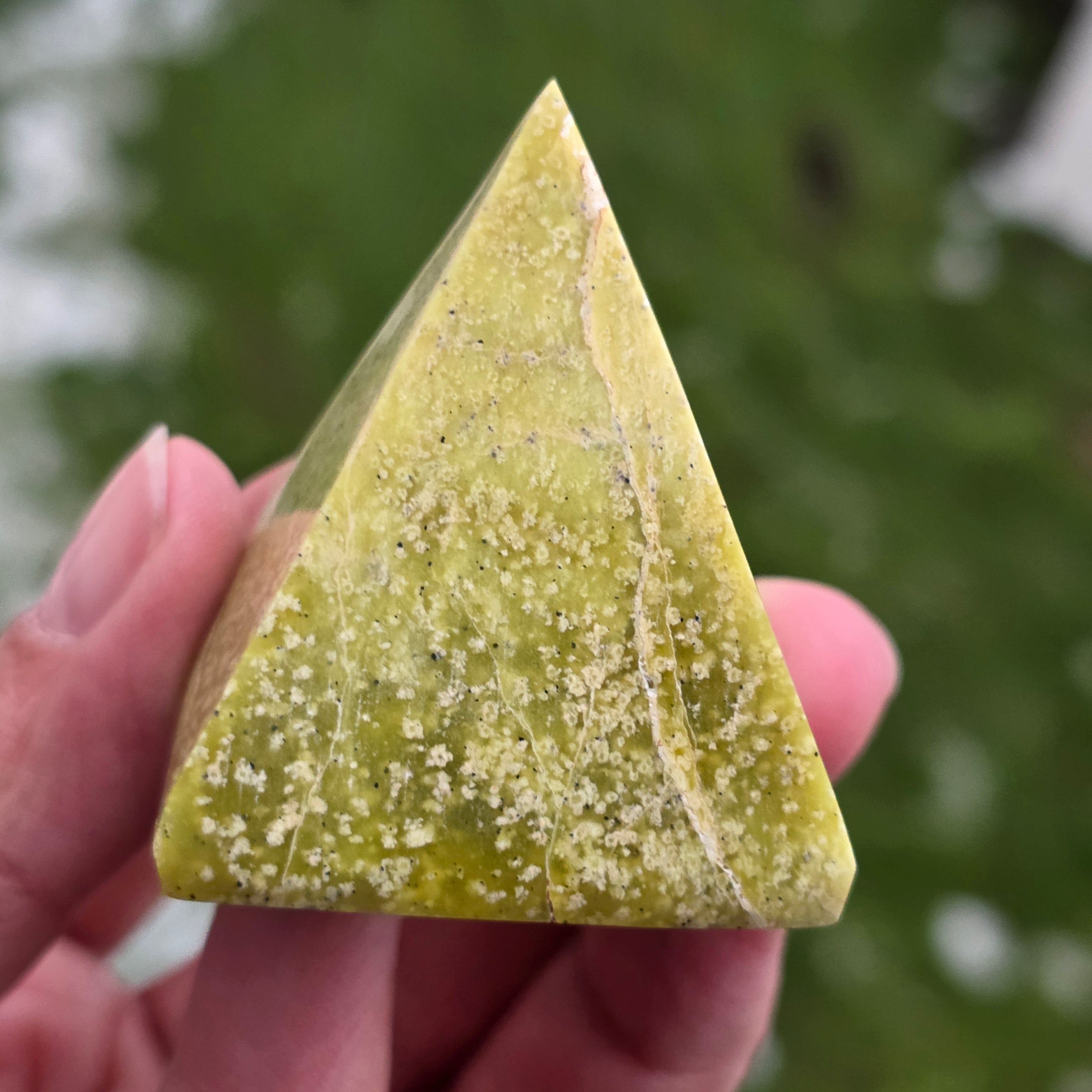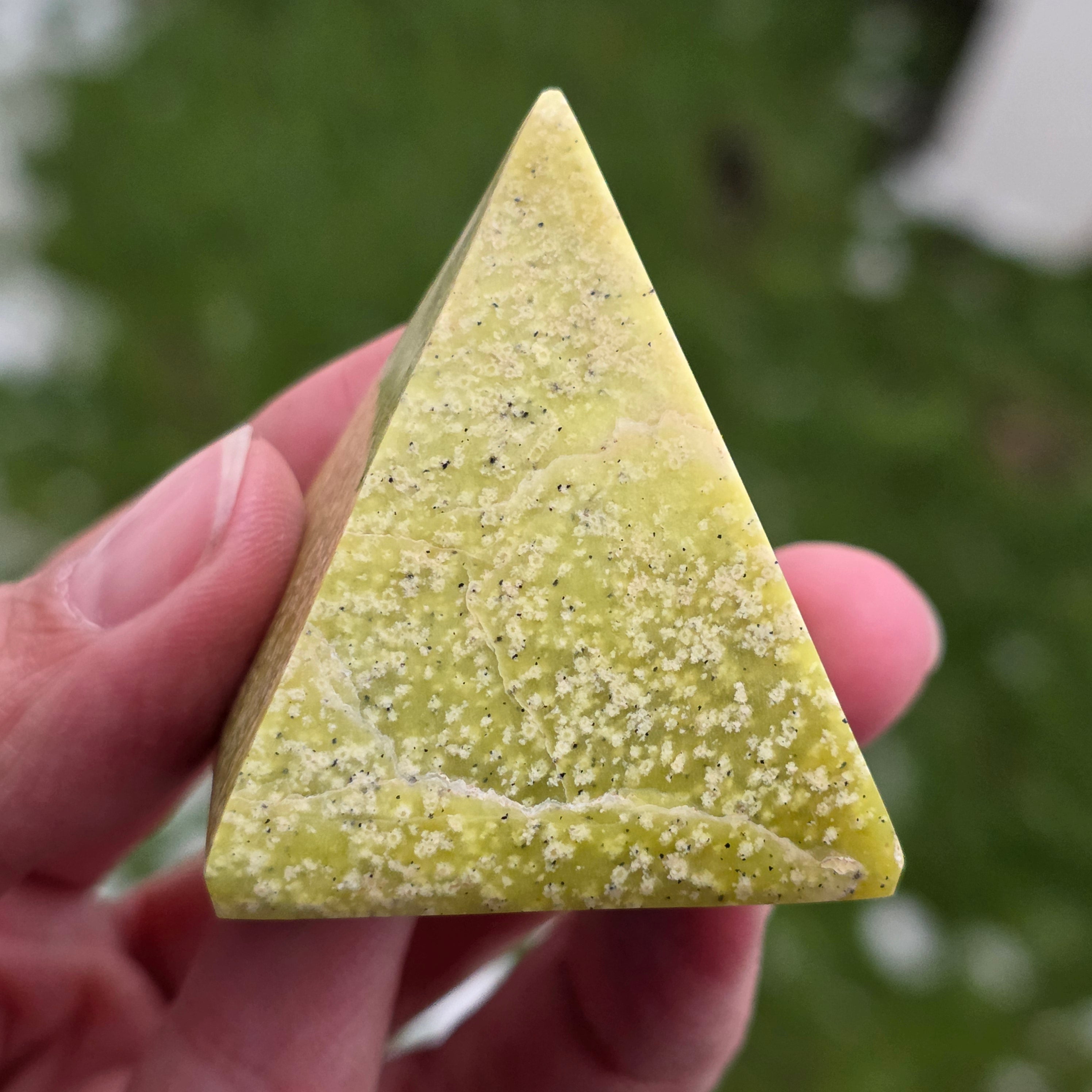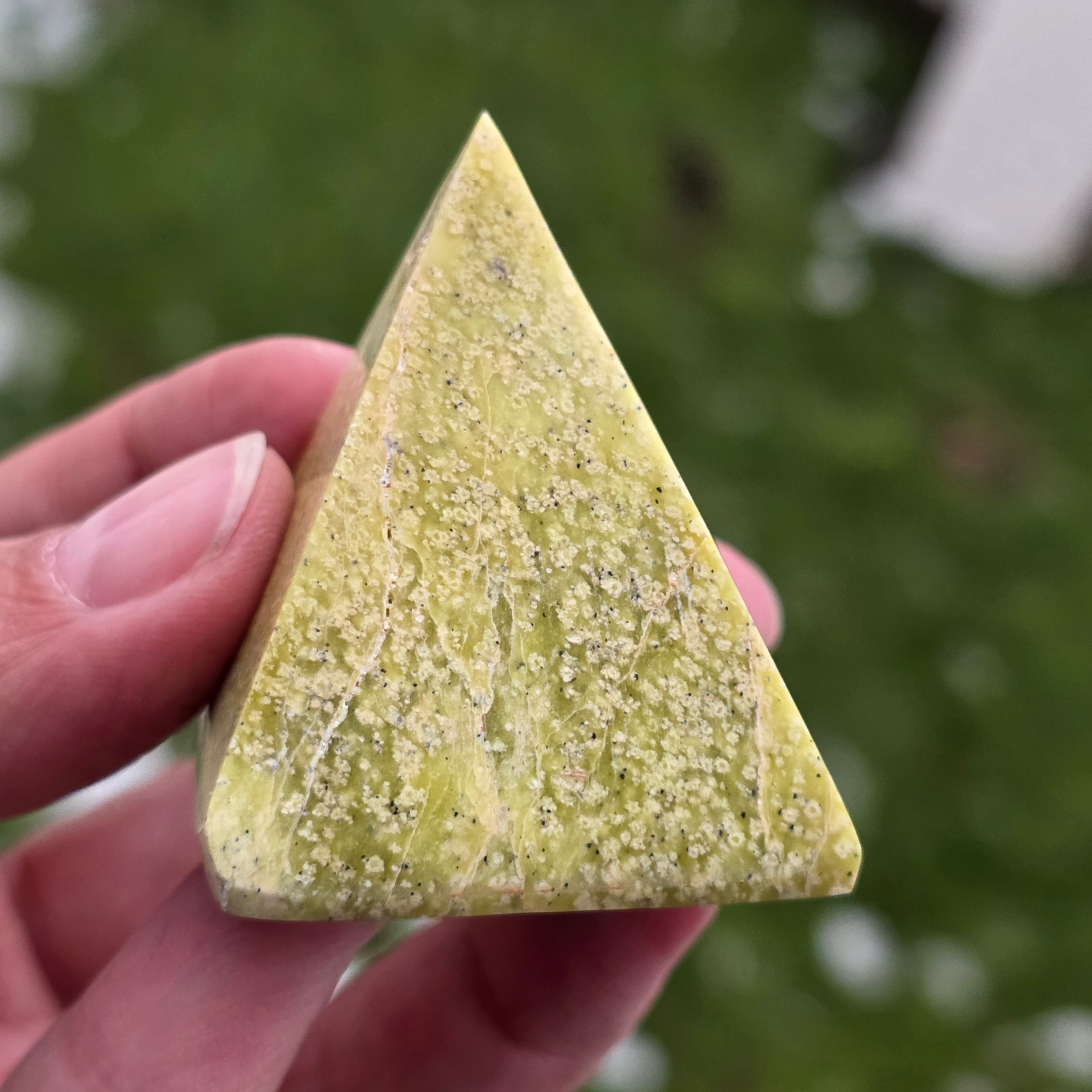 Ez a természetes sárga szerpentinből készült piramis egy fényes és kiegyensúlyozó darab, alkalmas meditációs terekbe, irodába vagy belső regenerálódásra szánt helyekre. A sárga szerpentin az energia újjáélesztésével, a mentális tisztasággal és az érzelmi egyensúly támogatásával társul. A piramis forma segít az energia koncentrálásában és stabilizálásában, így ez a darab finom támogatást nyújt a fókusz, harmónia és újrakapcsolódás érdekében.