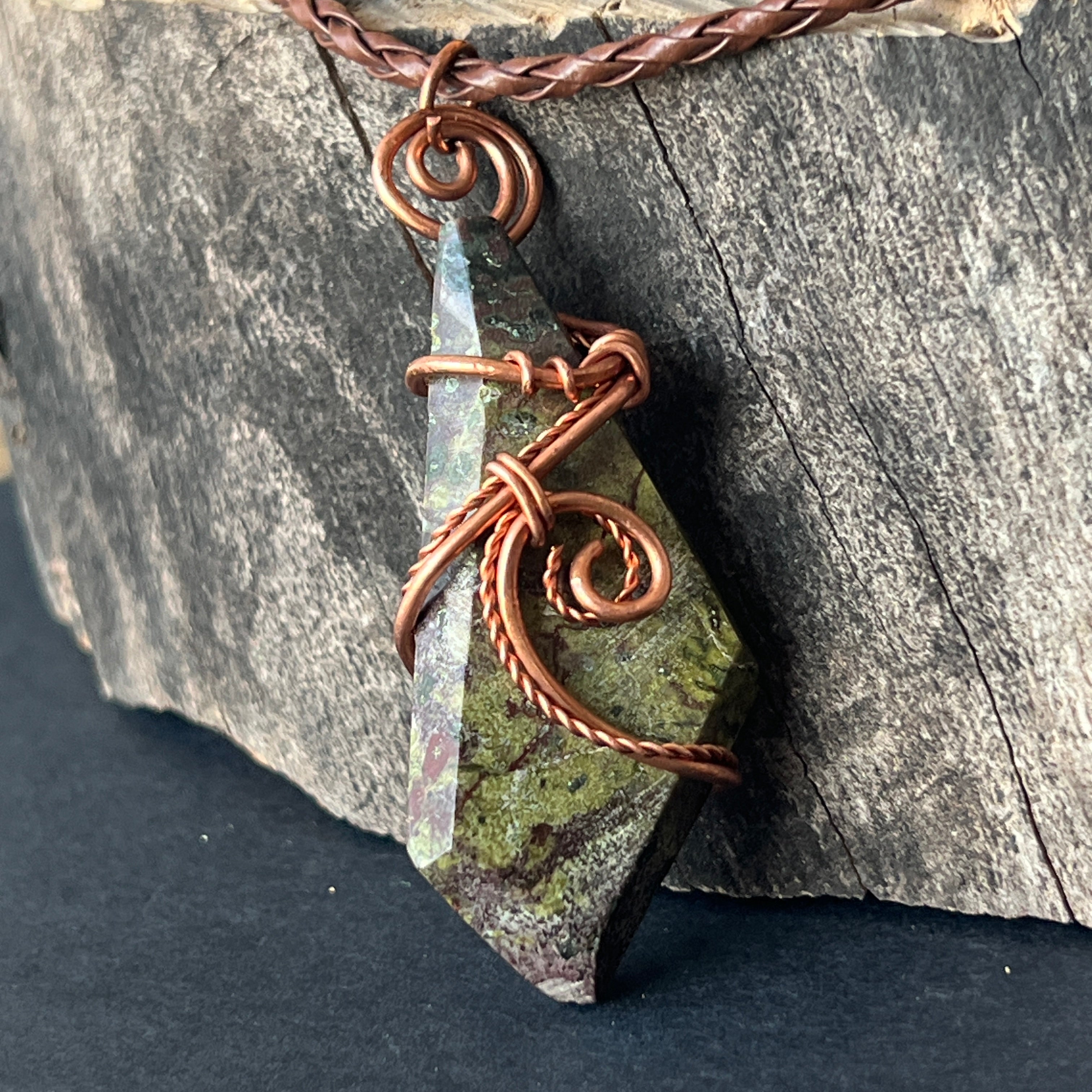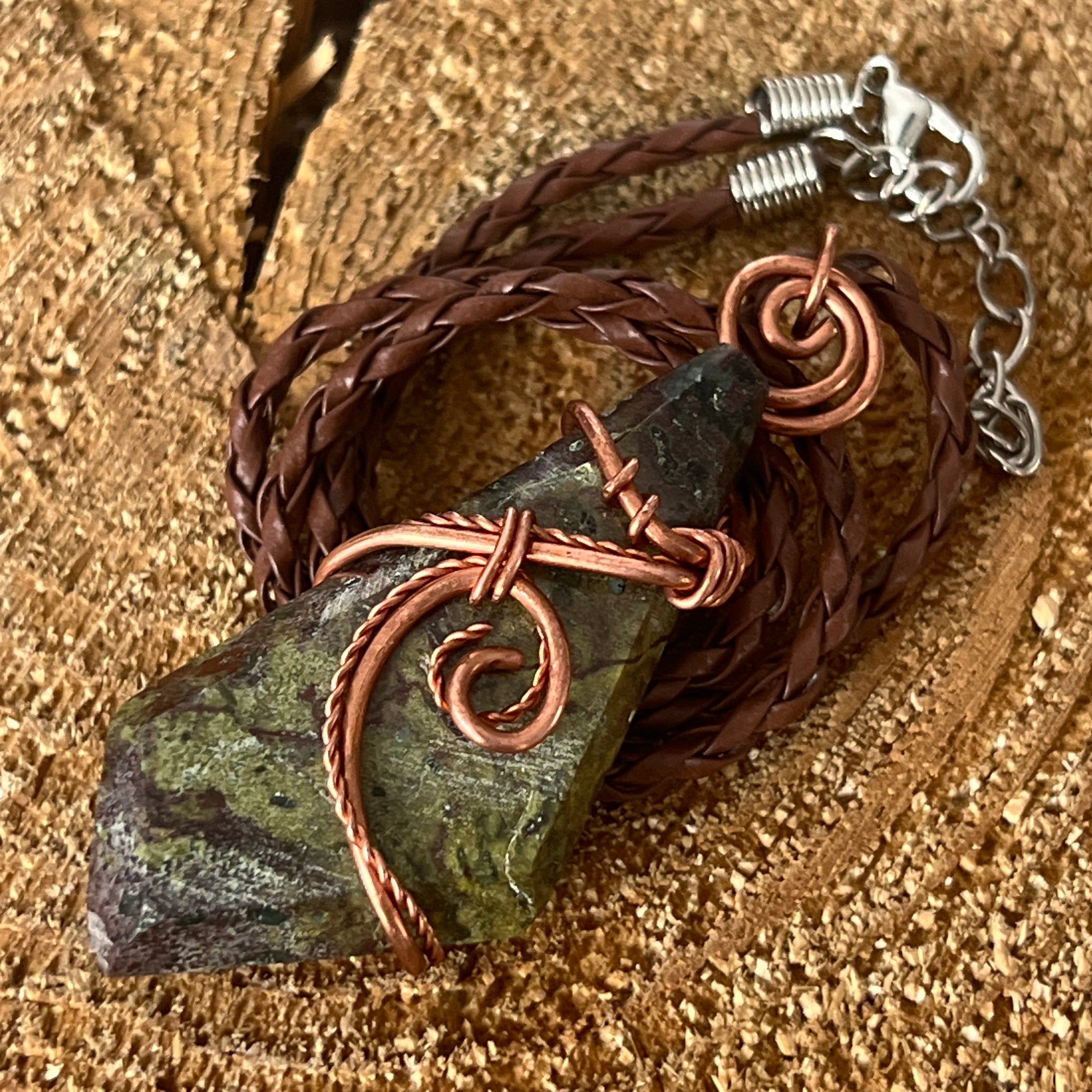 Ez az egyedi nyaklánc az afrikai nyers szépség és erő kombinációja egy látványos Sárkányvér medálon keresztül, amely ritka és lenyűgöző kő Dél-Afrikából. A polírozott kő kézzel csavart művészi rézdrót foglalattal van rögzítve, kiemelve az erőteljes földzöld és intenzív vörös kontrasztokat, mintha egy legenda lenne kifaragva a kőben.