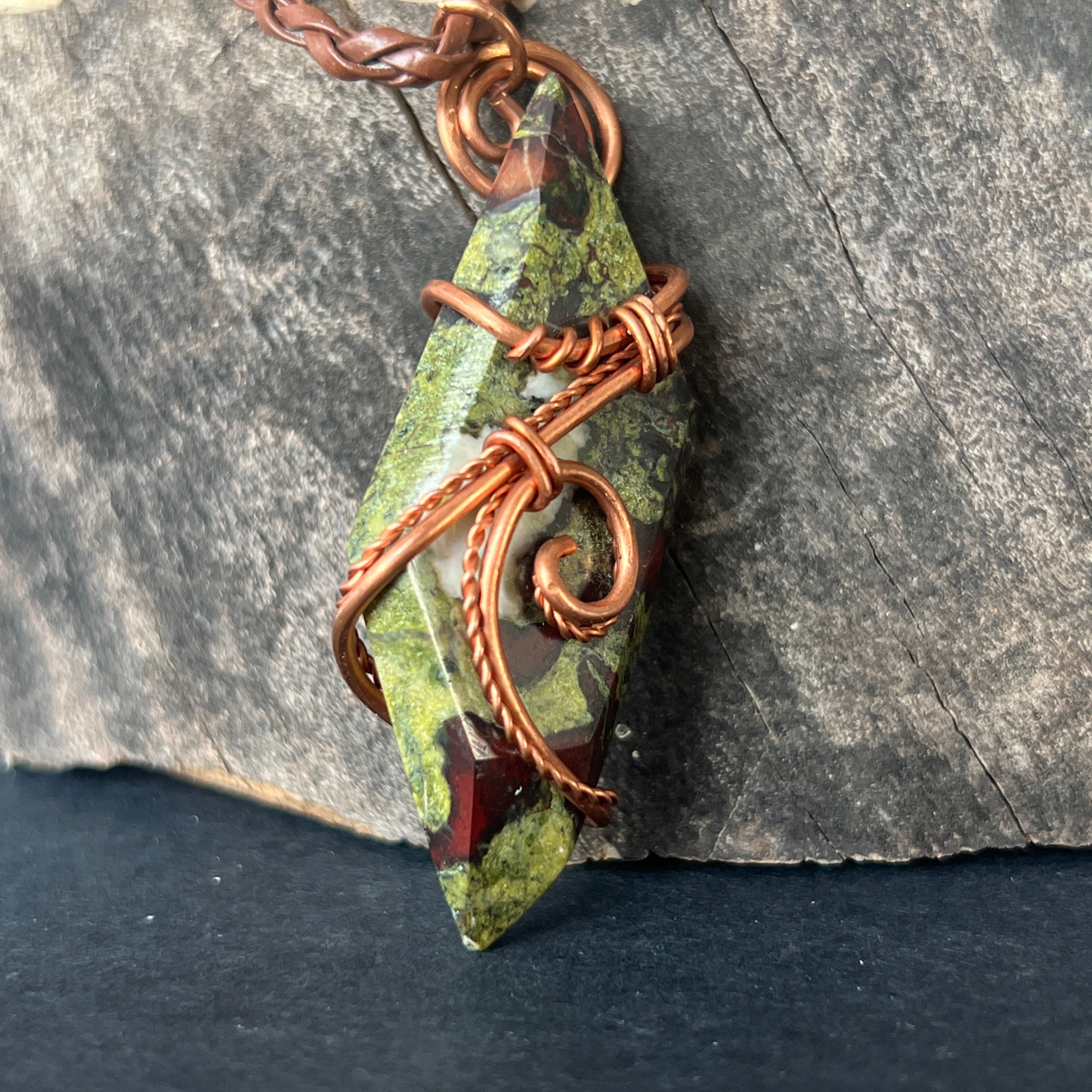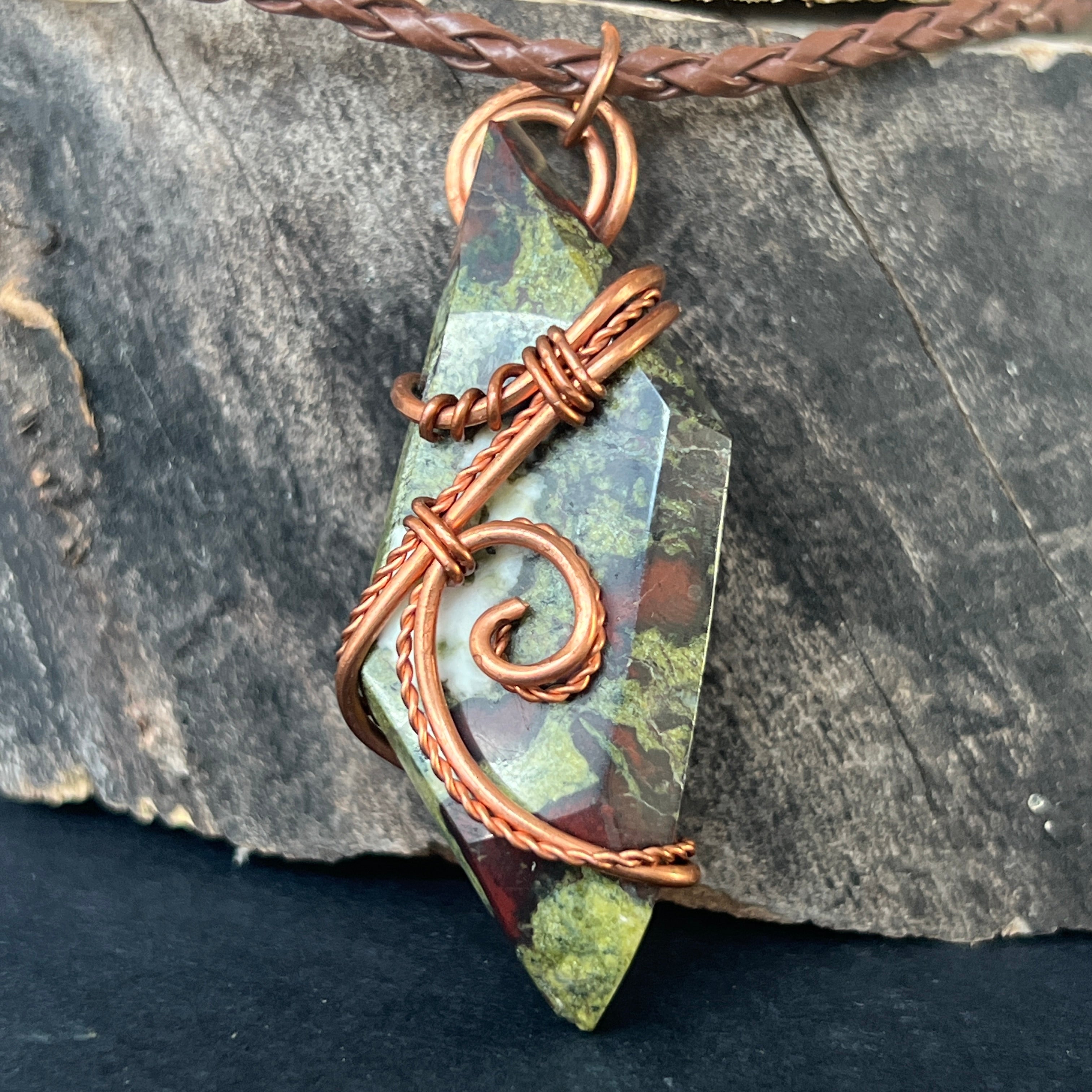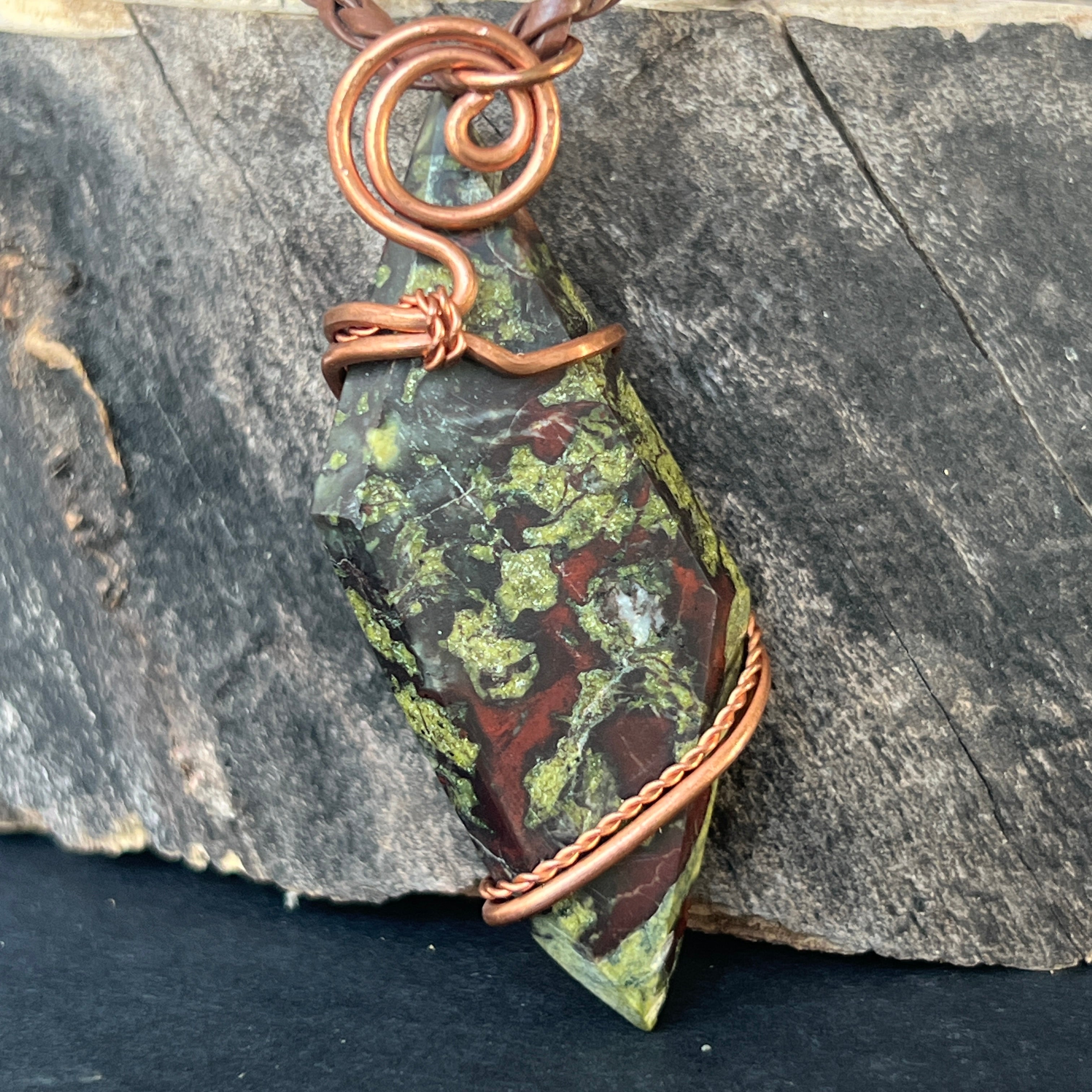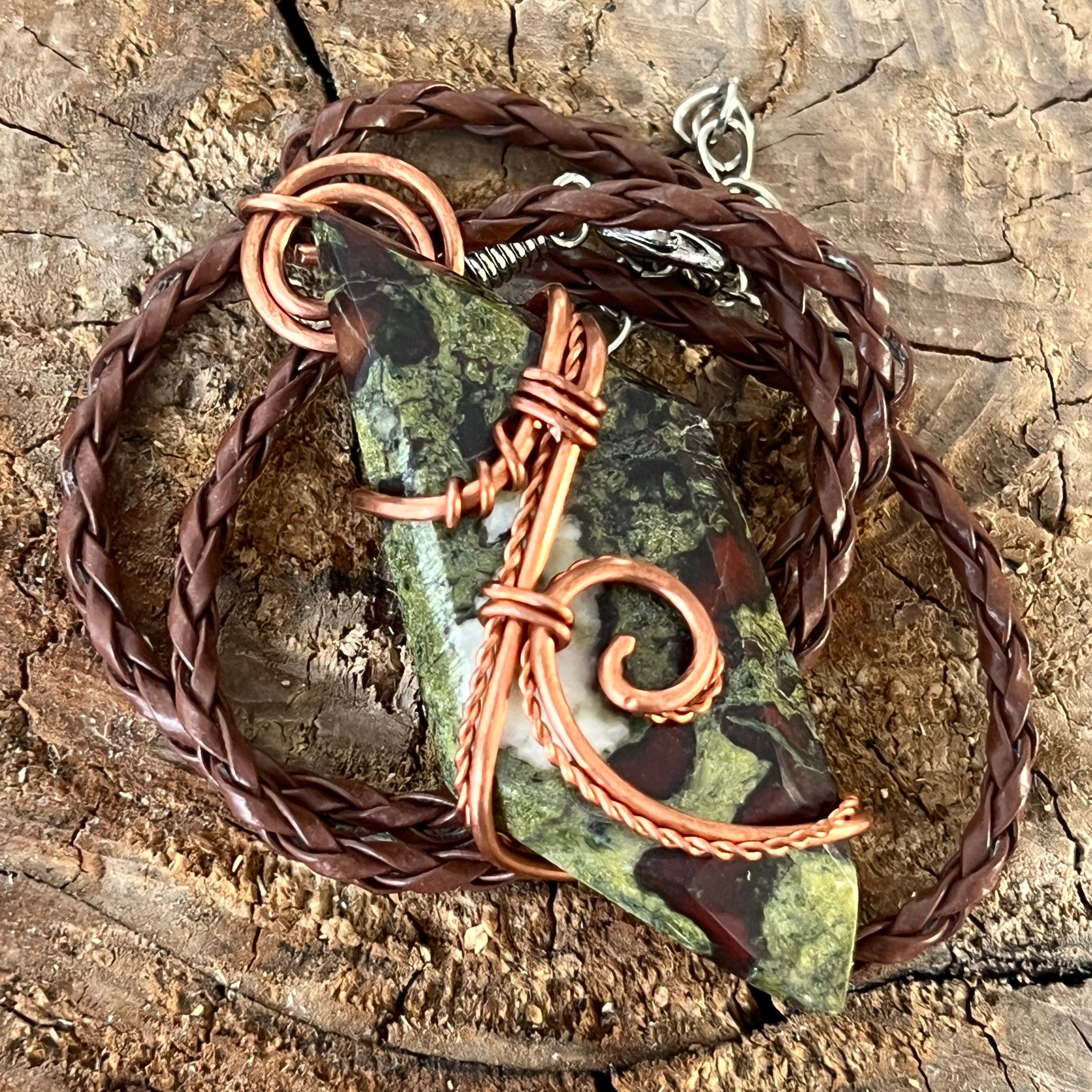 Ez az egyedi nyaklánc az afrikai nyers szépség és erő kombinációját kínálja egy látványos Sárkányvér medálon keresztül, amely egy ritka és lenyűgöző dél-afrikai kő. A polírozott kő, kézzel csavart rézdrót foglalattal rögzítve, erőteljes kontrasztokat mutatva a földes zöld és intenzív piros színek között, mintha egy legenda lenne kifaragva az ásványban.
