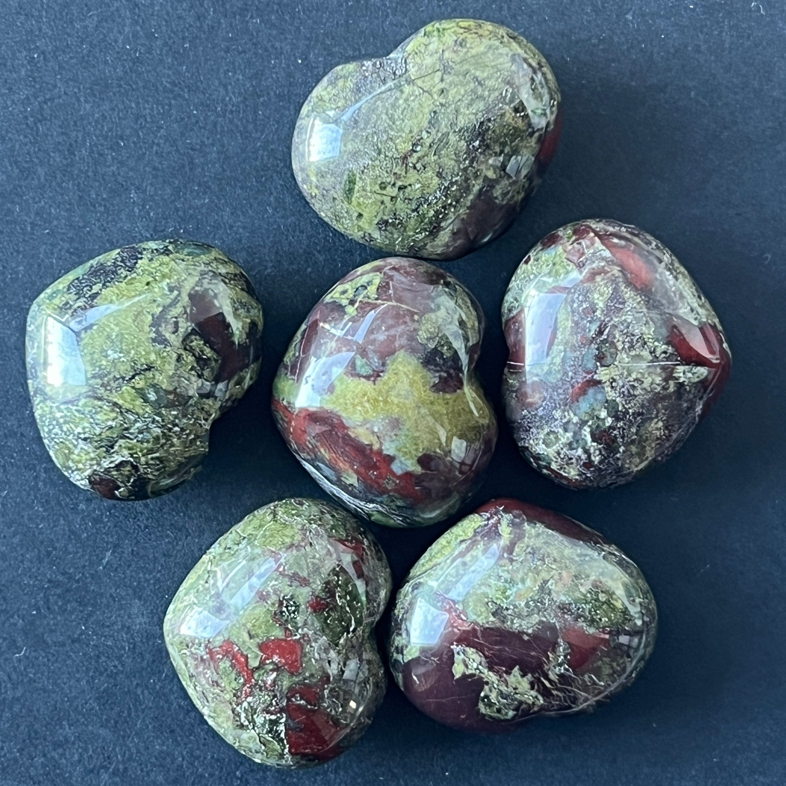 A Sárkányvér Jáspis Szív az erő és az ős bátorság köve, amely az elemi erők találkozásából született. Mély zöld színe és vörös foltjai mintha régi mesékből születtek volna, ahol a sárkányok vére adta az életet a Földnek. Minden szív egyedi darab, megismételhetetlen mintázattal, amely magában hordozza a természet élő energiájának lenyomatát.