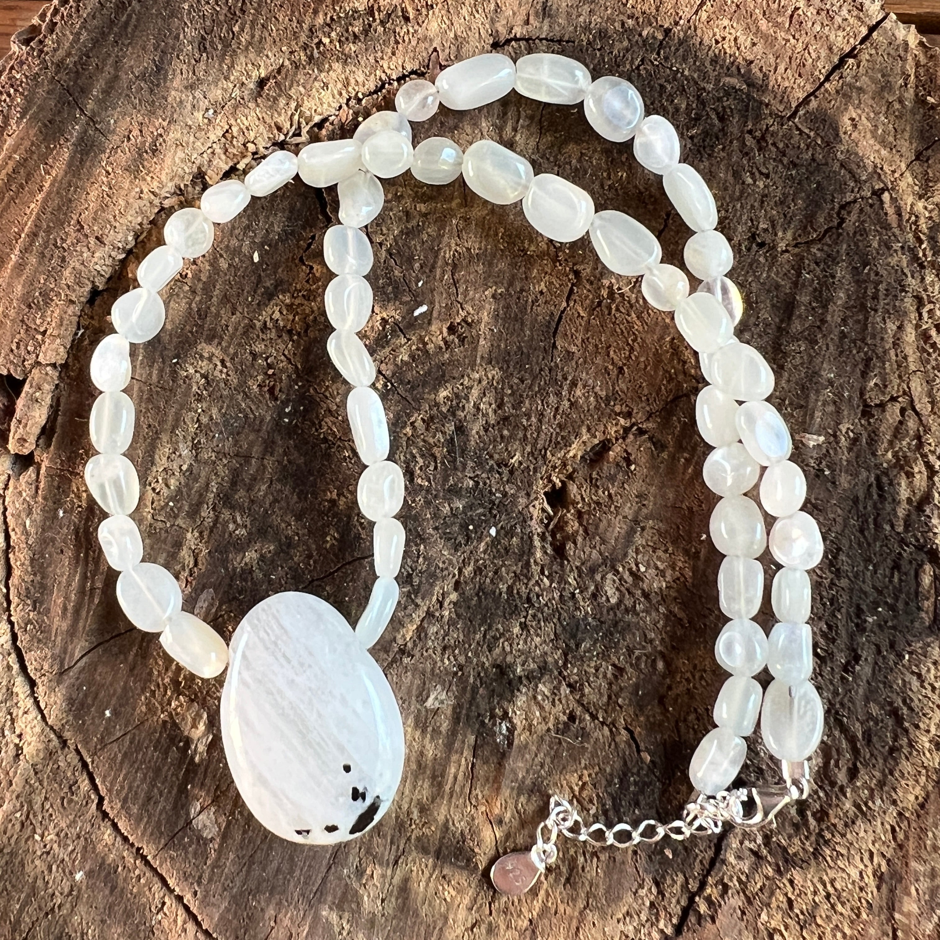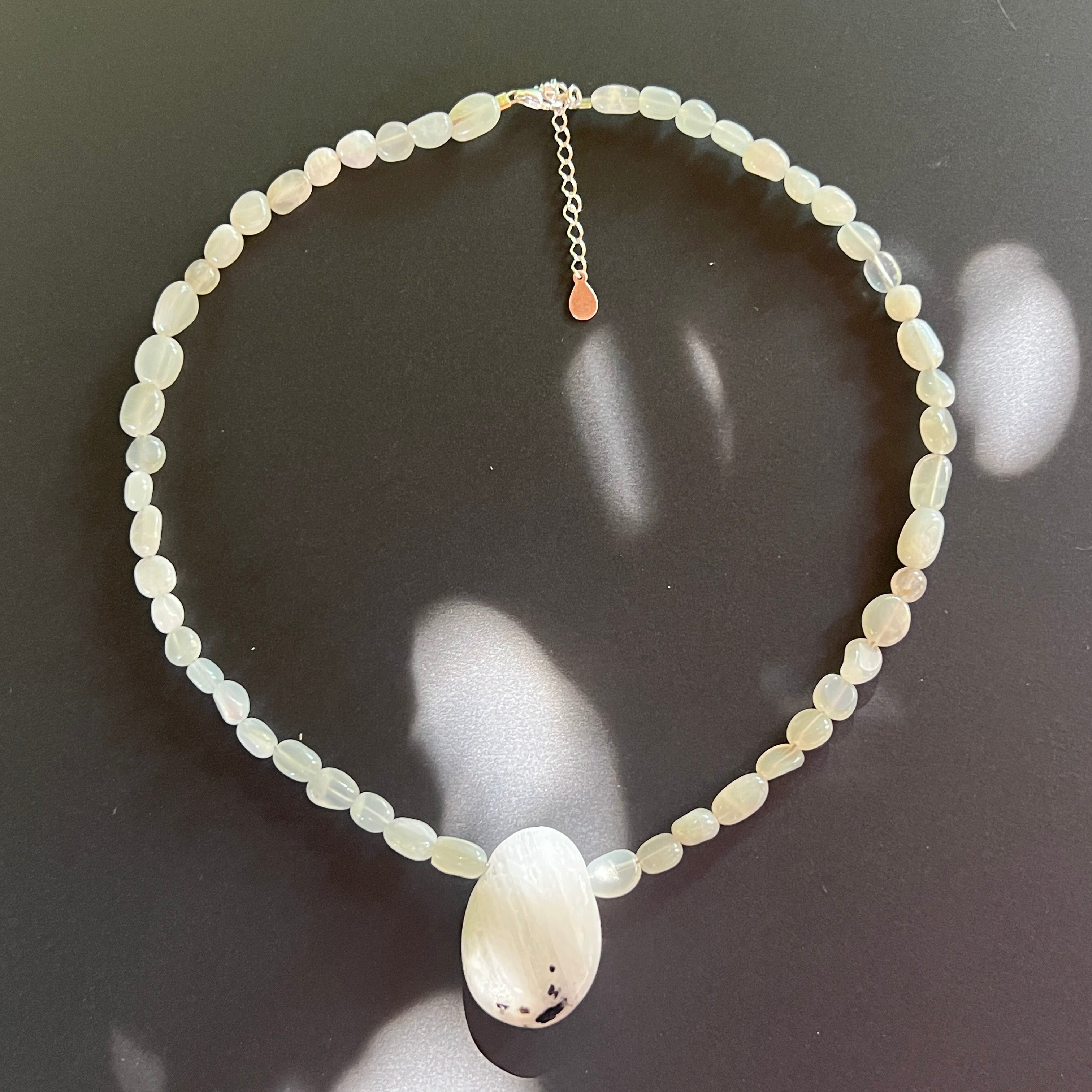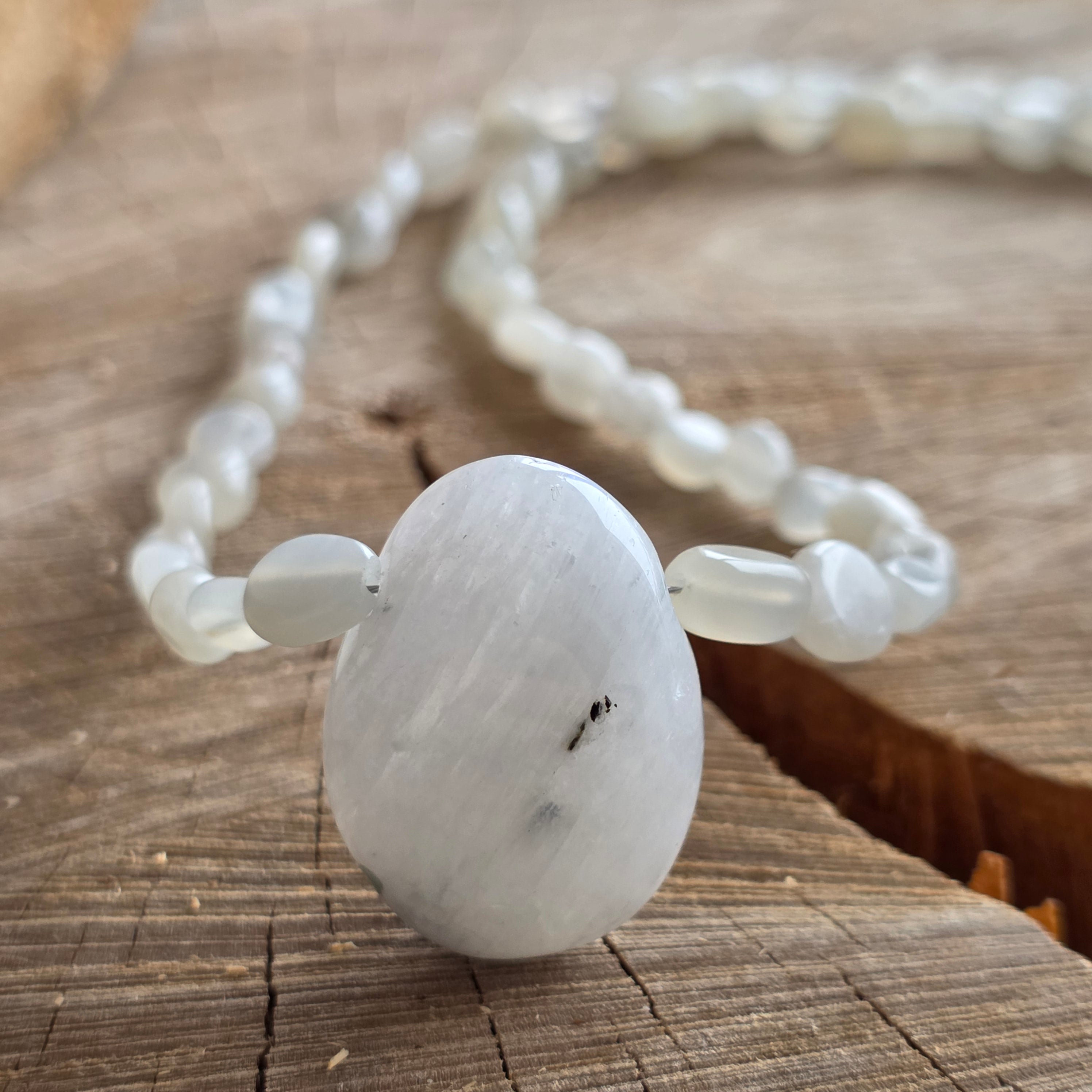 Egy nyaklánc, mint egy holdfény sugara, ami a bőrre hullik – eteri, nőies és mélyen mágneses. A sima holdkövekből készült gyöngyök, 6 és 8 mm közötti méretben, tejfehér árnyalatokban és finom kékes visszfényekben pulzálnak, mint egy belső fény, amelyet nem látunk, de érzünk.