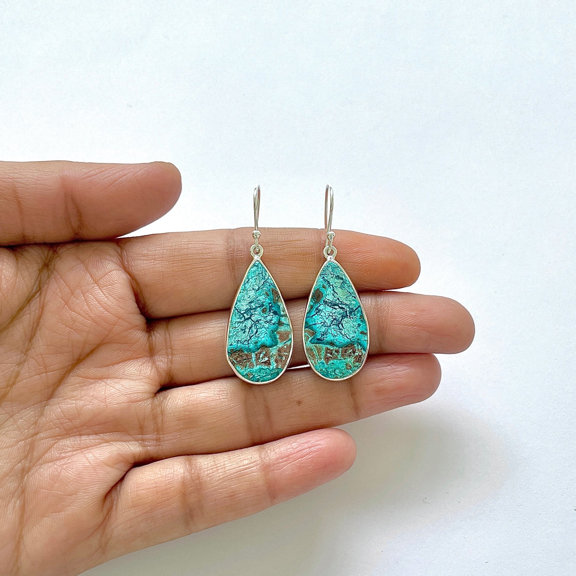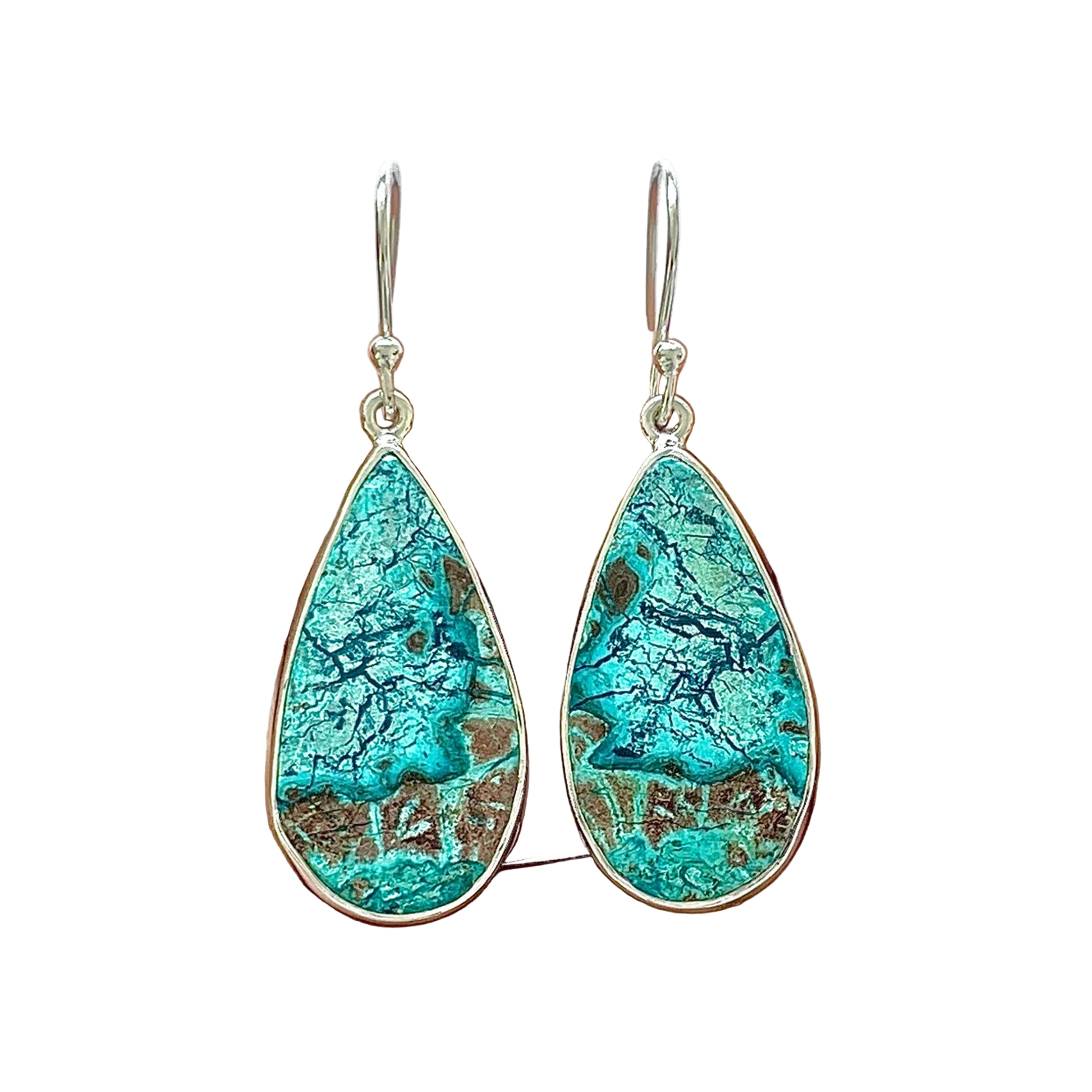 Ezek az egyedi shattuckit fülbevalók az óceán mélyére repítenek, ahol az intenzív kék összeolvad a türkiz árnyalatokkal és a finom földes erezetekkel. A kő élénk és organikus textúrával rendelkezik, mintha magában őrizné a víz titkát és a mélység nyugalmát.