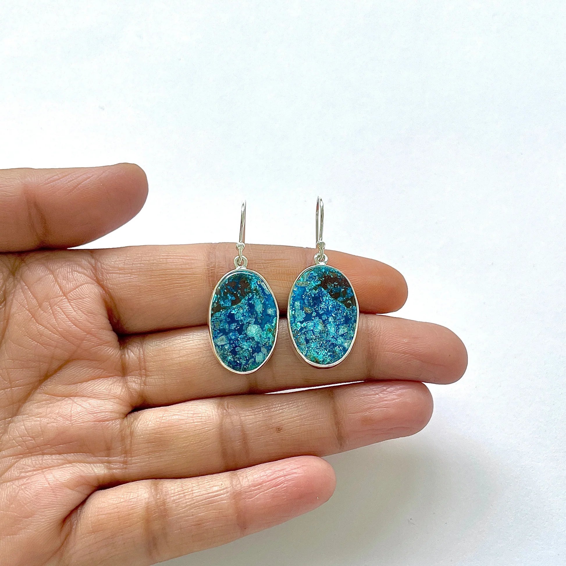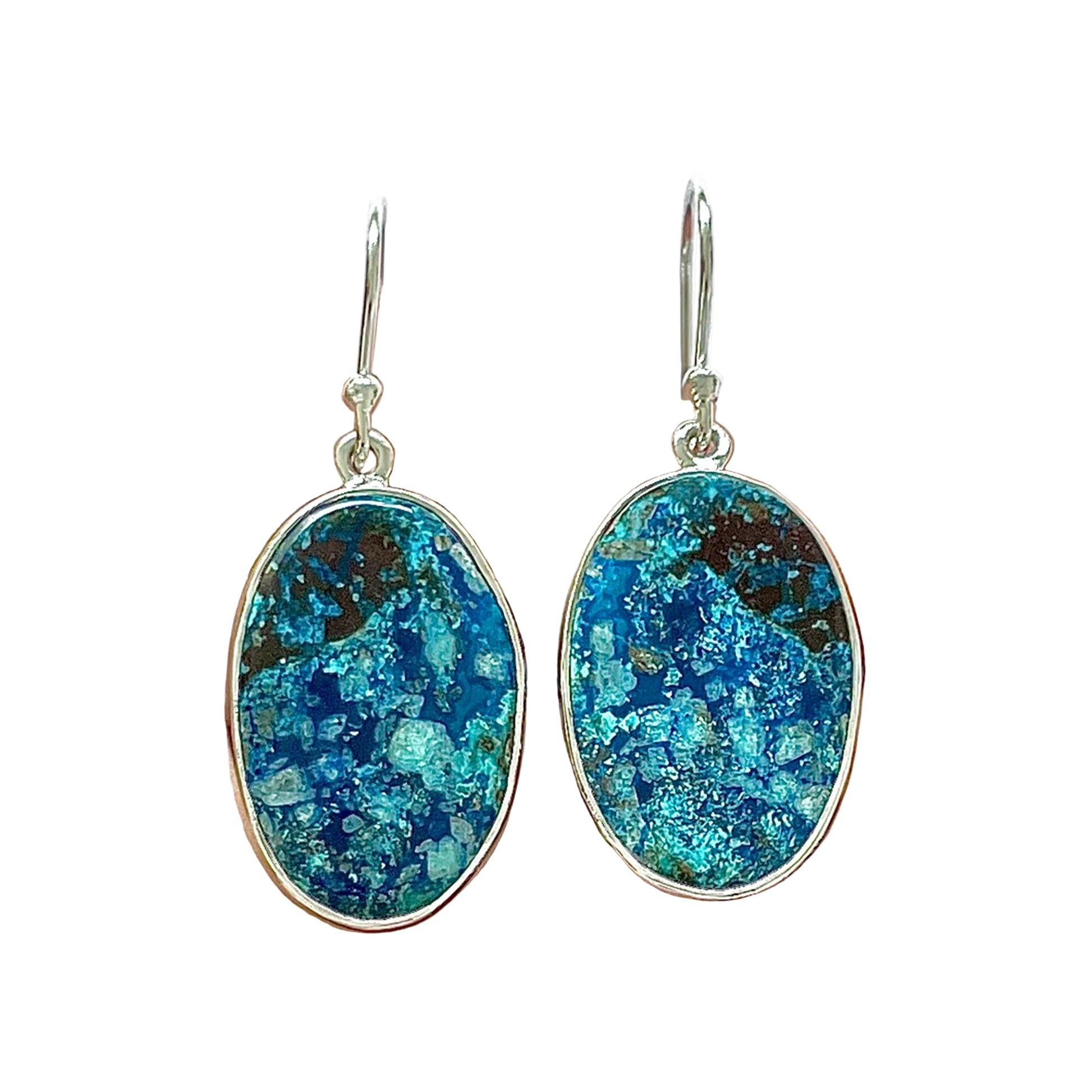 Ezek az egyedi shattuckite fülbevalók az óceán mélyére repítenek, ahol az intenzív kék összeolvad a türkiz árnyalatokkal és finom földes erezettel. A kő élénk, organikus textúrája mintha őrizné a vizek titkát és a mélység nyugalmát.
