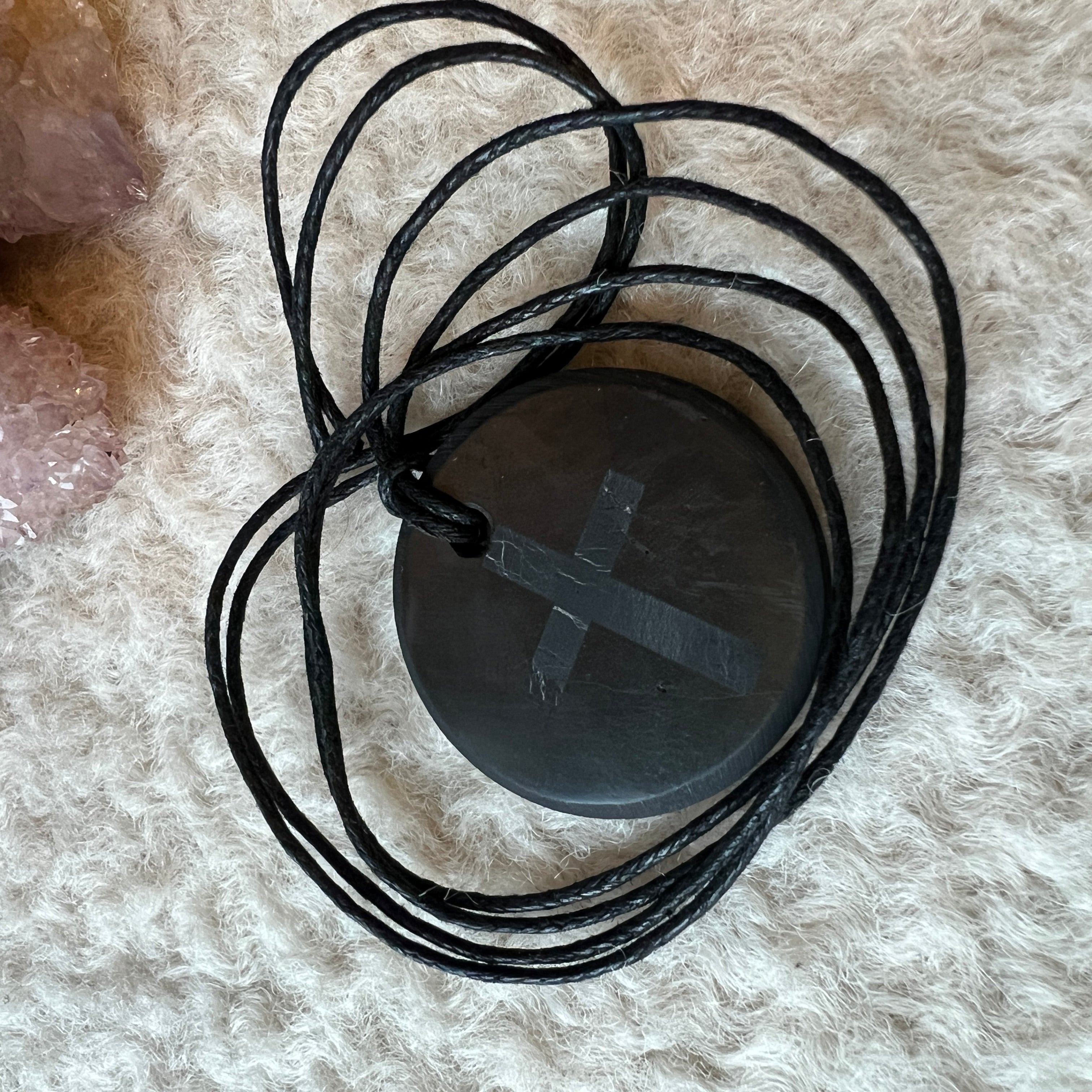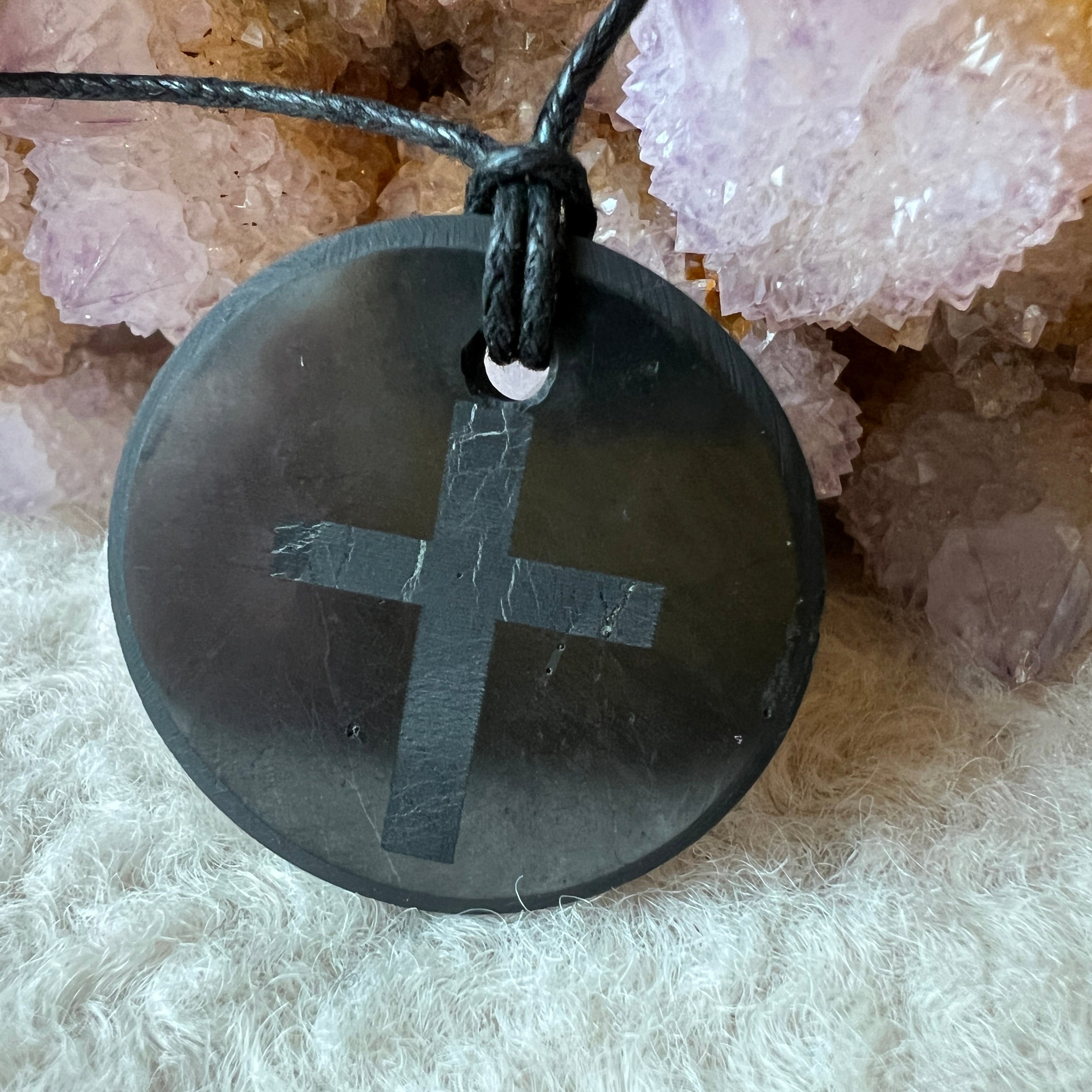 Shungit keresztmedál zsinórral, mérete: 3 x 3 cm.