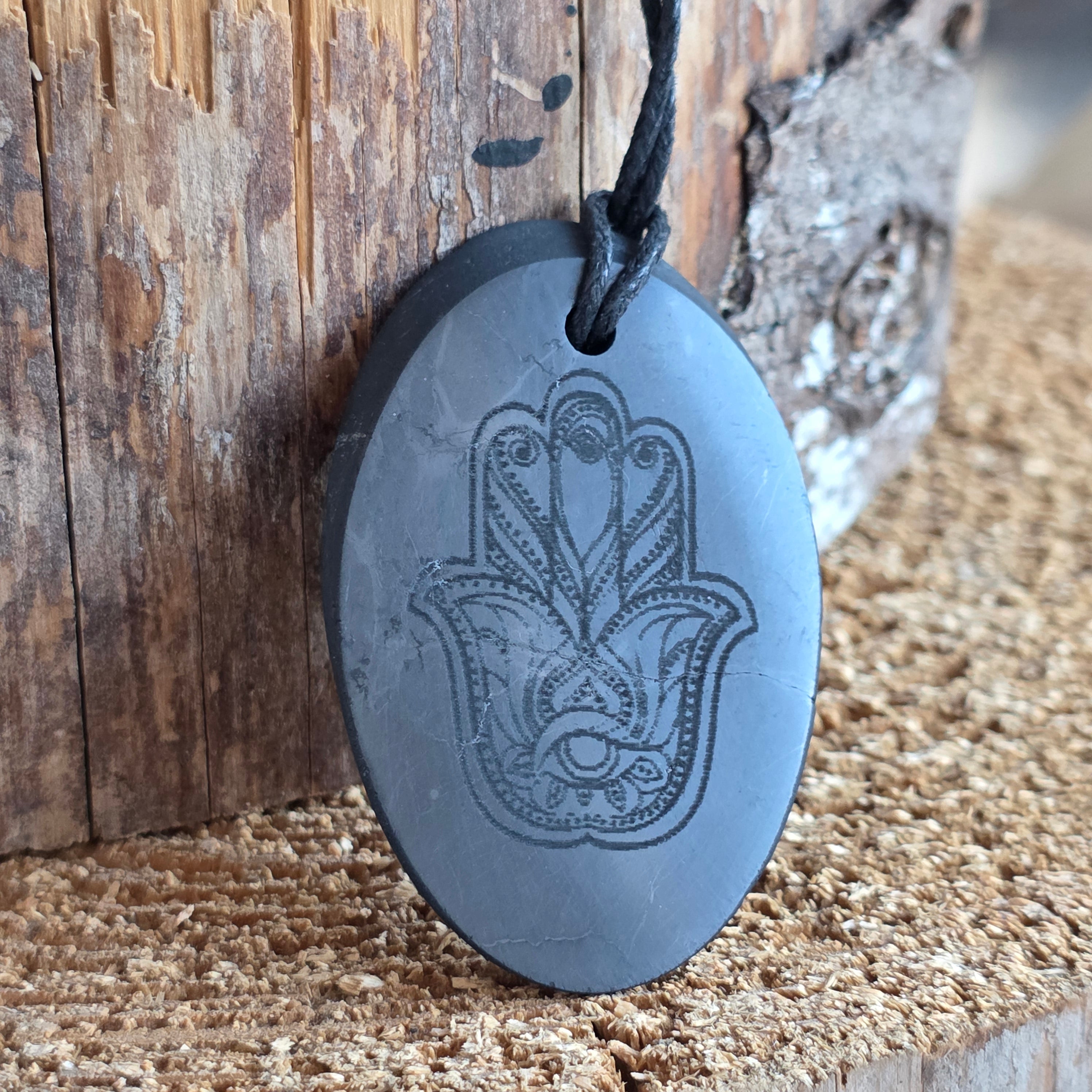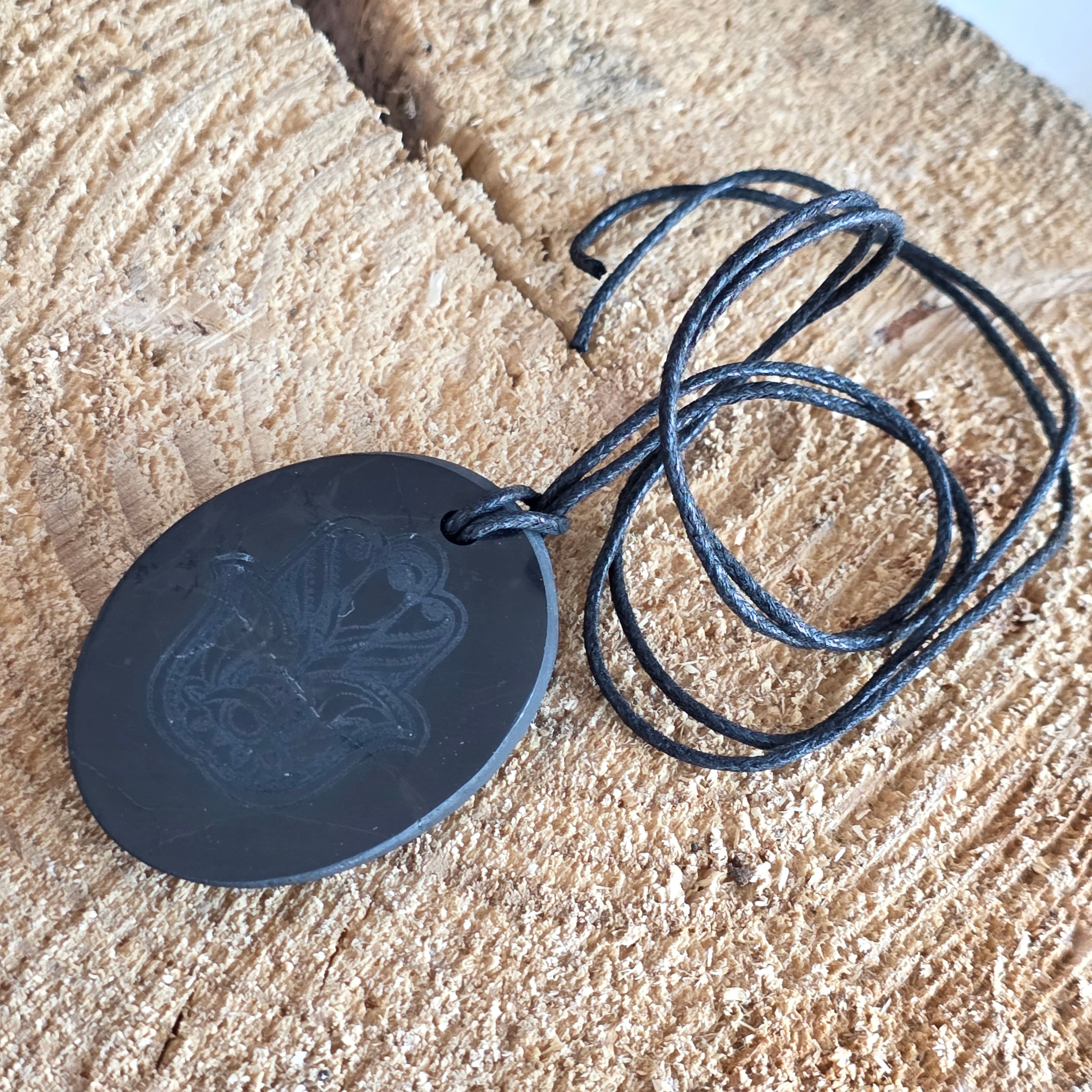 Viseld ezt a Hamsa shungit medált közel a szívedhez, hogy jelenben maradj, védve energiádat, és nap mint nap emlékeztetve arra, hogy az isteni erő csendesen és félelem nélkül áramlik benned.