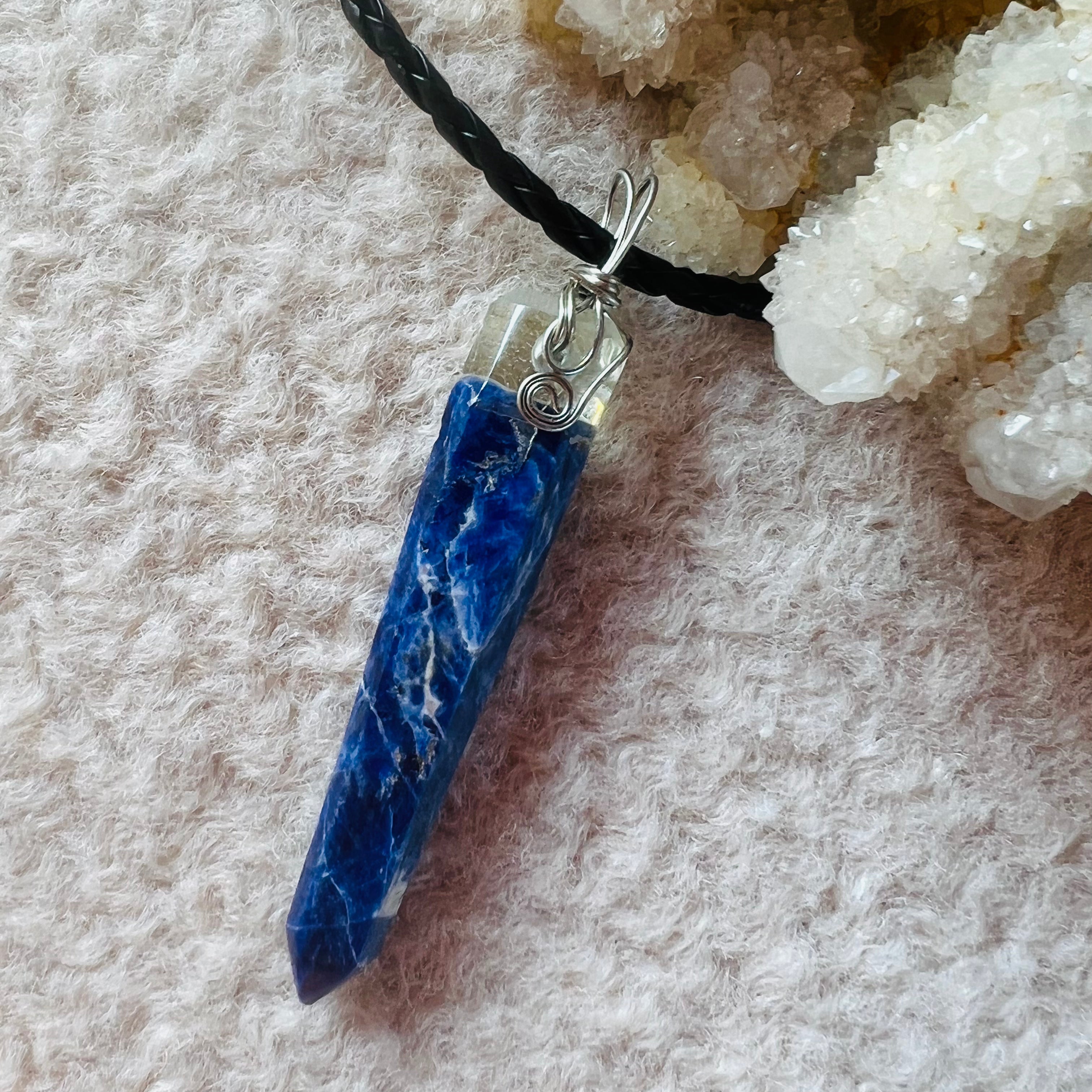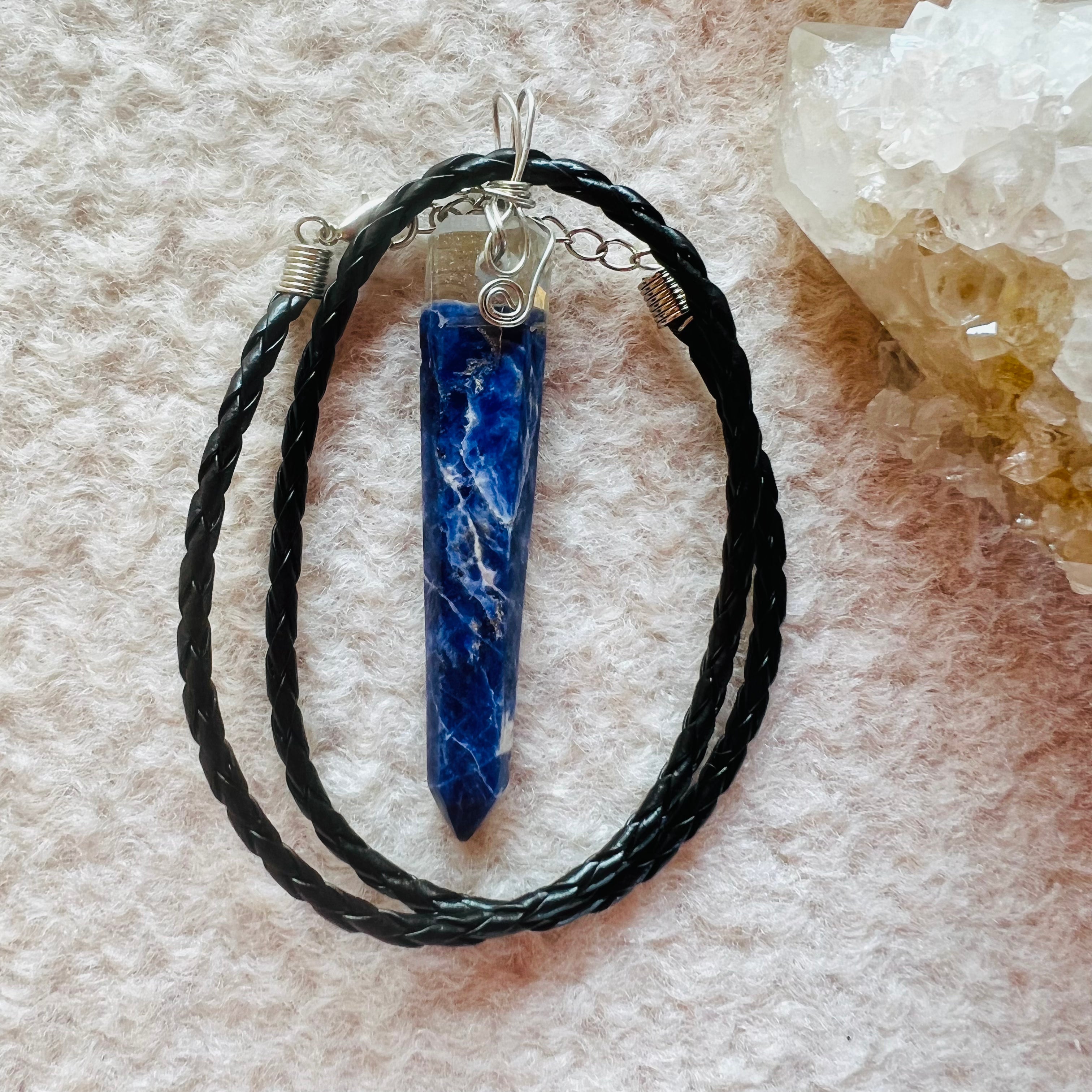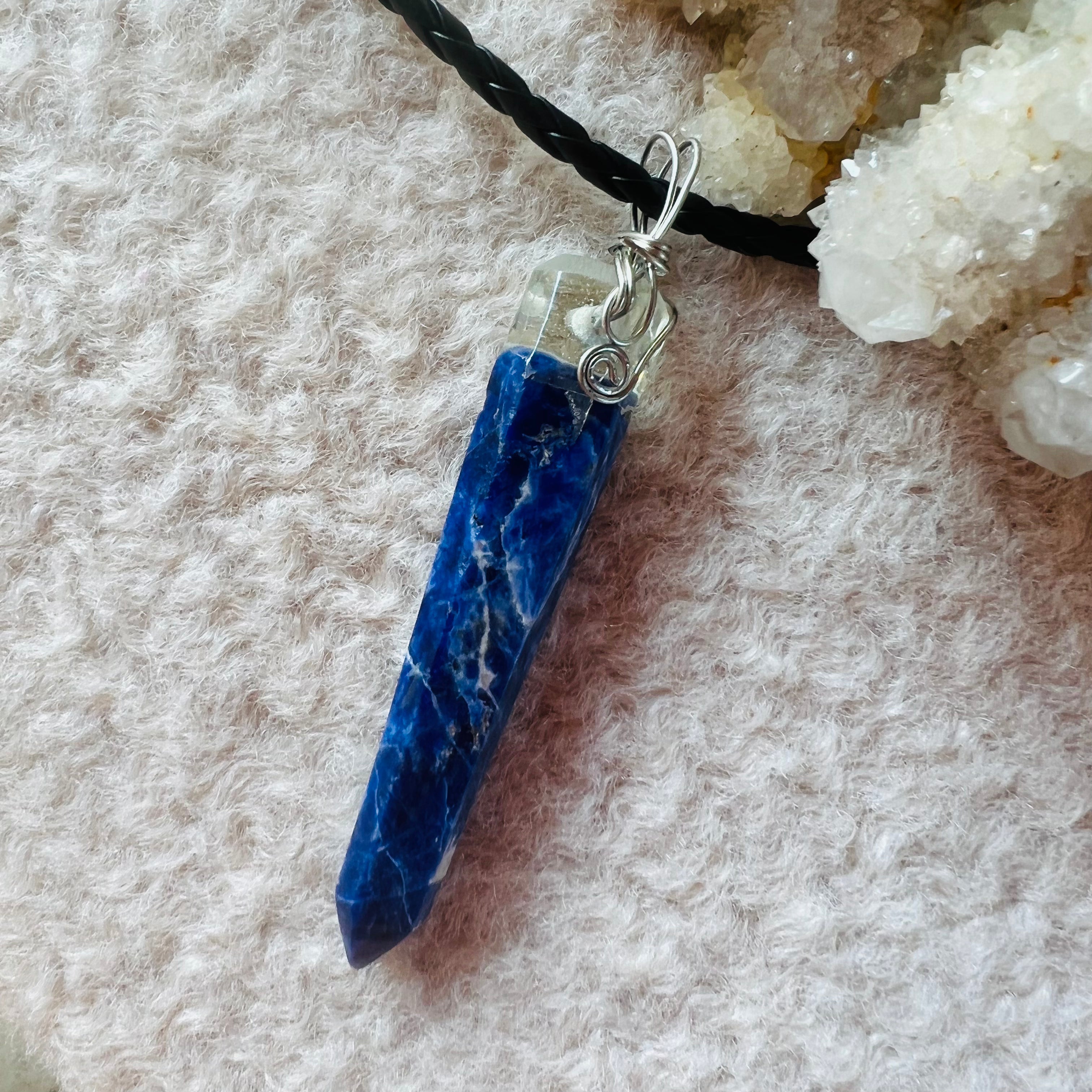 Sodalit medálos nyaklánc ezüst dróttal, fonott fekete zsinór, kézzel készített.