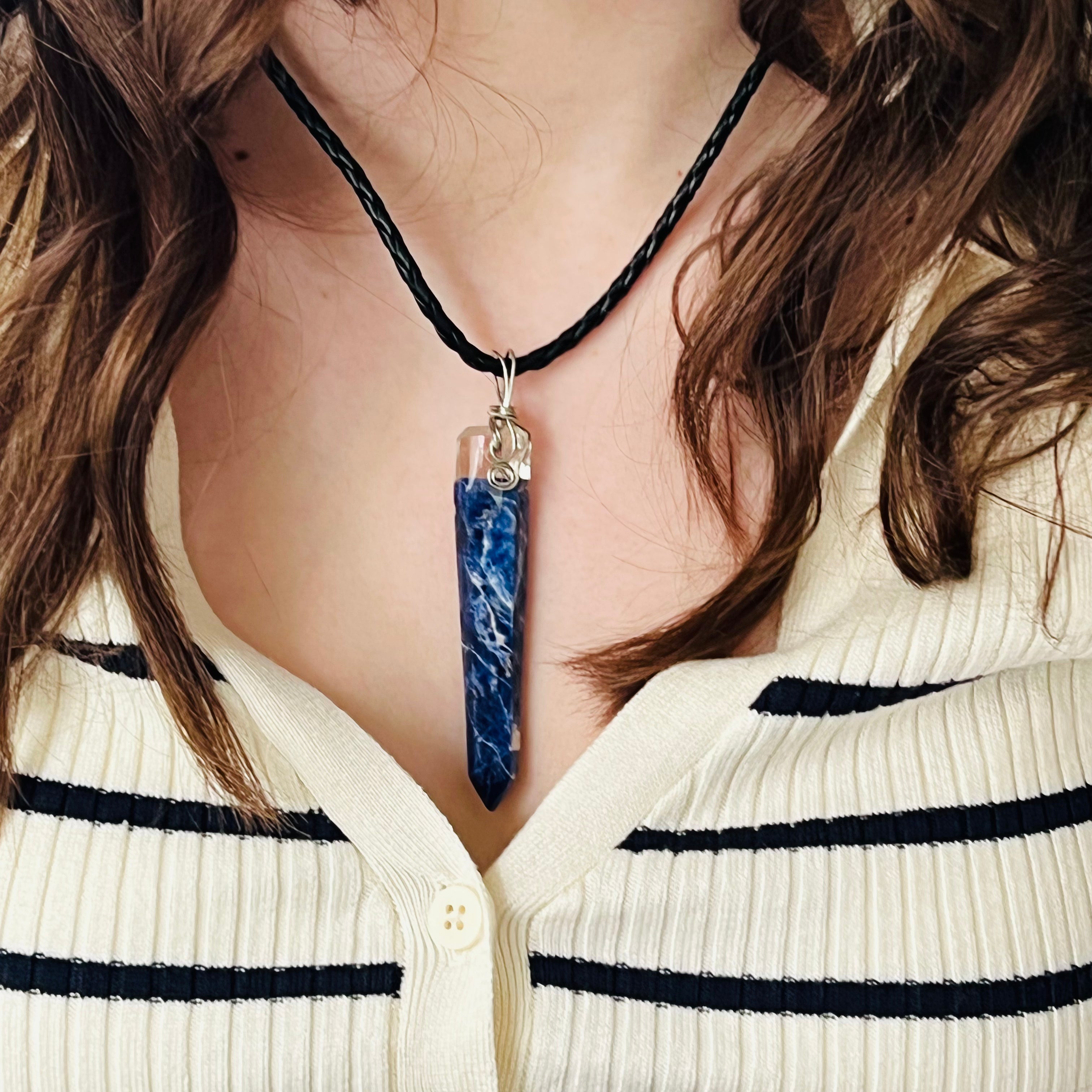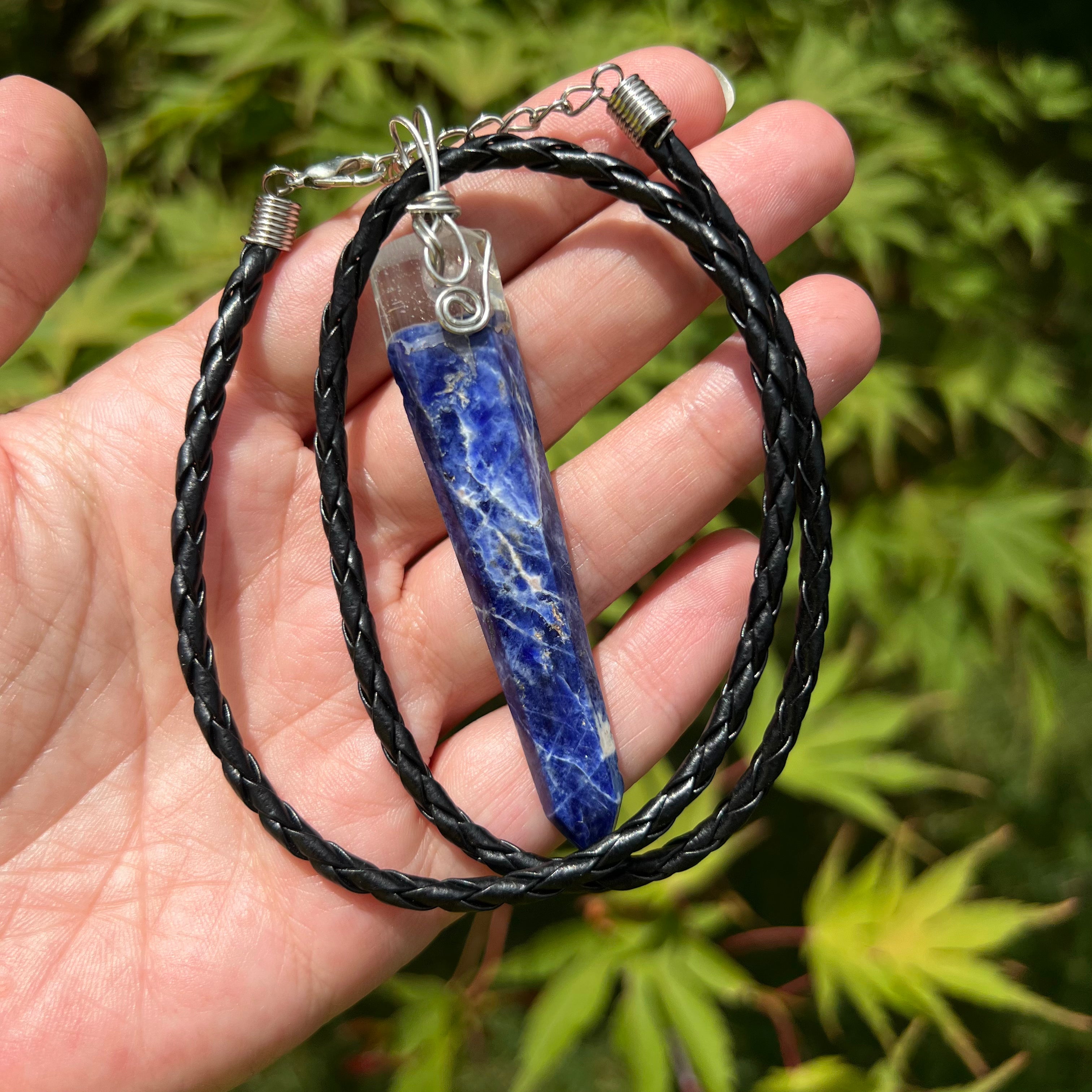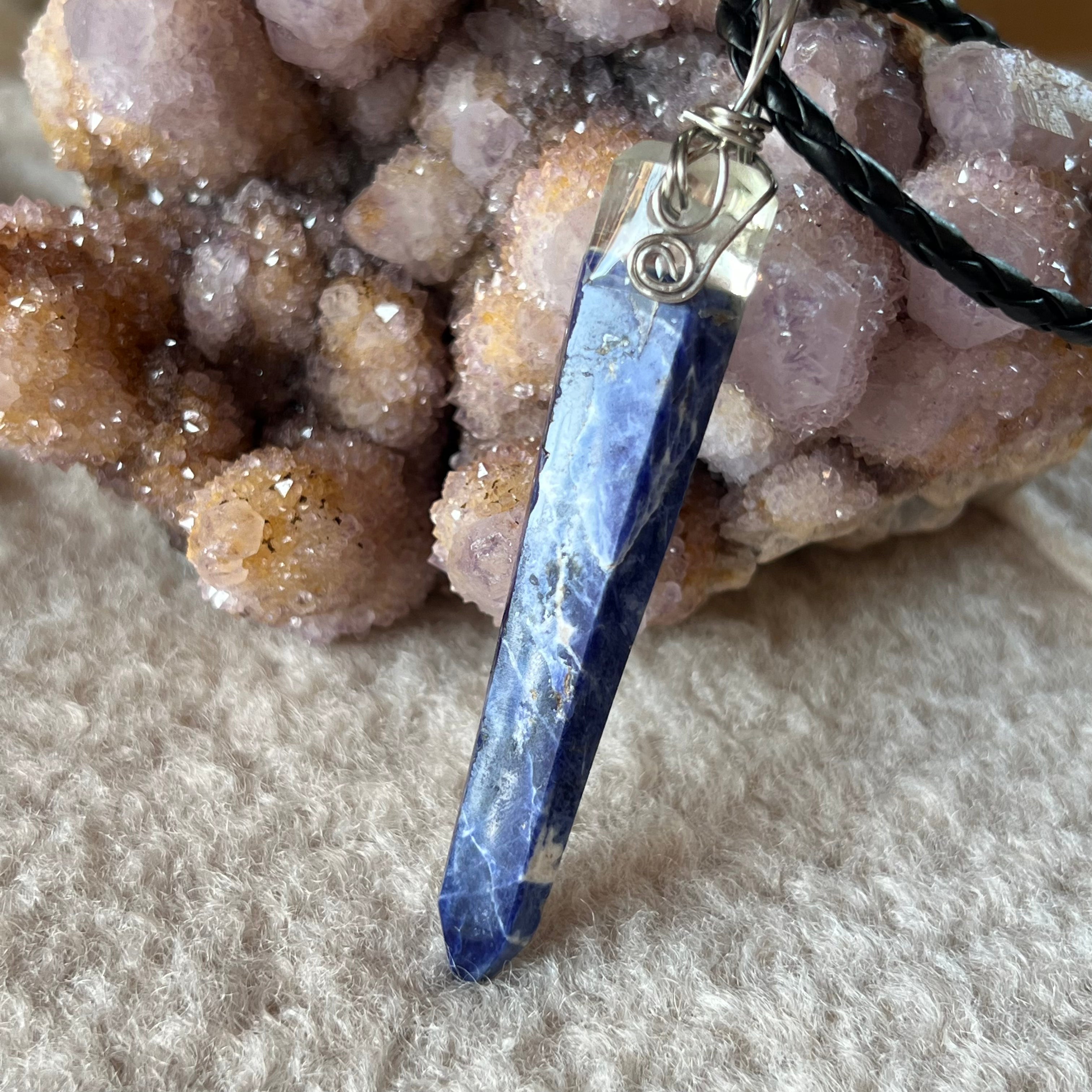 Sodalit medálos nyaklánc ezüst dróttal, fonott fekete zsinór, kézzel készített.