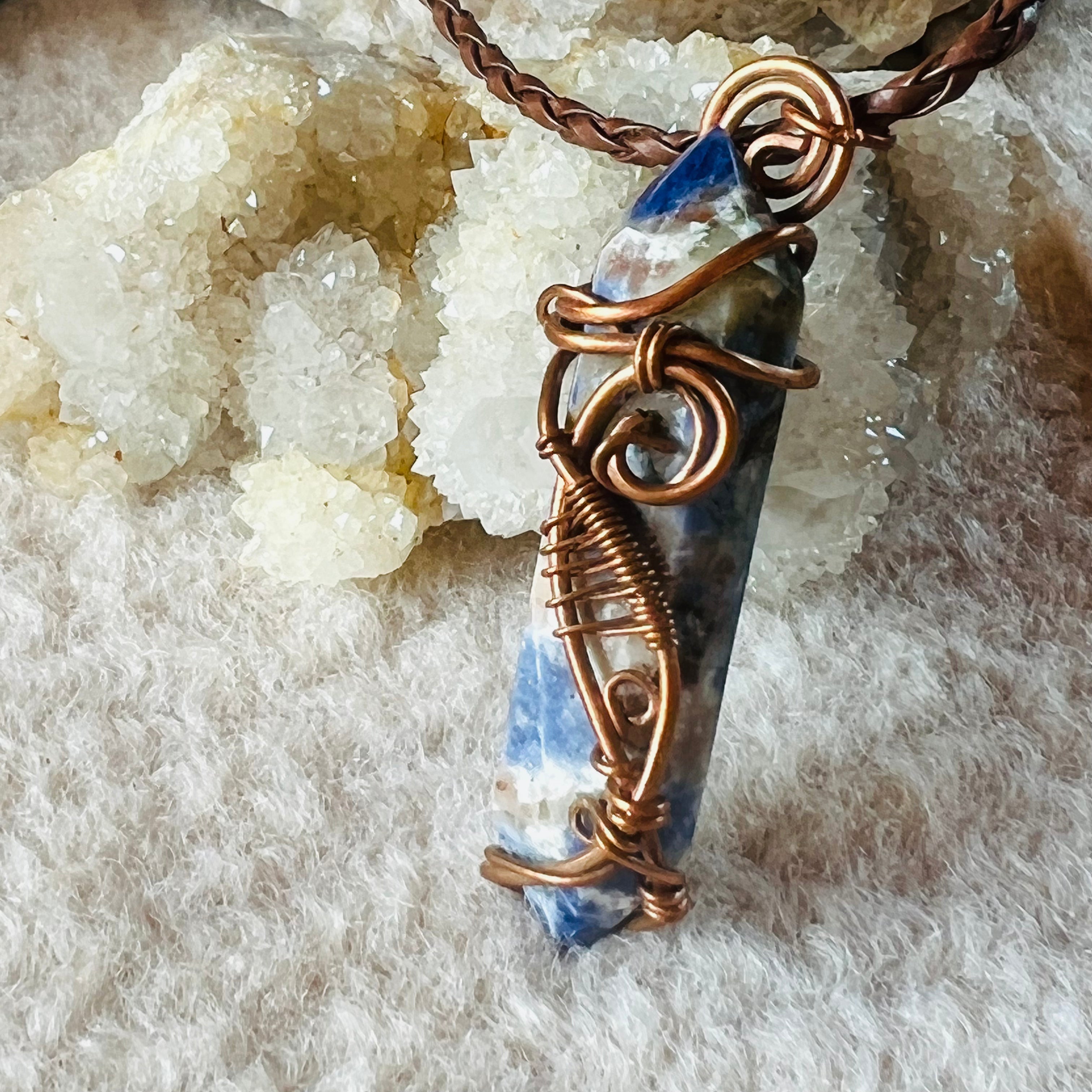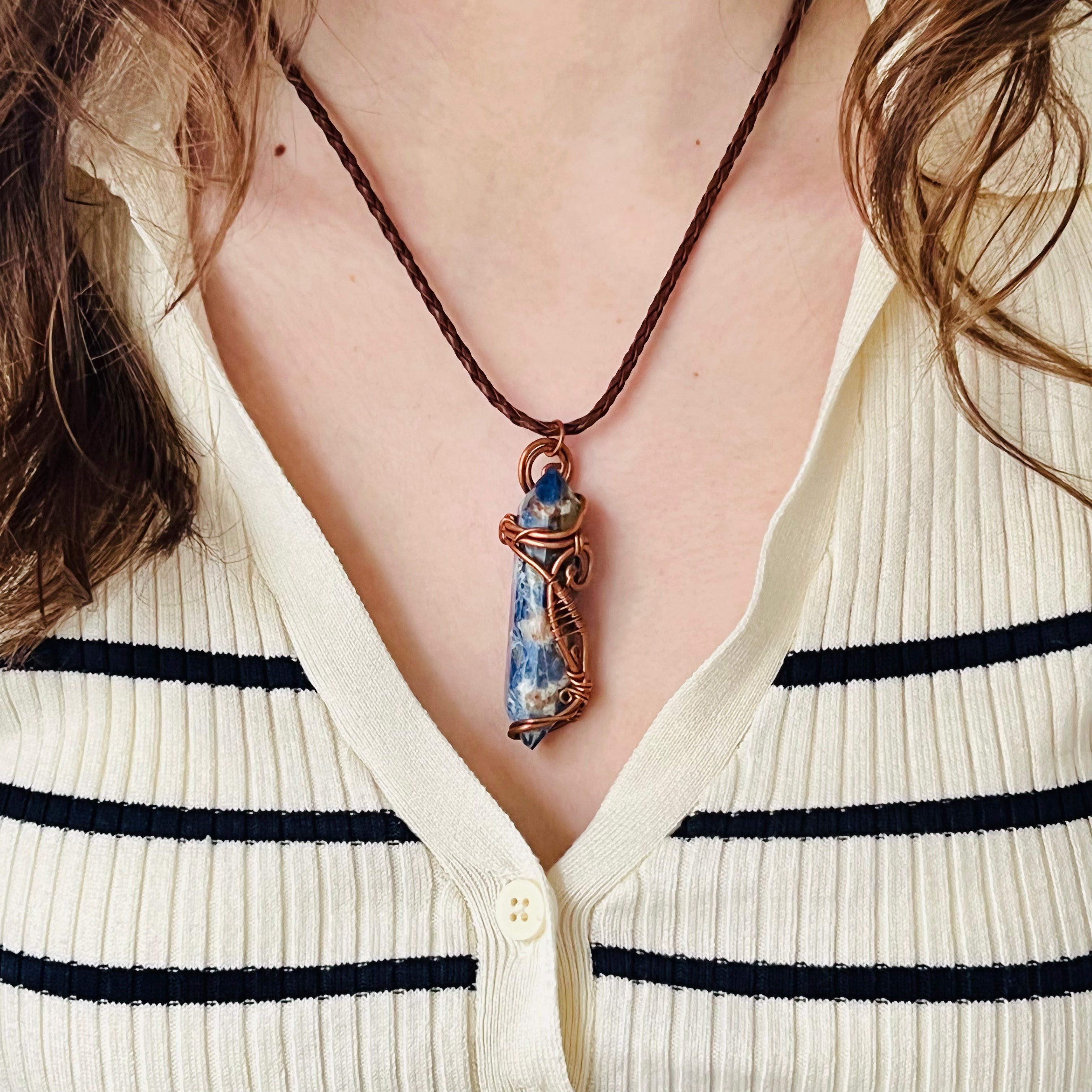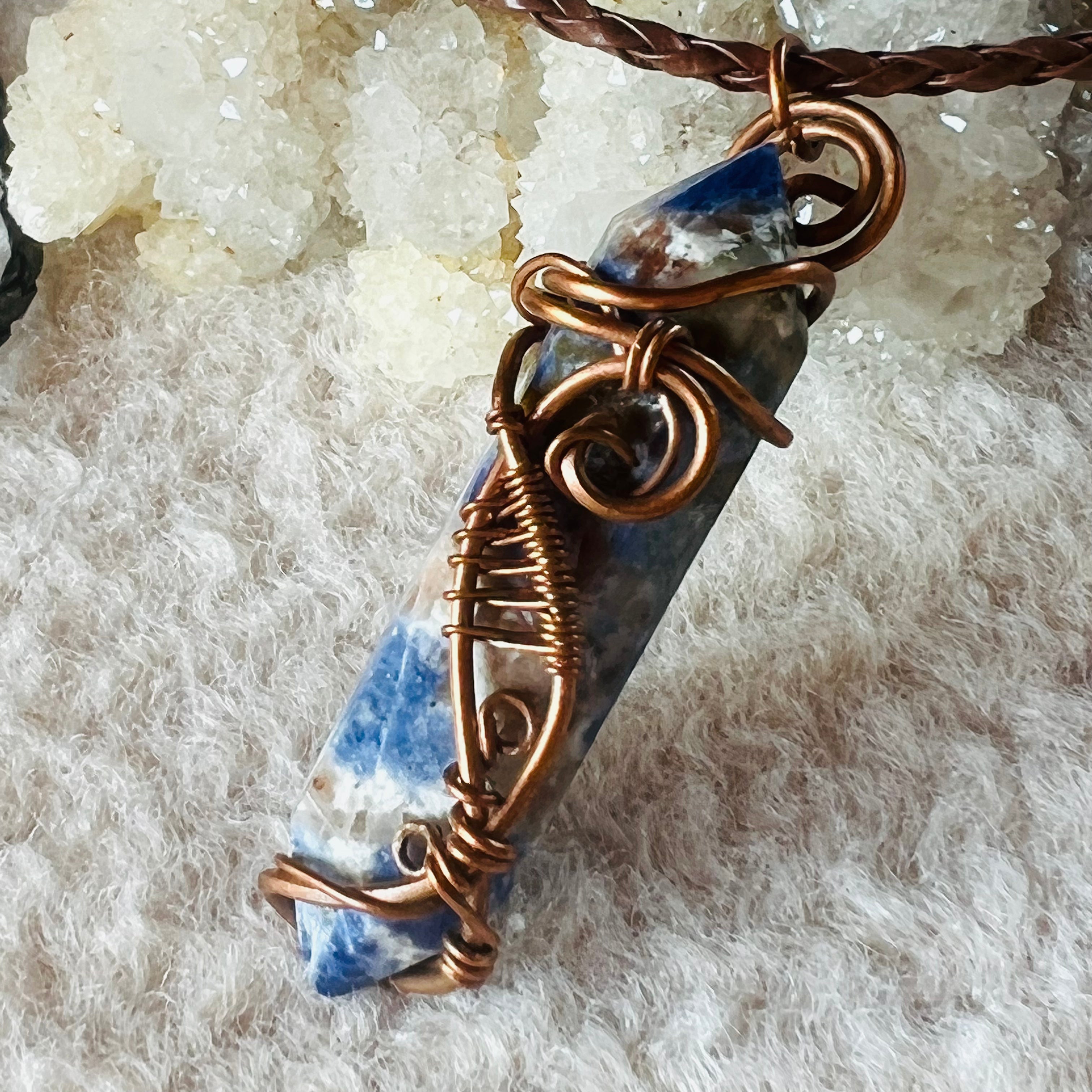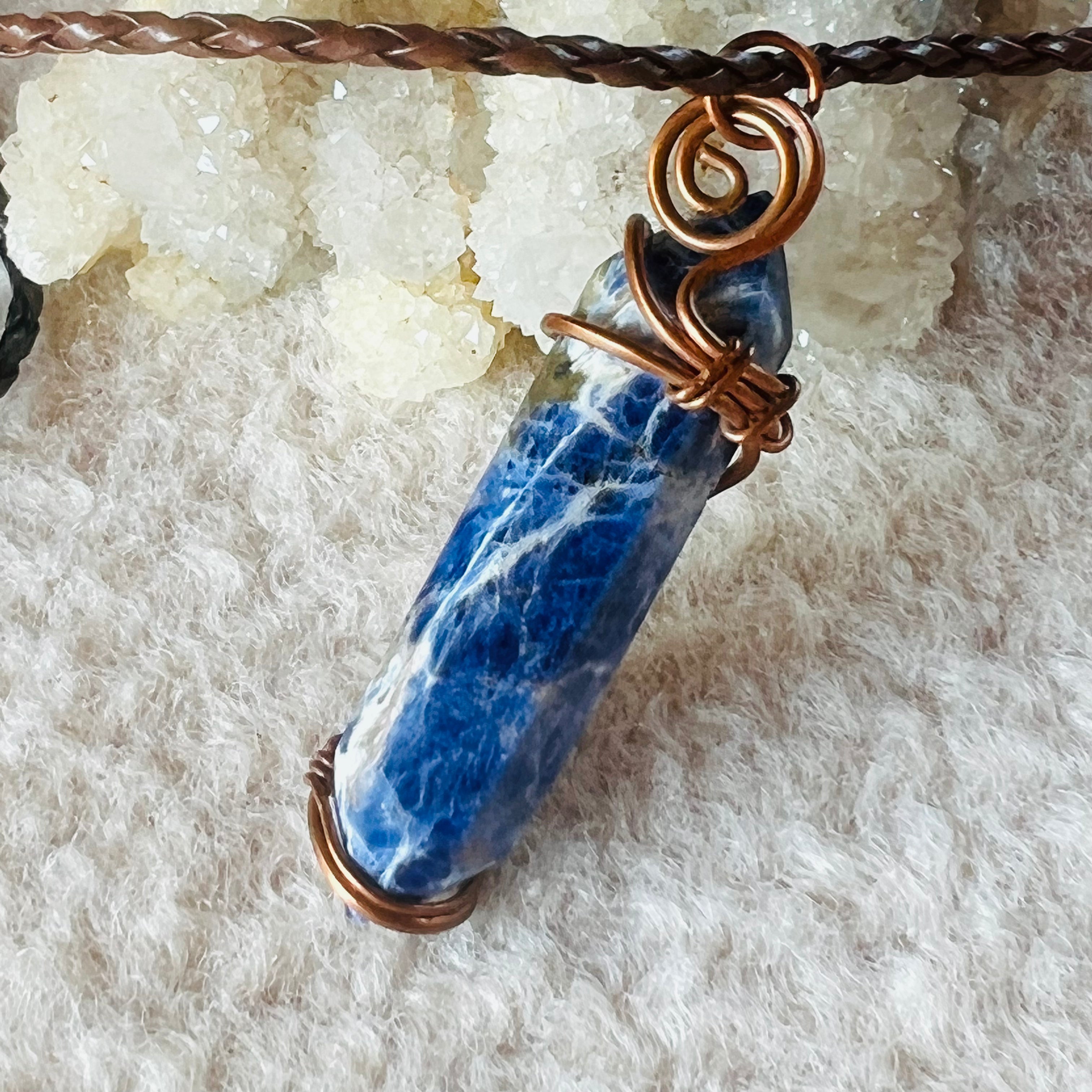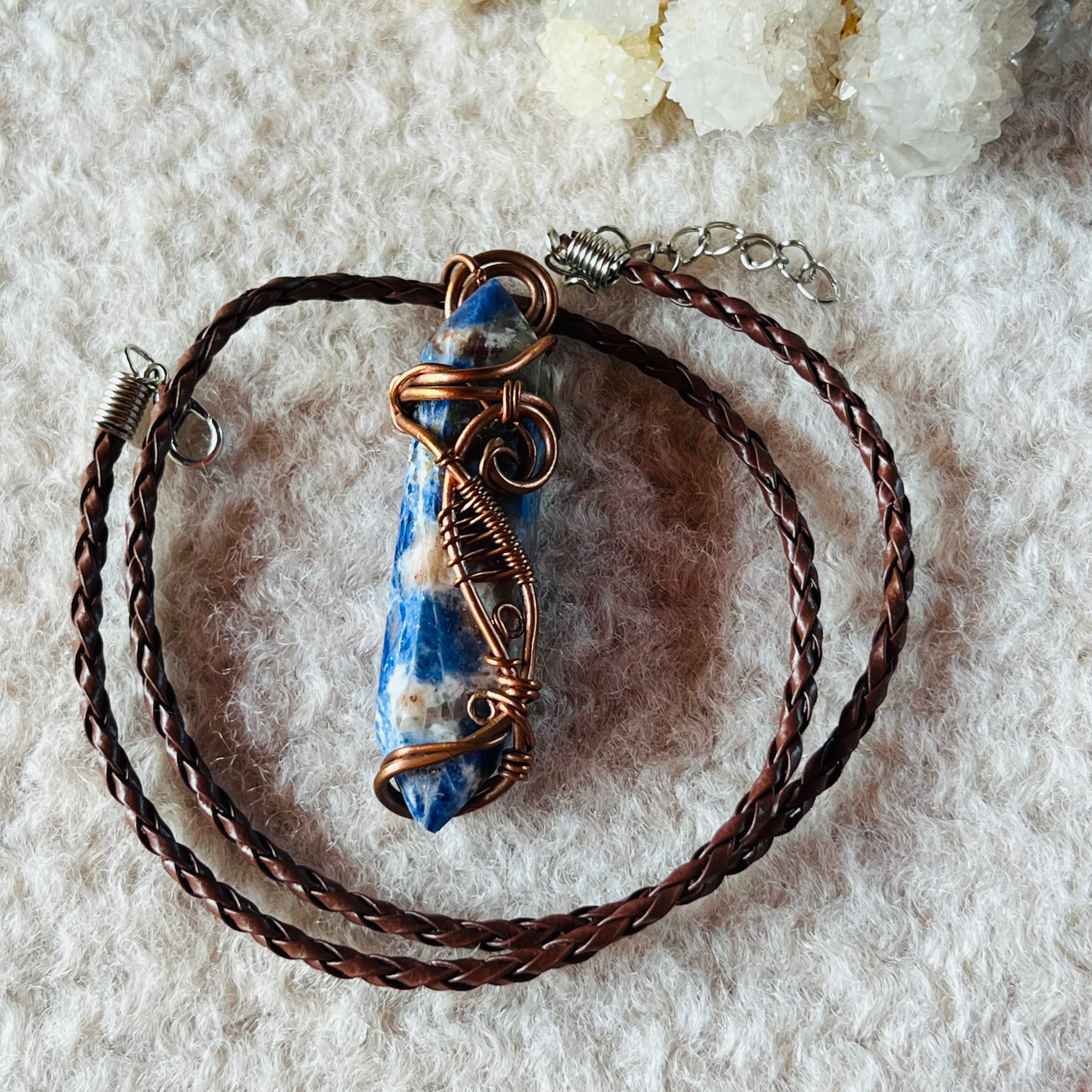 Sodalit medálos nyaklánc művészi dróttal, fonott barna zsinórral, kézzel készült.