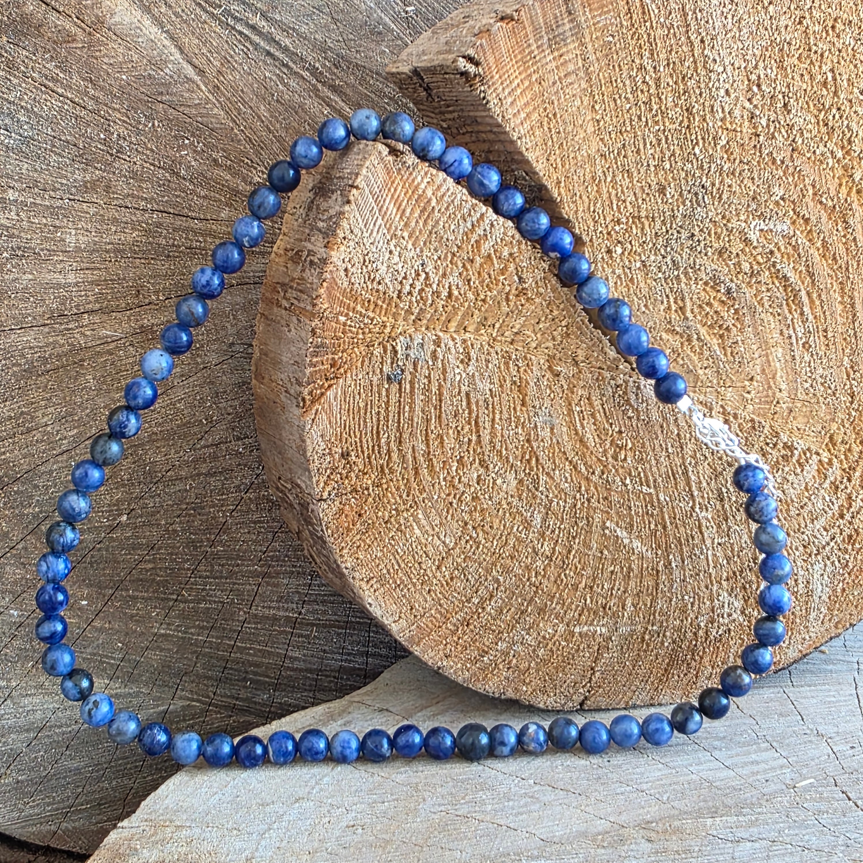 Egy nyaklánc, amely tiszta és mély jelenléttel bír, 8 mm-es szodalit golyókból készült, amelyek jól definiált és kiegyensúlyozott vonalat hoznak létre a nyak körül. Az intenzív kék, fehér vagy szürke természetes bevésett erezetekkel nyugodt és kifejező megjelenést kölcsönöznek a kőnek, míg a gömb alak kiemeli a stabilitás és a vizuális kohézió érzetét. A design egyszerű és tudatos, hagyva, hogy a szodalit természetes színe és szerkezete legyen a központi elem.