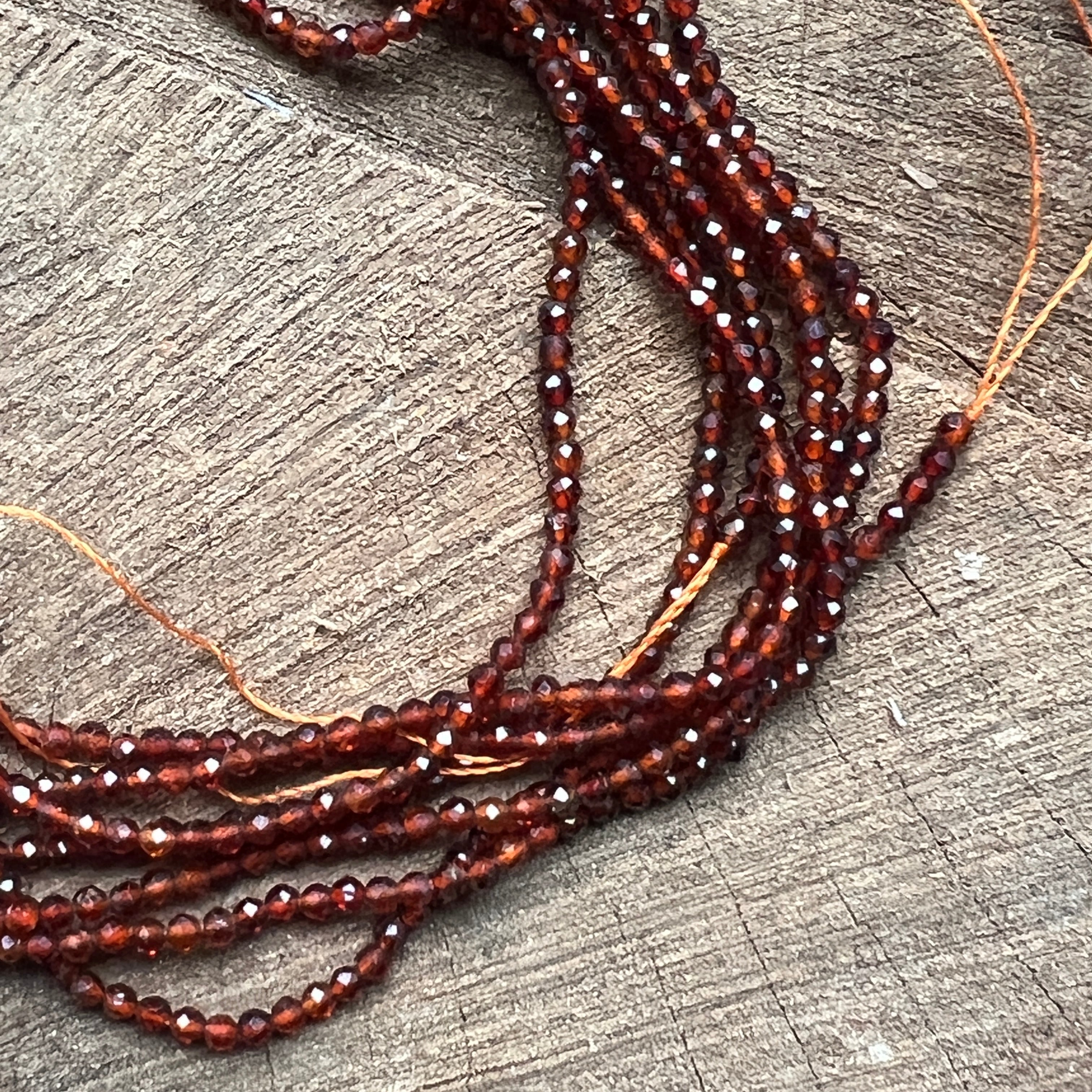 Sötét narancs gránát gyöngysor, amely természetes, csiszolt gömb gyöngyökből áll, tökéletes nyakláncokhoz, karkötőkhöz vagy más kézműves ékszerekhez.
