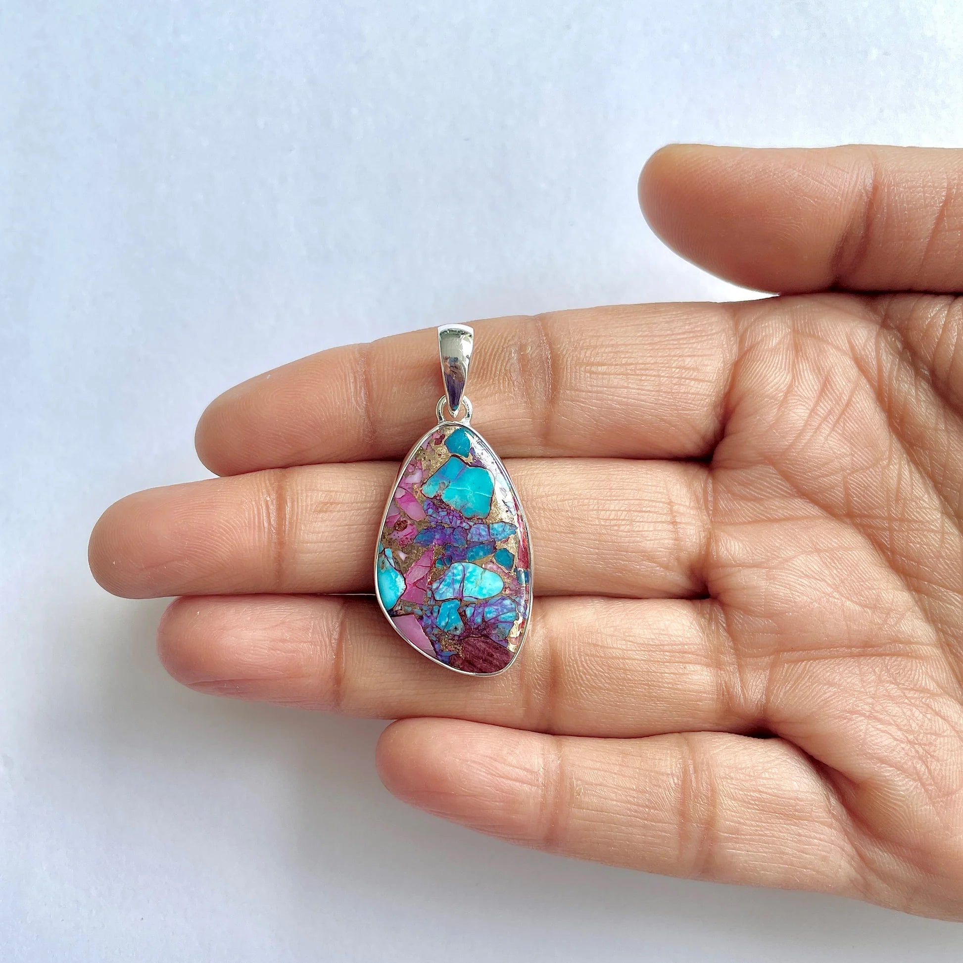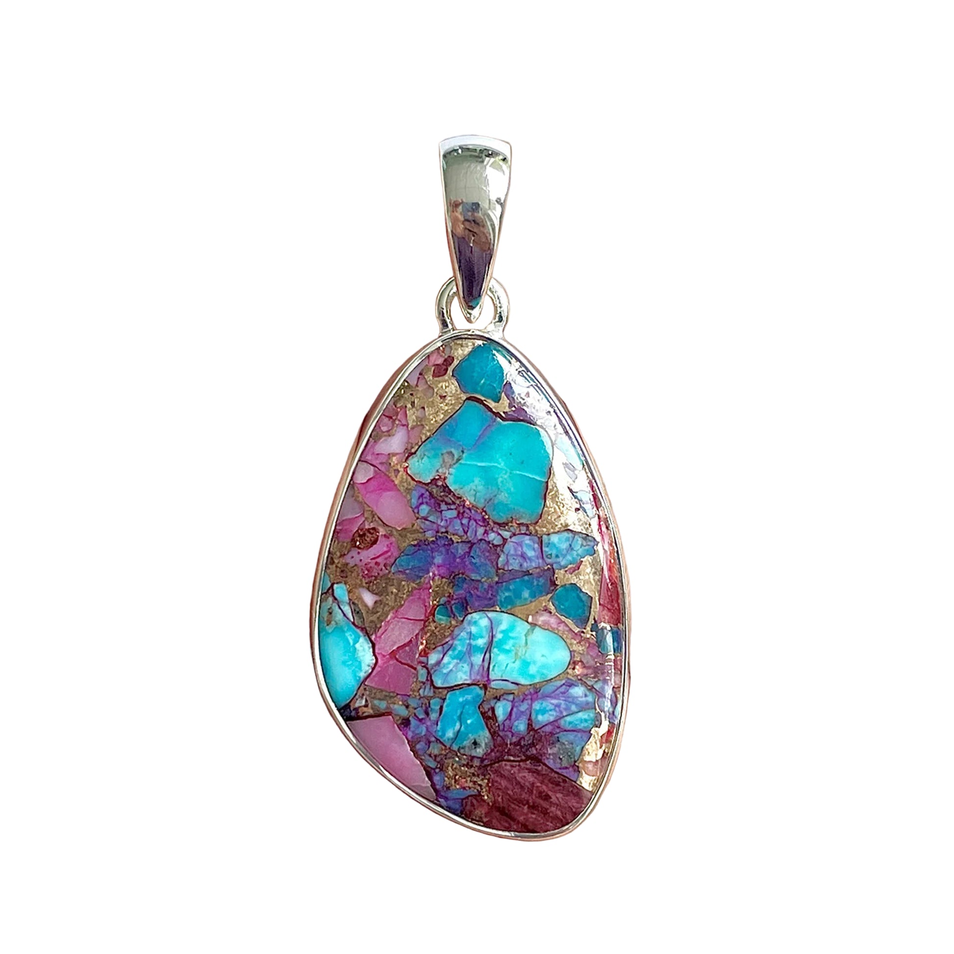 Ez az egyedi medál két természeti kincs – Spiny Oyster és Türkiz – színes mozaikká olvasztásával készül. A kagyló lila, rózsaszín és narancssárga árnyalatai összefonódnak a türkiz intenzív kékjével, így egy élettel teli ékszert hozva létre, amely a tenger és a naplemente találkozását idézi.