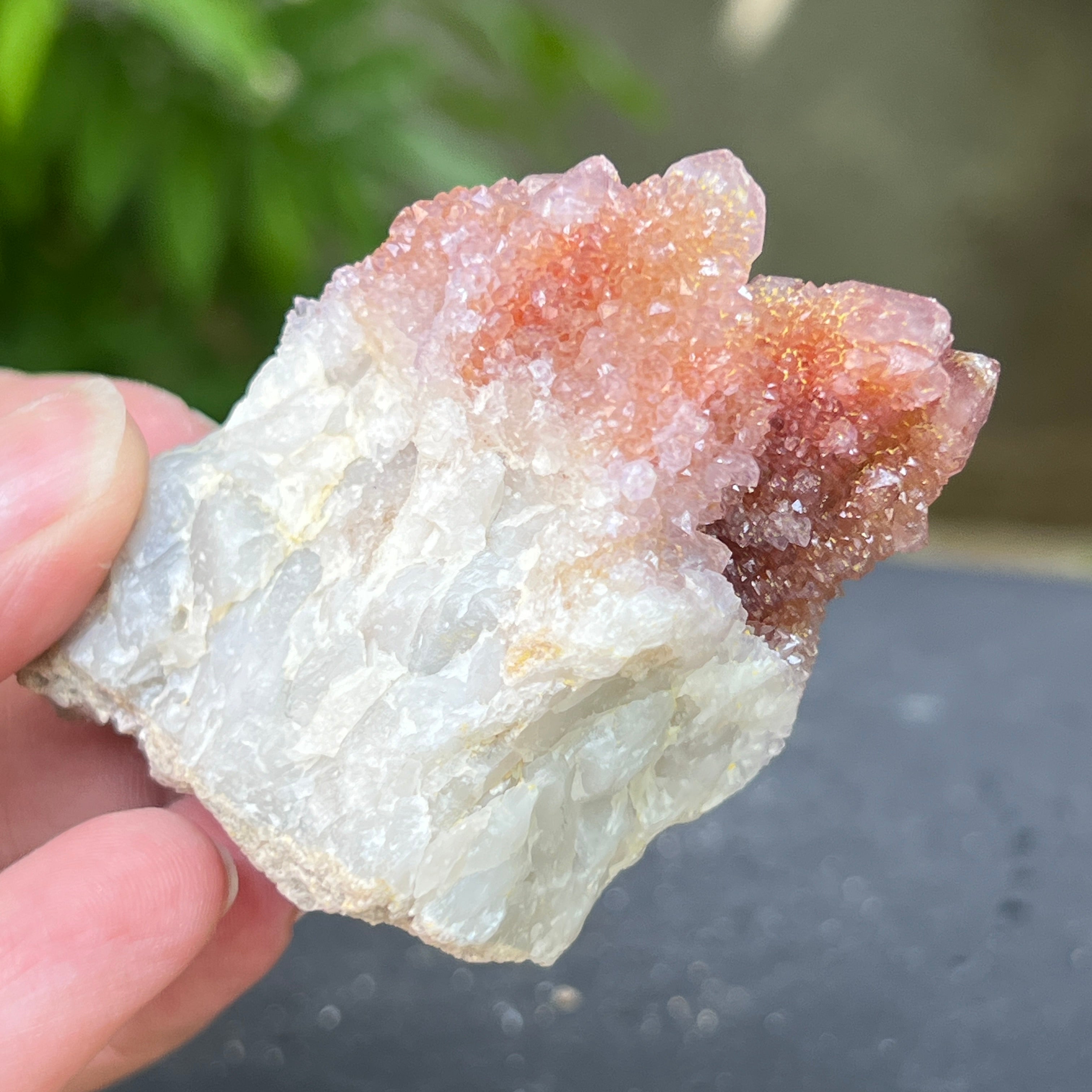 Dél-Afrikából származó egyedi példány, amely ötvözi a kvarc mély energiáját az ametiszt magas rezgéseivel. Ez a kő az együttműködés és a lelki közösség köve, az egyéniség és az egység közötti harmónia szimbóluma. Minden apró kristály a közös középpontból sugárzik, mint a tökéletes egyensúlyban lévő tudatháló.