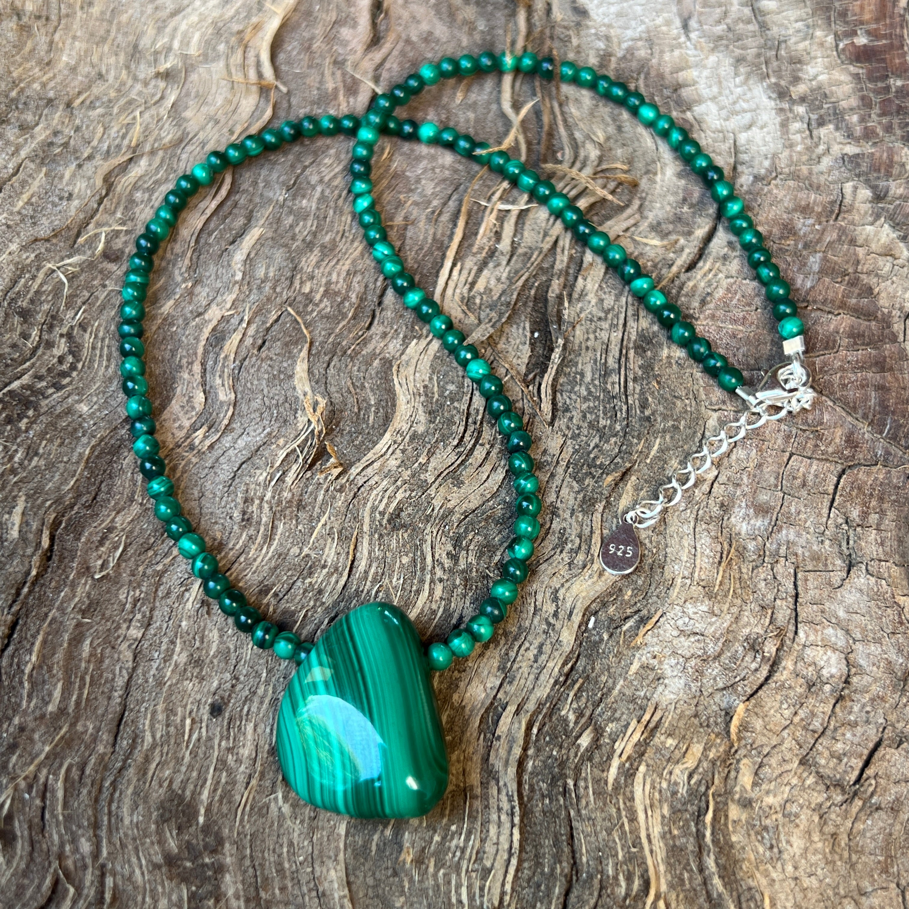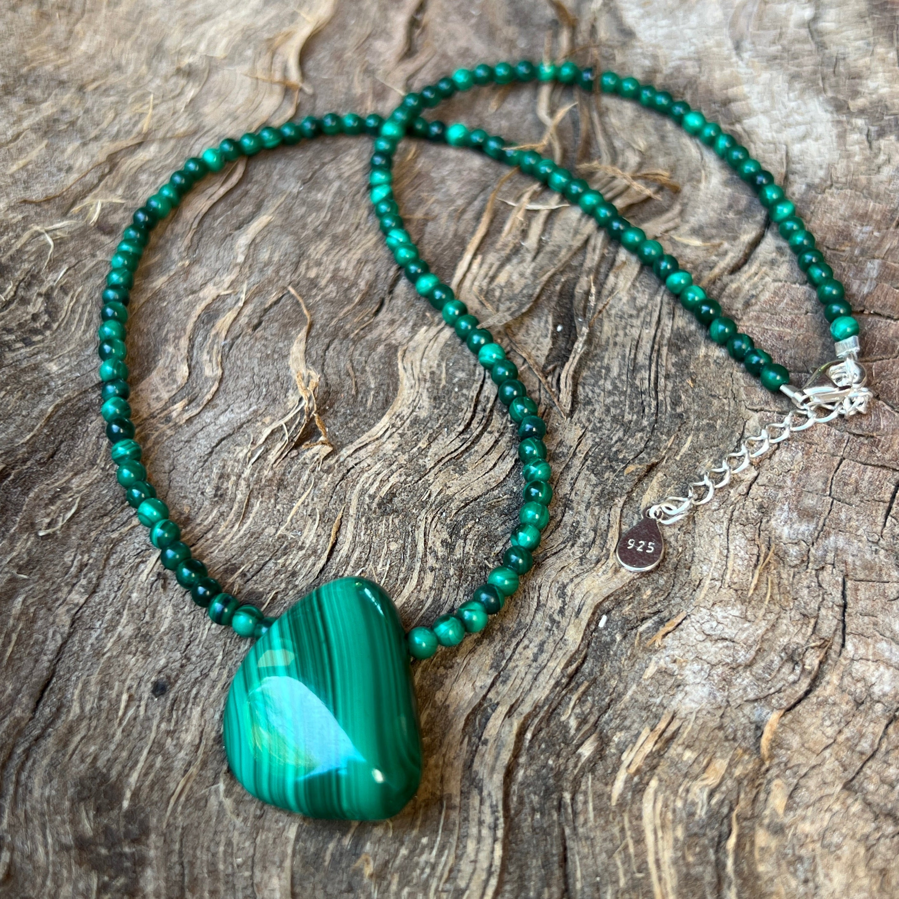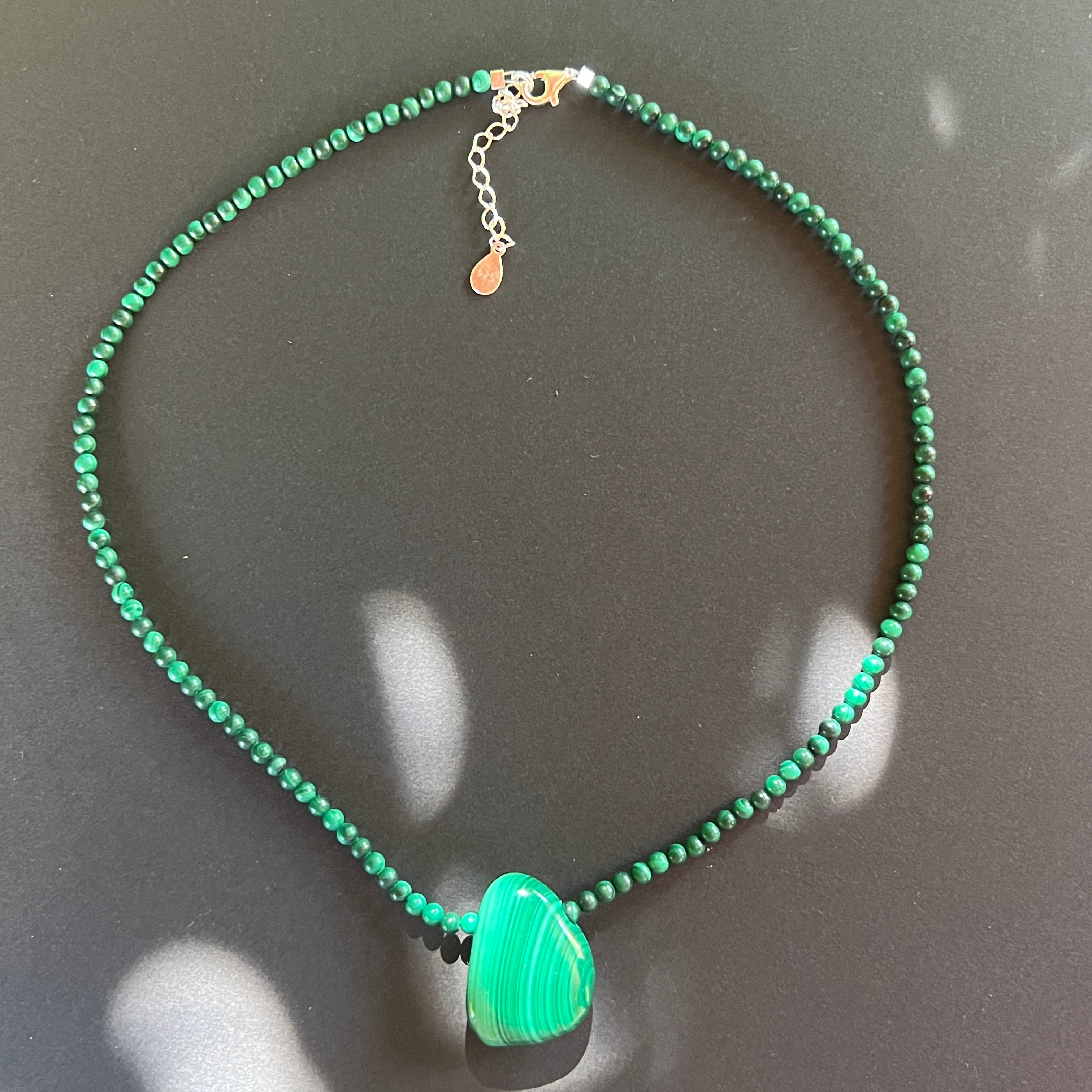 Az összetétel közepén egy kb. 2,4 cm hosszú malachit csepp medál a változás szimbólumává válik: egy csepp gyengéd erő, egy amulett, amely türelmesen kísér az utadon.