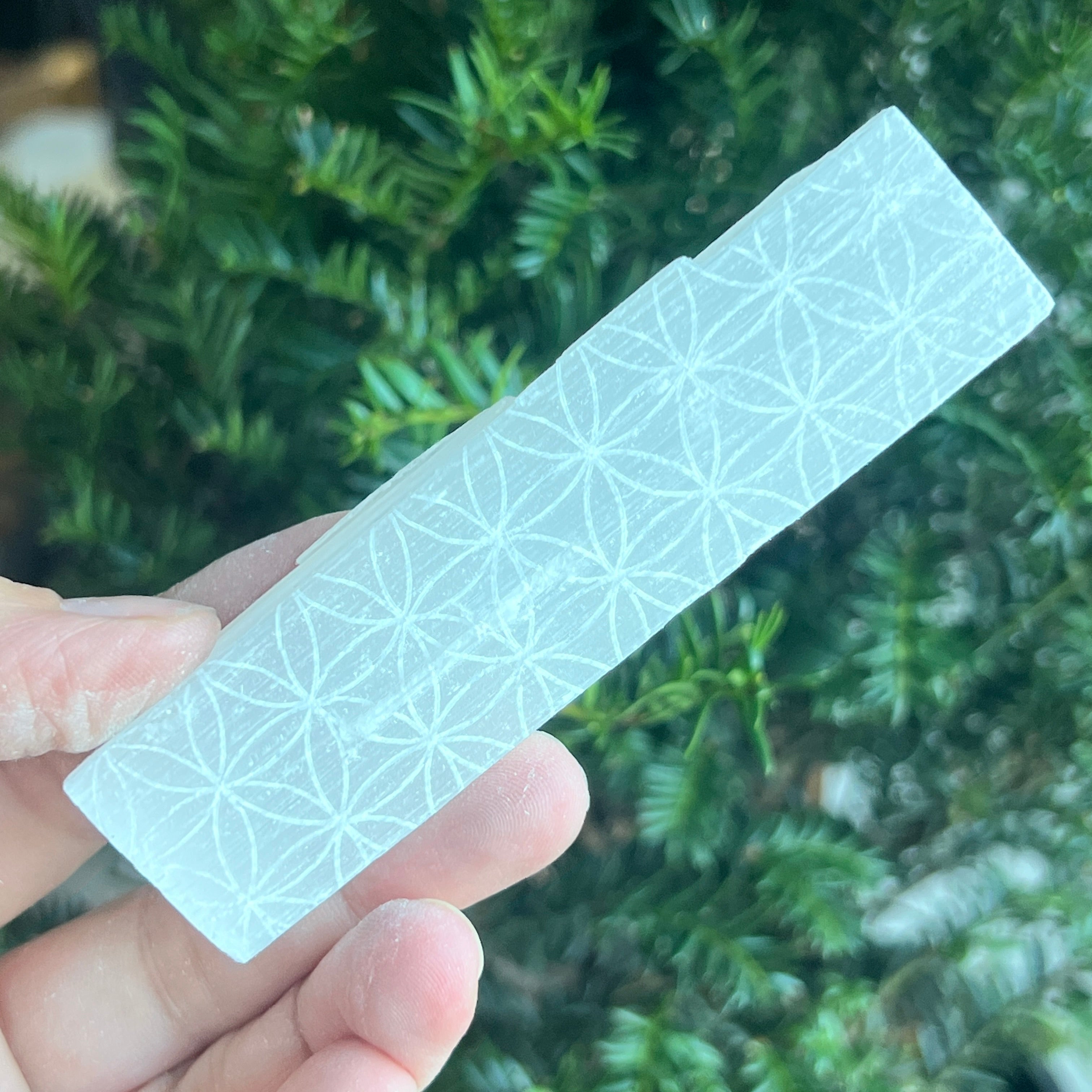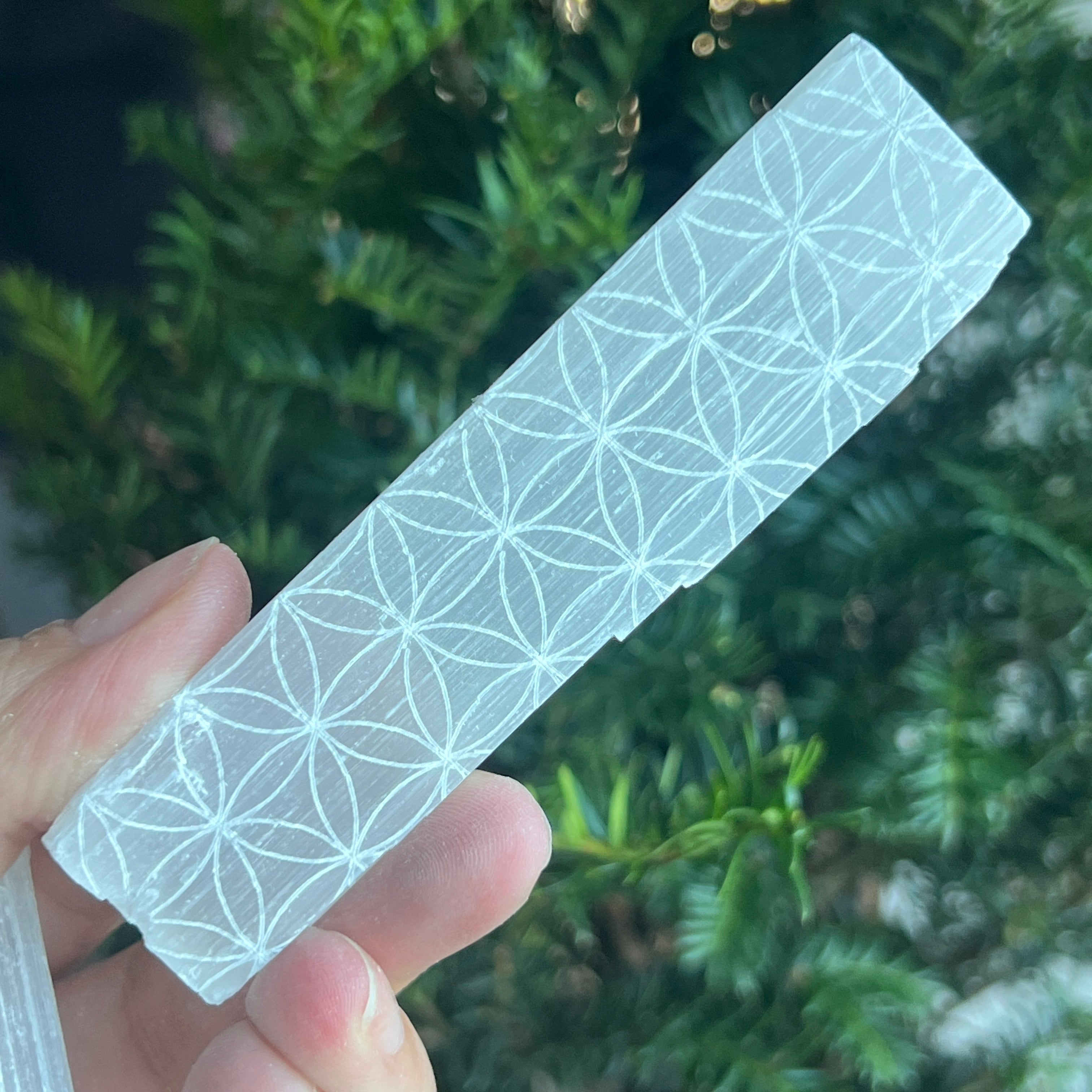 A Természetes szelénitbot, az Élet Virágaszimbólummal gravírozva, magas rezgésű darab, ideális tisztításra, harmonizálásra és spirituális kapcsolódásra. Természetes, enyhén csillogó textúrája finoman, majdnem éteri módon veri vissza a fényt — mint egy megszilárdult nyugalom sugara.
