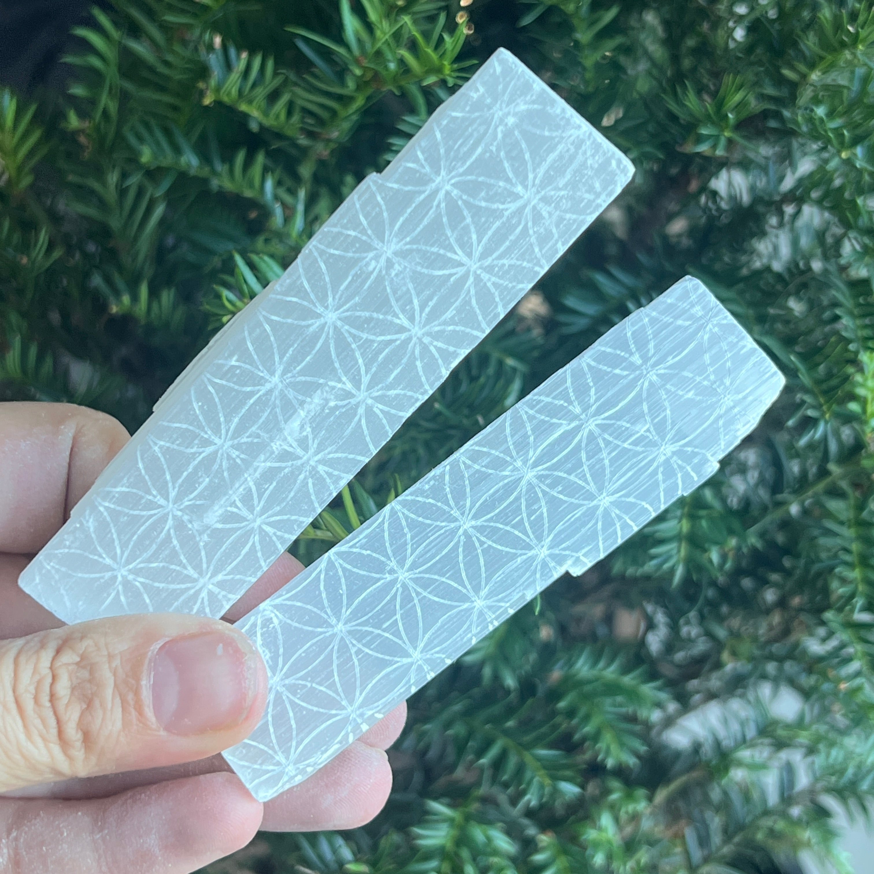 Élet Virága az univerzális geometria egyik legszentebb szimbóluma, amely az összes élőlény összekapcsolódását és a teremtés energiáját jelképezi. A szeleniten való gravírozása fokozza ennek a kőnek a tisztító és energetikai kiegyensúlyozó erejét, minden pálcikát egyedülálló spirituális eszközzé alakítva.