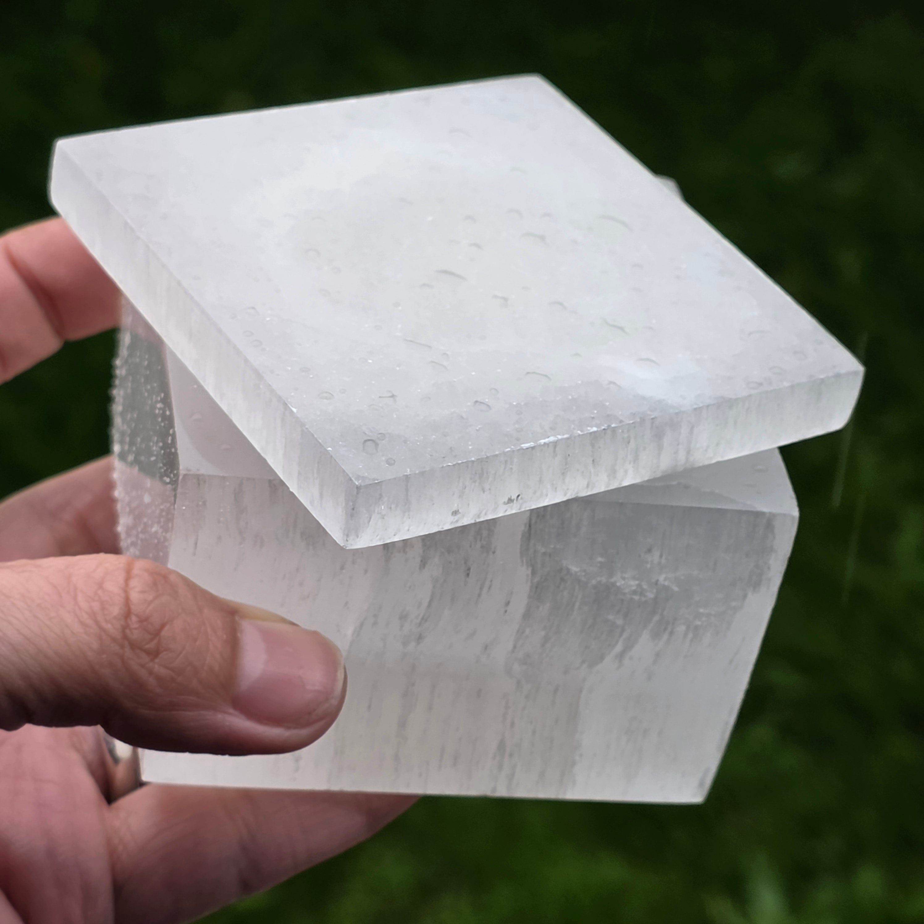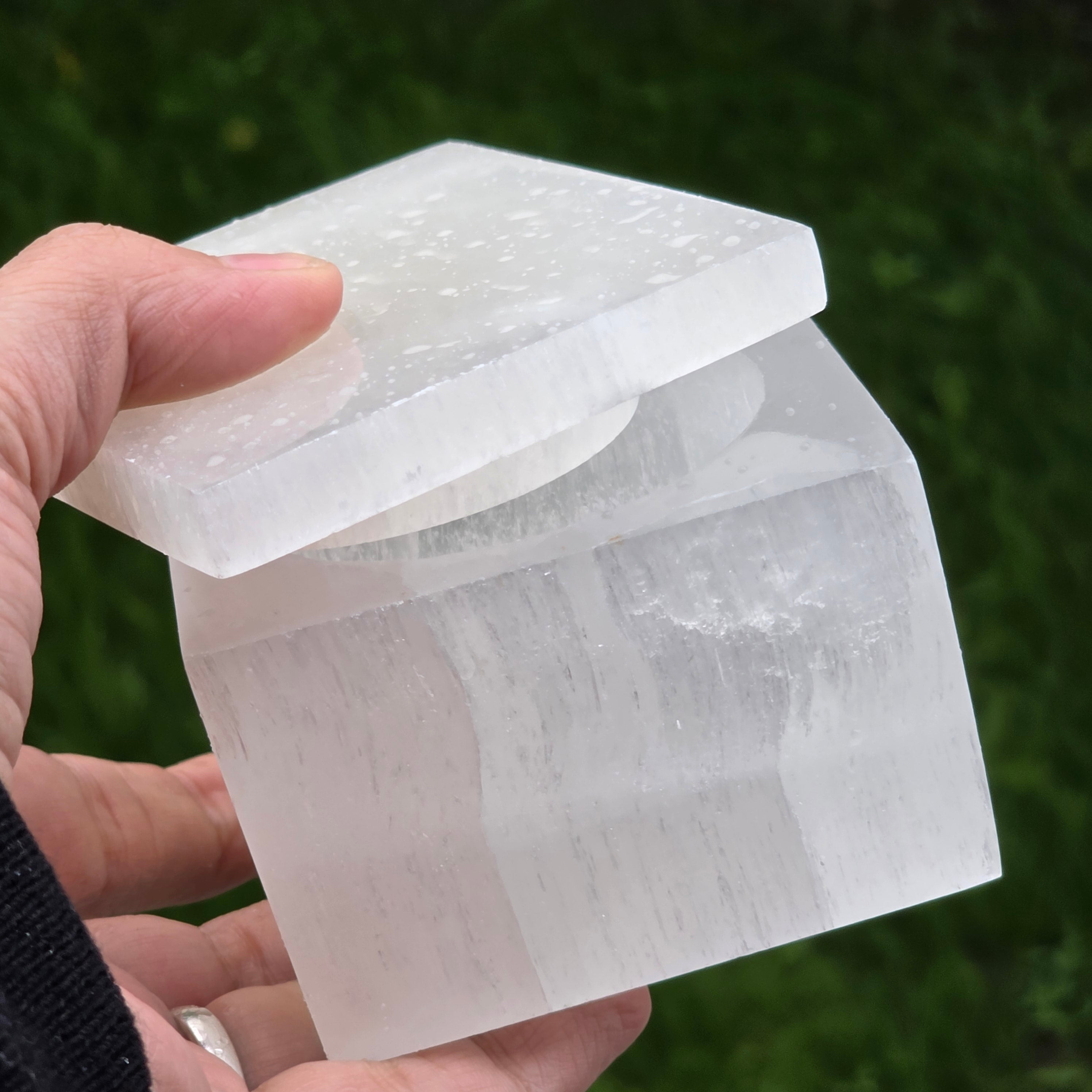 A szelénit doboz az egyik legkifinomultabb darab, amelyet ebből a fényes ásványból készítettek, egyszerre funkcionális és dekoratív szobor. Kézzel készített, minőségi marokkói szelénit tömbökből, a darab megőrzi azt az utánozhatatlan „megszilárdult fény” hatást – a kő átlátszó szálai finom, selymes fényvisszaverődéseket hoznak létre, melyek újra és újra megtekintésre csábítanak.