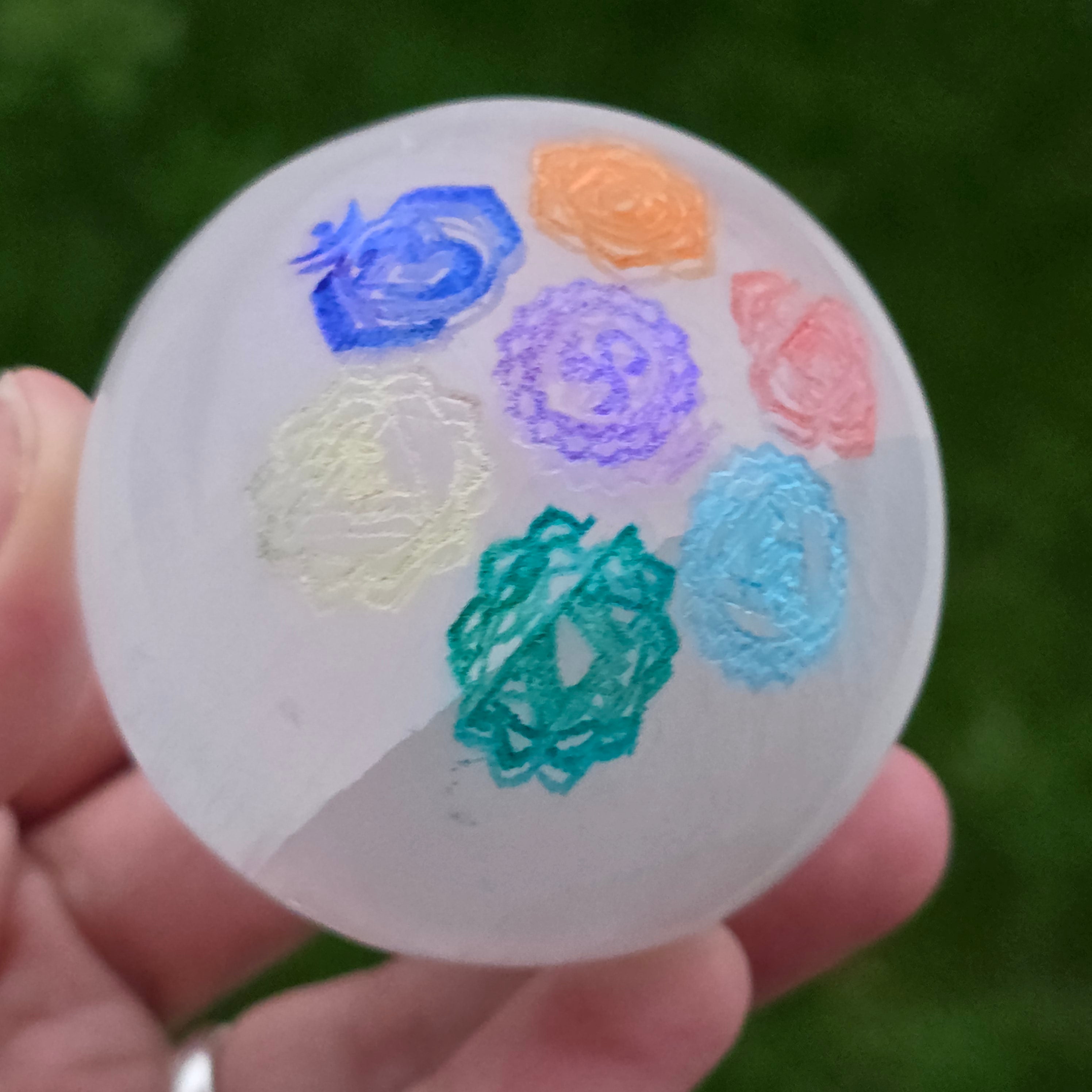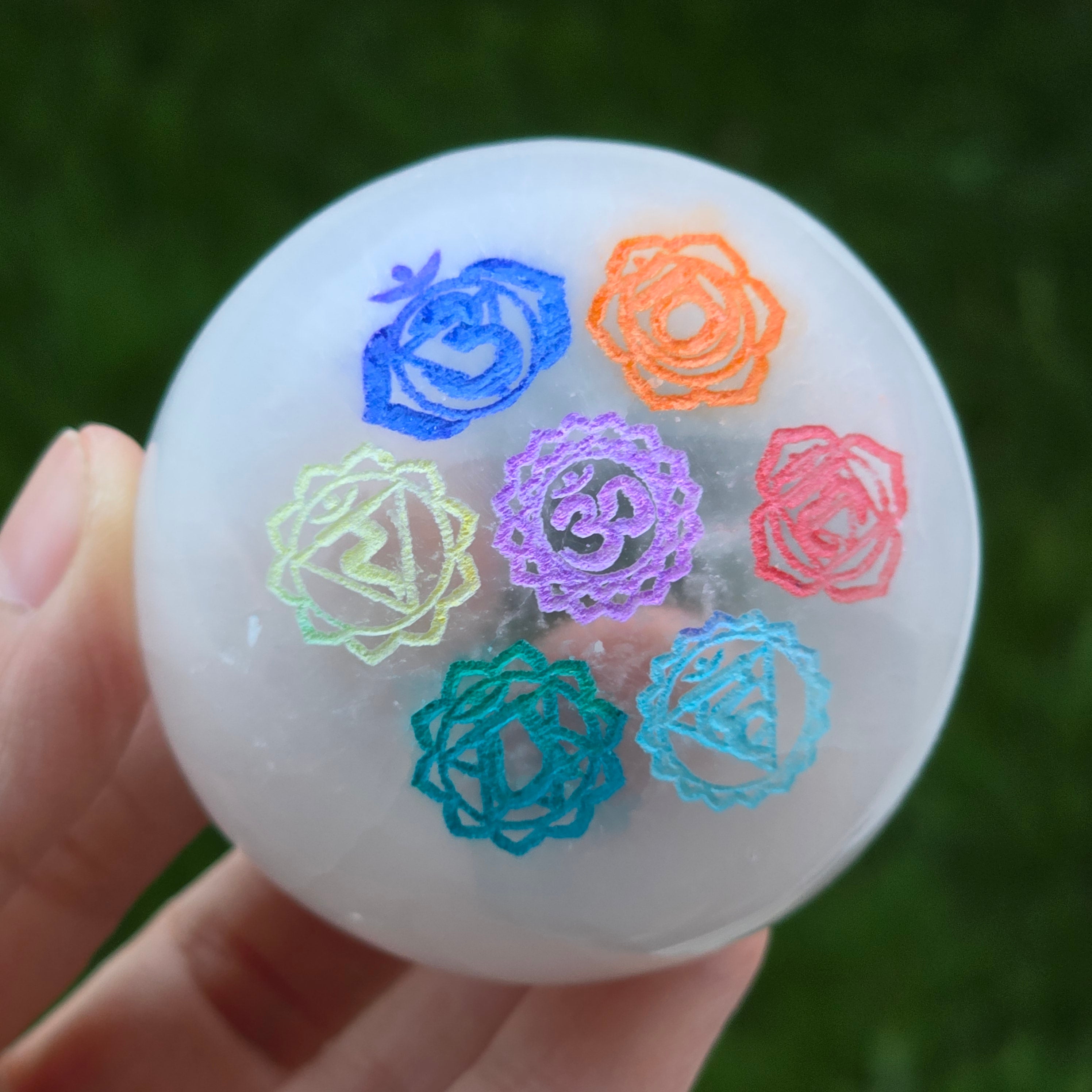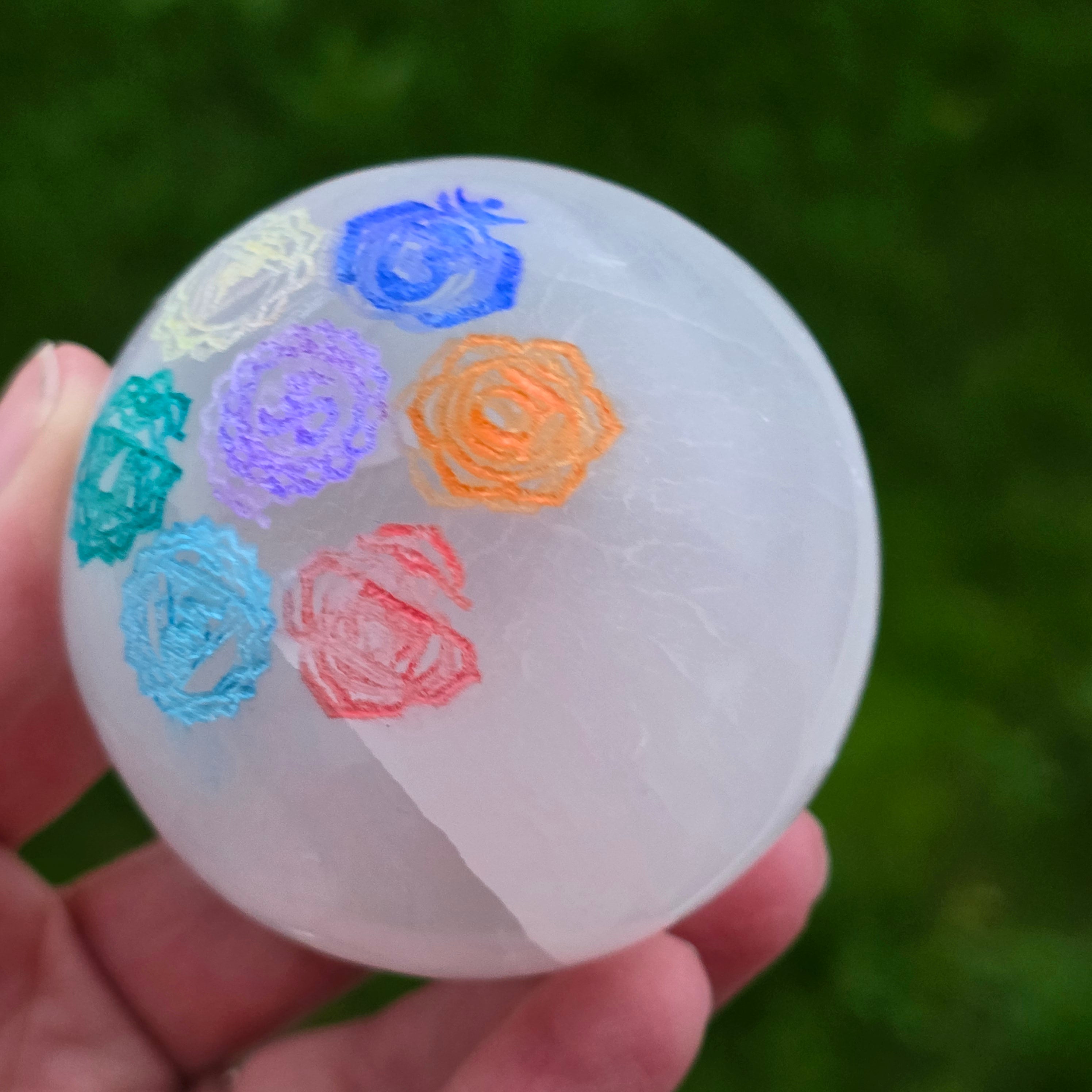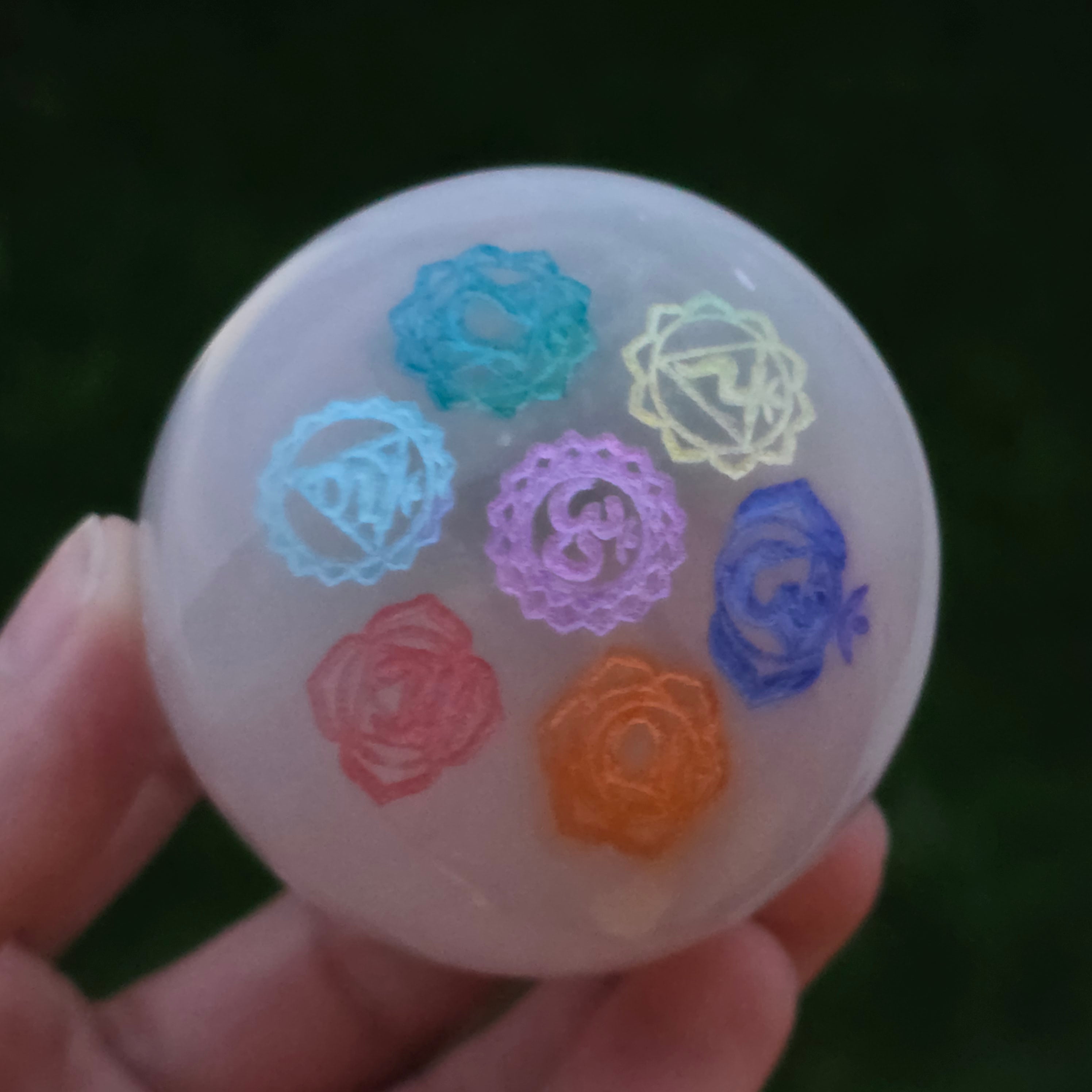 Ezt gömb szelenitből a 7 csakra szimbólumai díszítik, amelyek mindegyike külön gravírozott és színezett, hogy támogassa az energiamunkát és a belső egyensúlyt. A szelenit néven ismert a fény és a megtisztulás köve, amelyet mind a mentális tisztaság, mind a többi kristály és a személyes tér megtisztítására használnak.