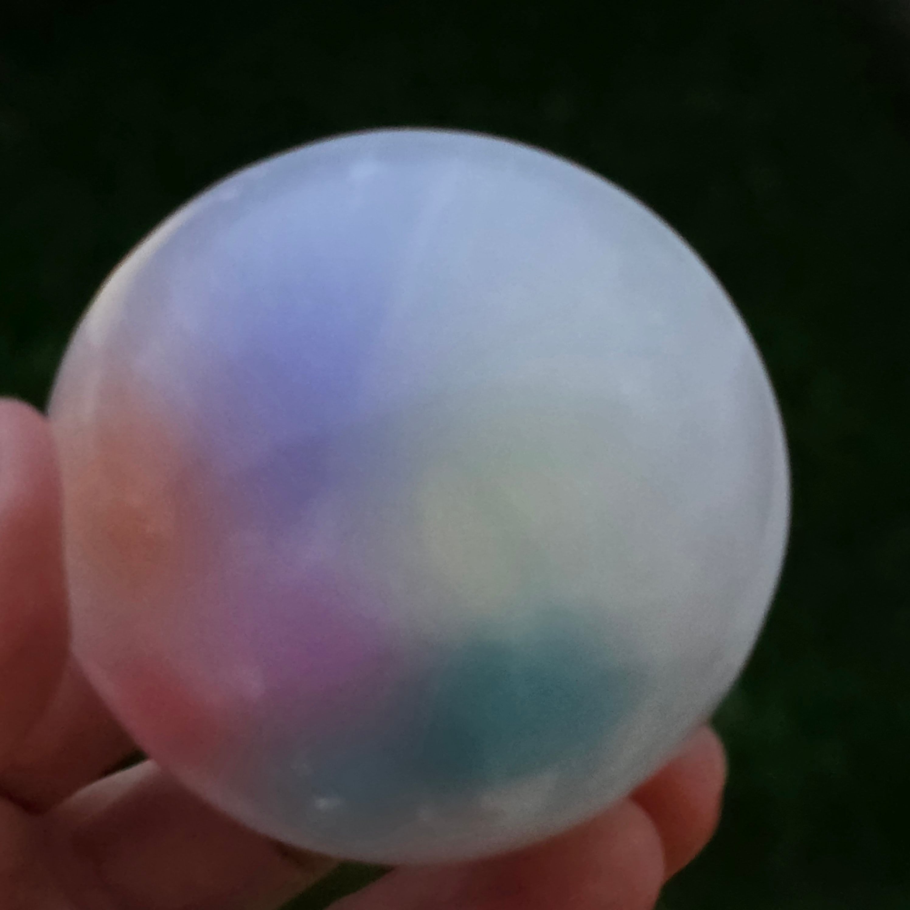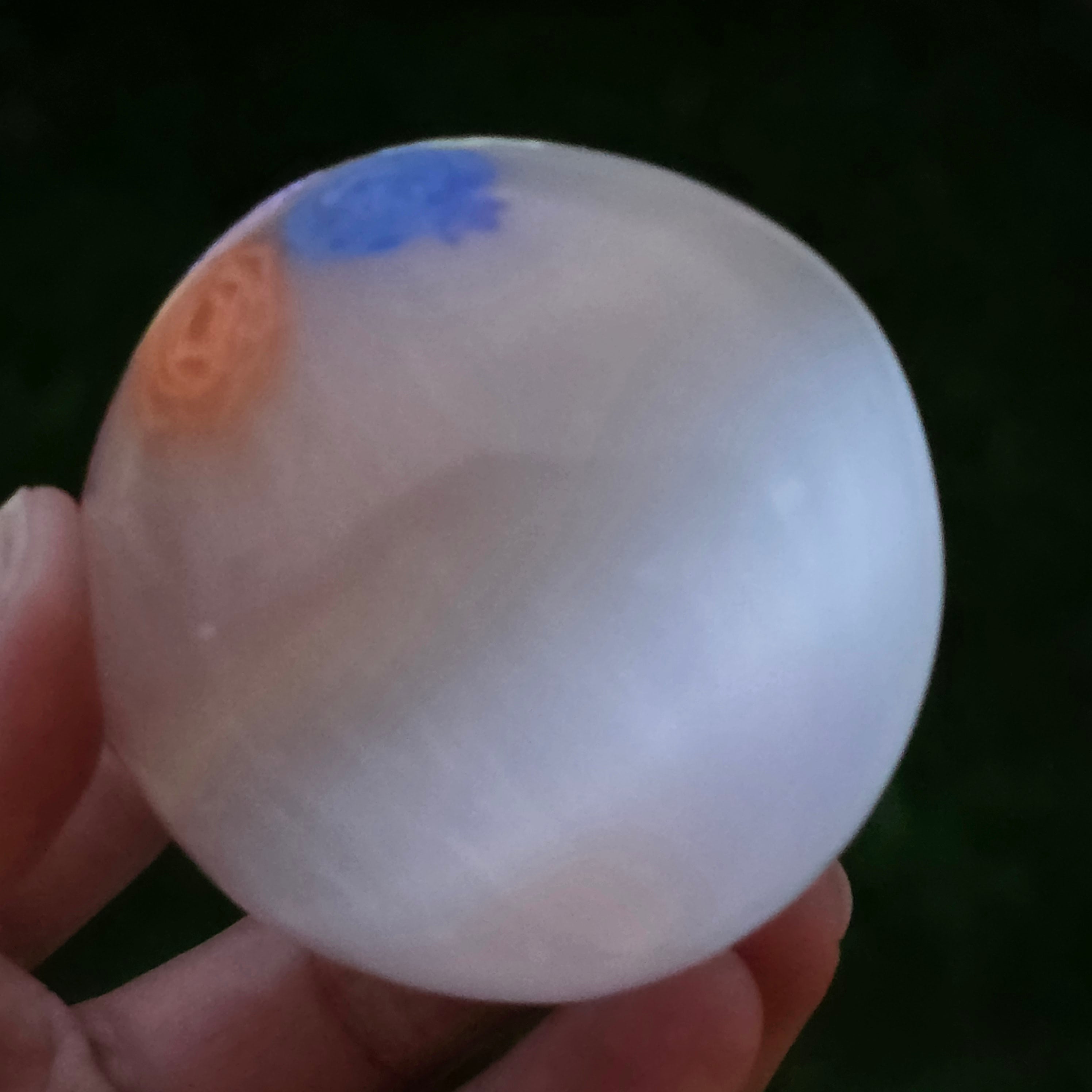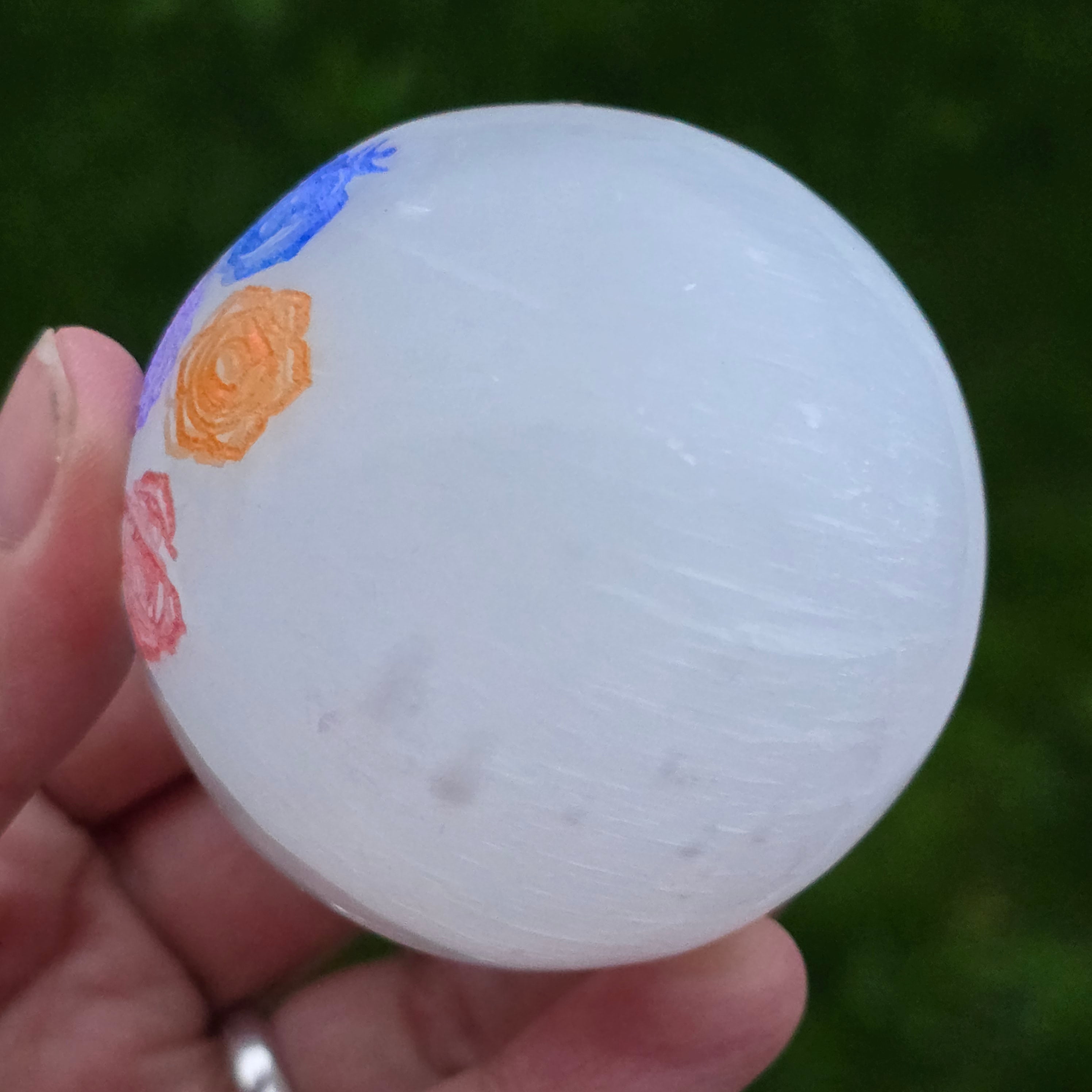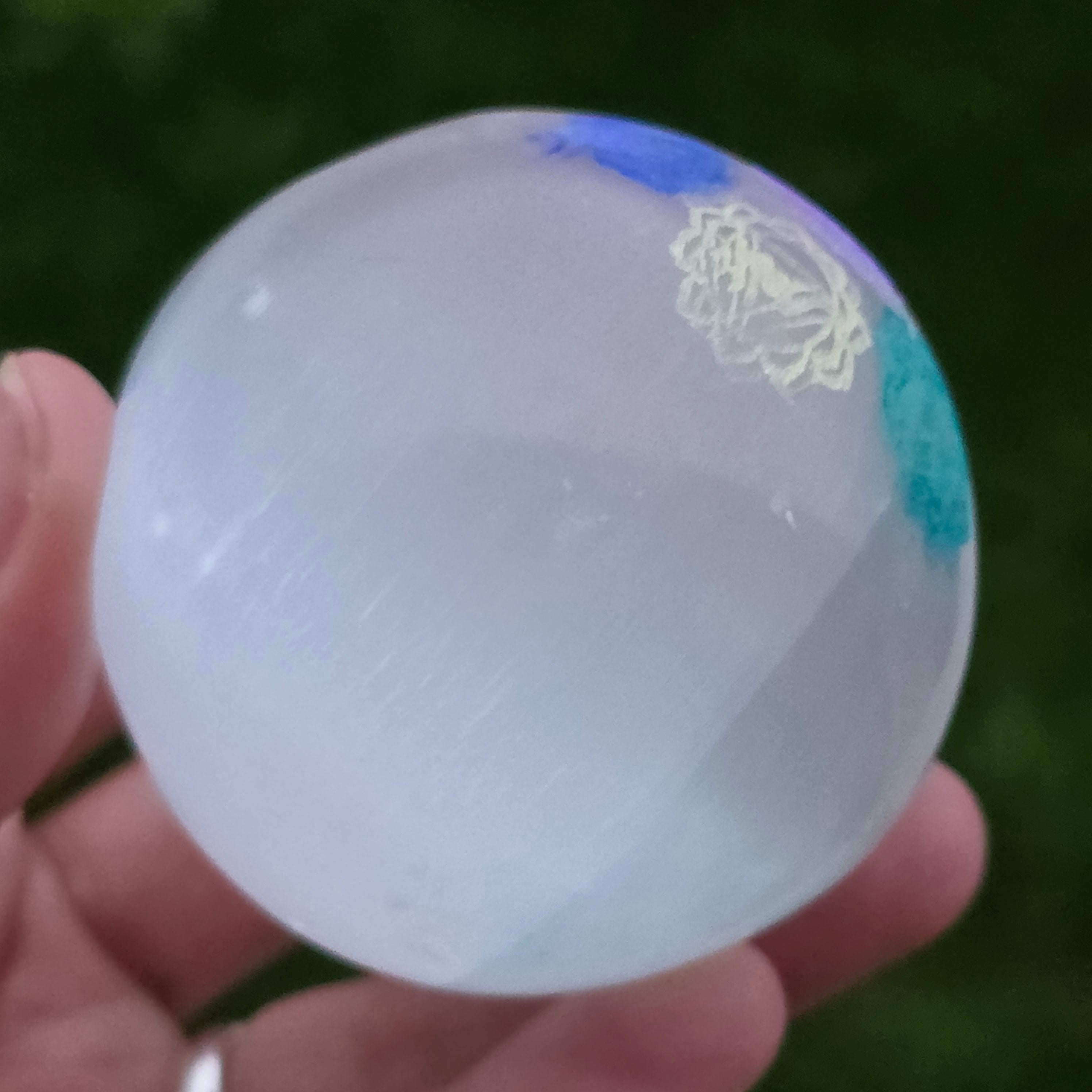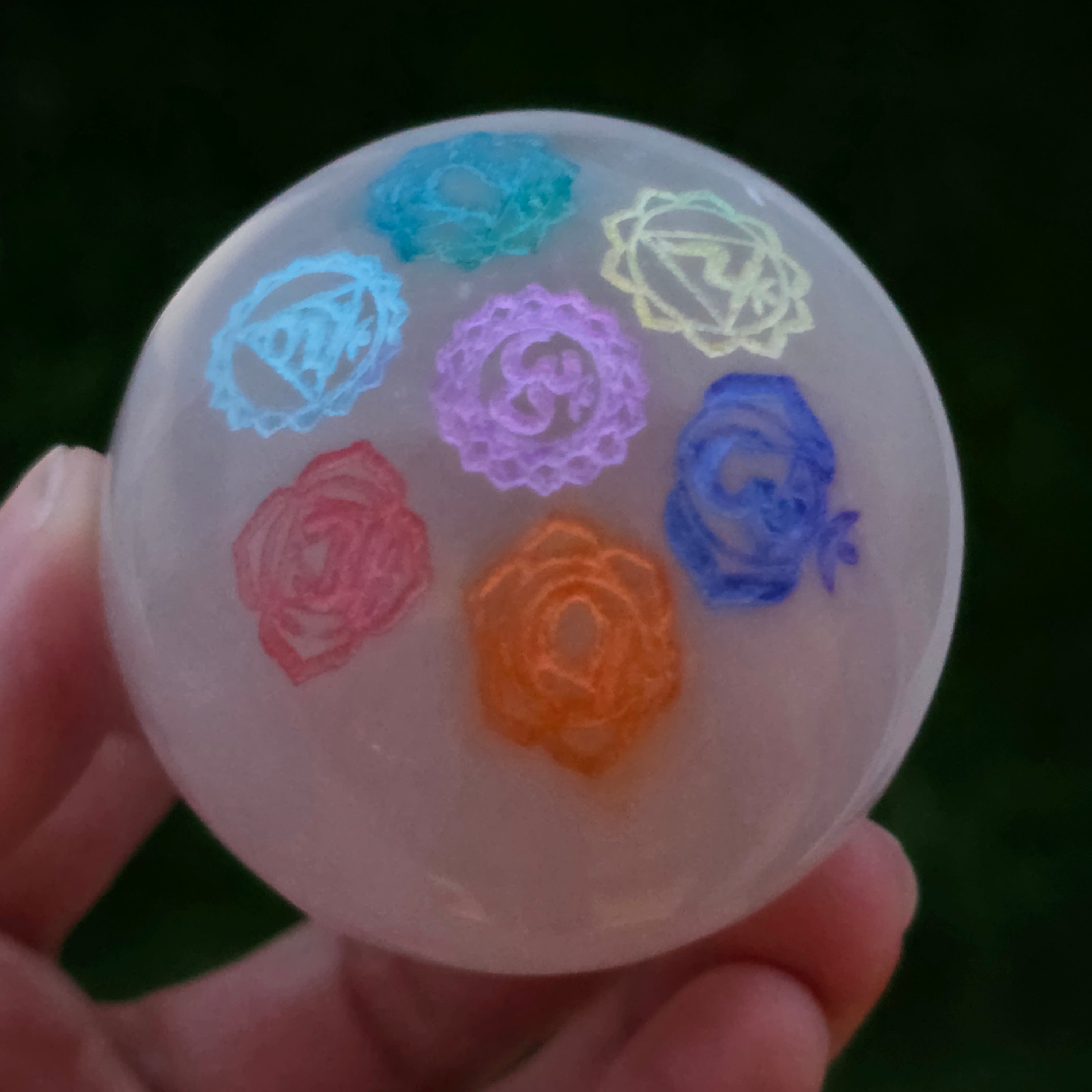 Ezt gömb szelenitből a 7 csakra szimbólumai díszítik, amelyek mindegyike külön gravírozott és színezett, hogy támogassa az energiamunkát és a belső egyensúlyt. A szelenit néven ismert a fény és a megtisztulás köve, amelyet mind a mentális tisztaság, mind a többi kristály és a személyes tér megtisztítására használnak.