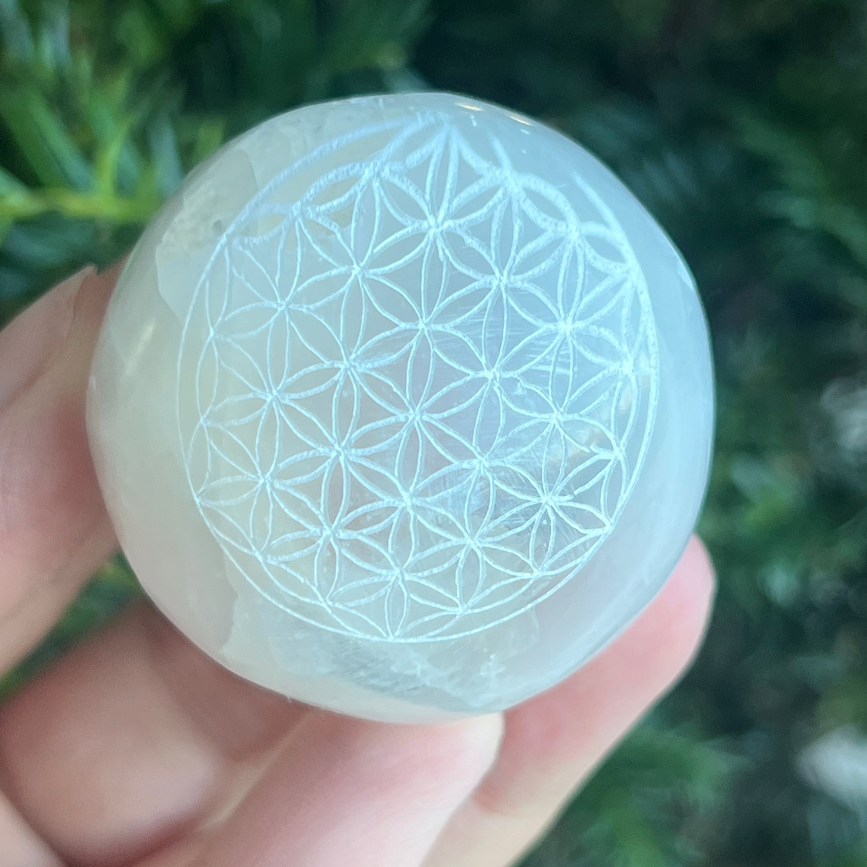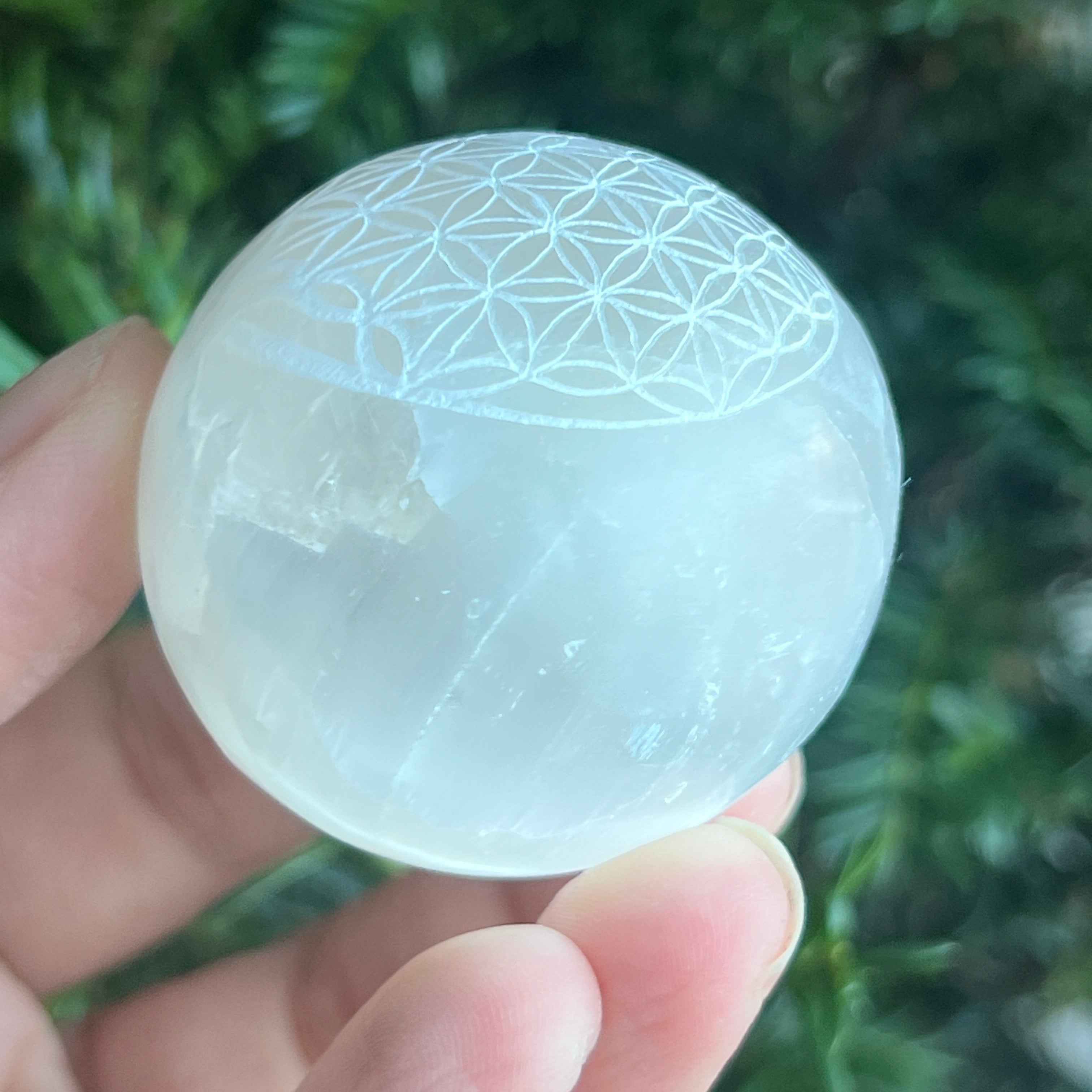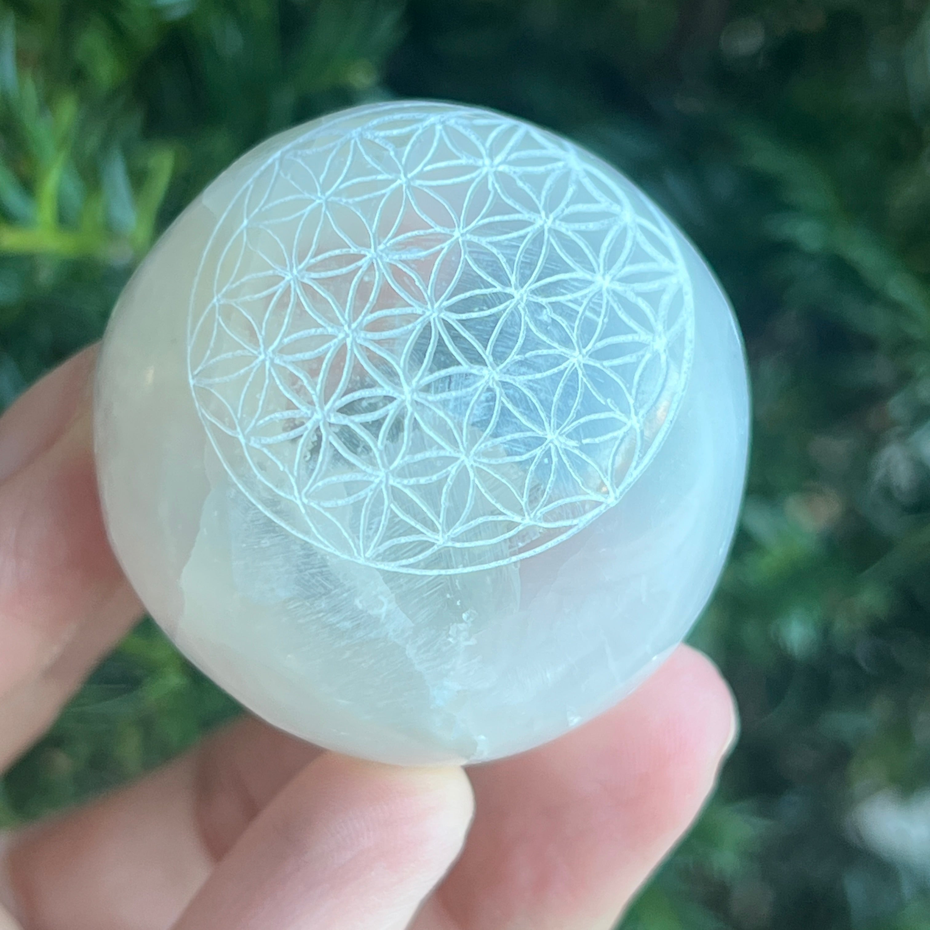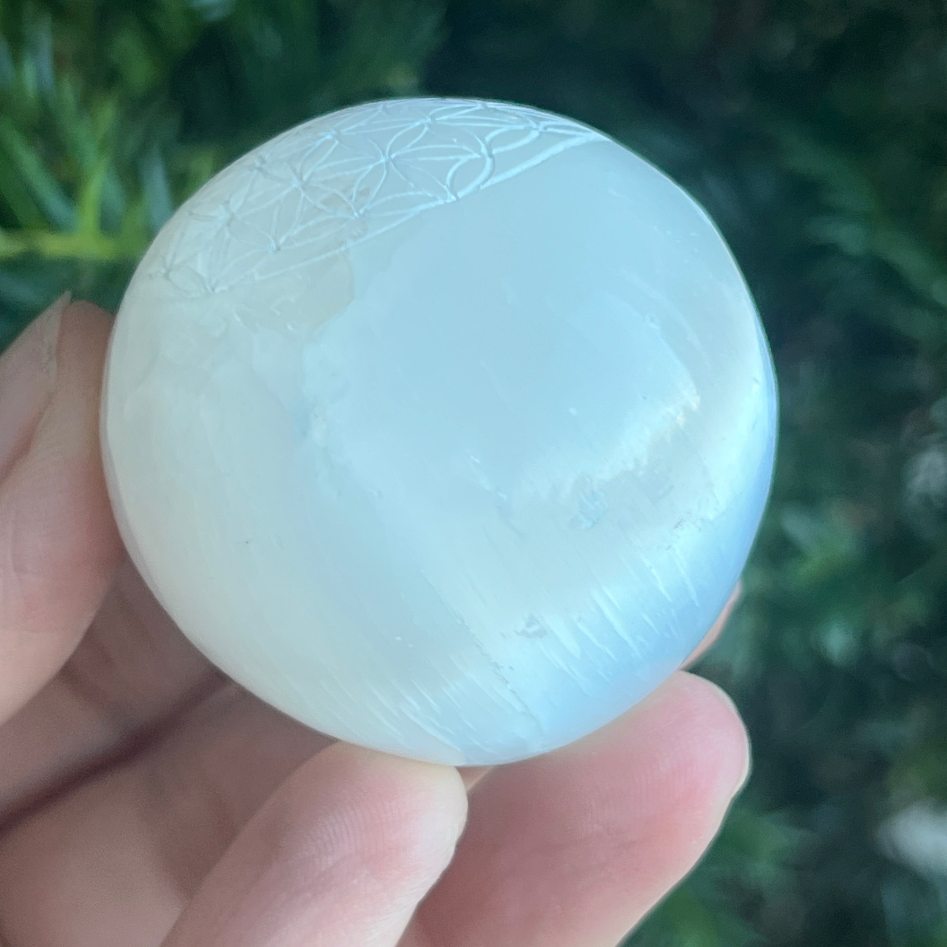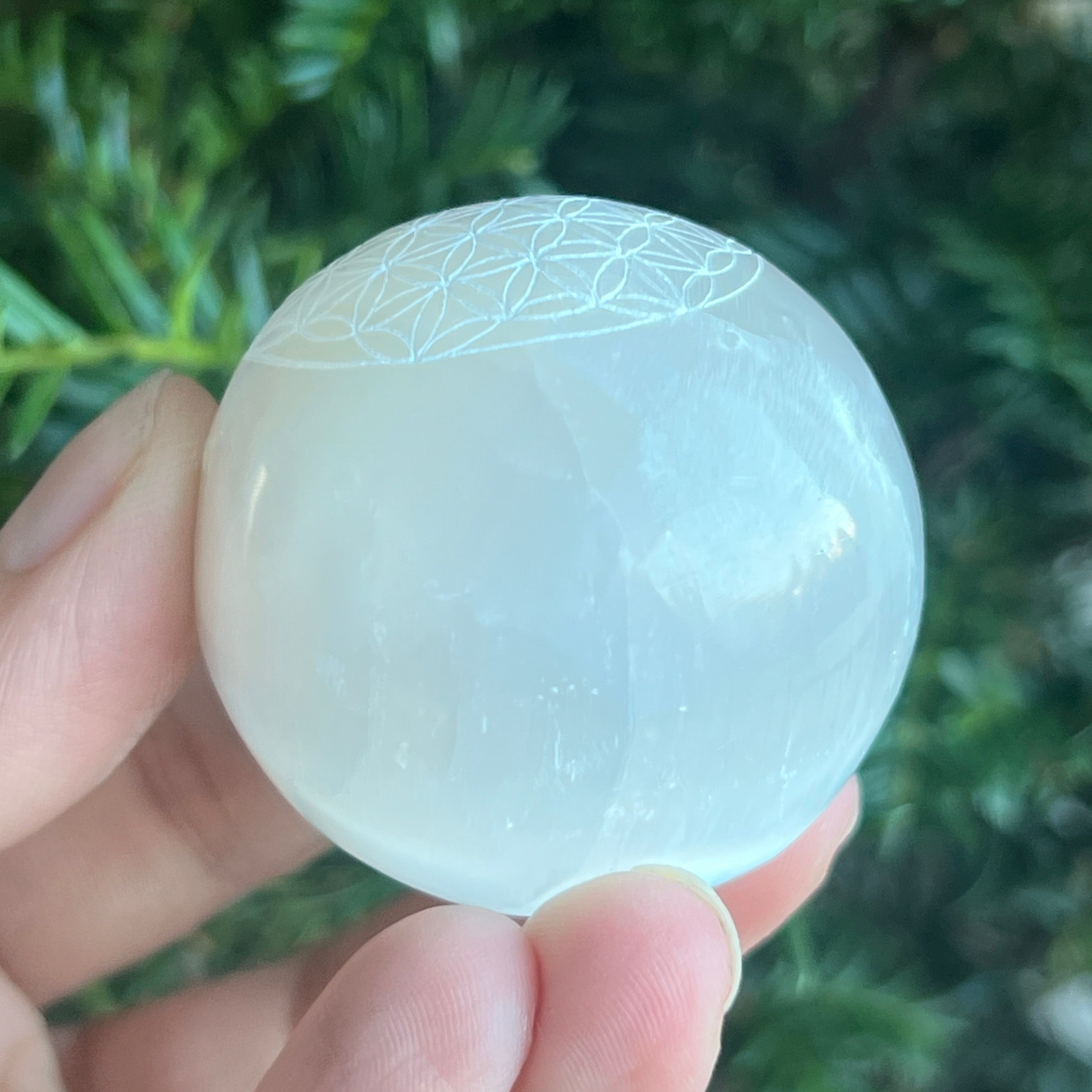 Sphere from Természetes szelenit -val vésve Az élet virága / Az élet virága gyengéd, világító és tisztító energiát sugároz. A gömb alakú forma a teljességet, az egységet és az egyetemes egyensúlyt szimbolizálja, míg a szent metszet a Az élet virága / Az élet virága erősítse fel ezt a harmóniát a teremtés tökéletes geometriájával.