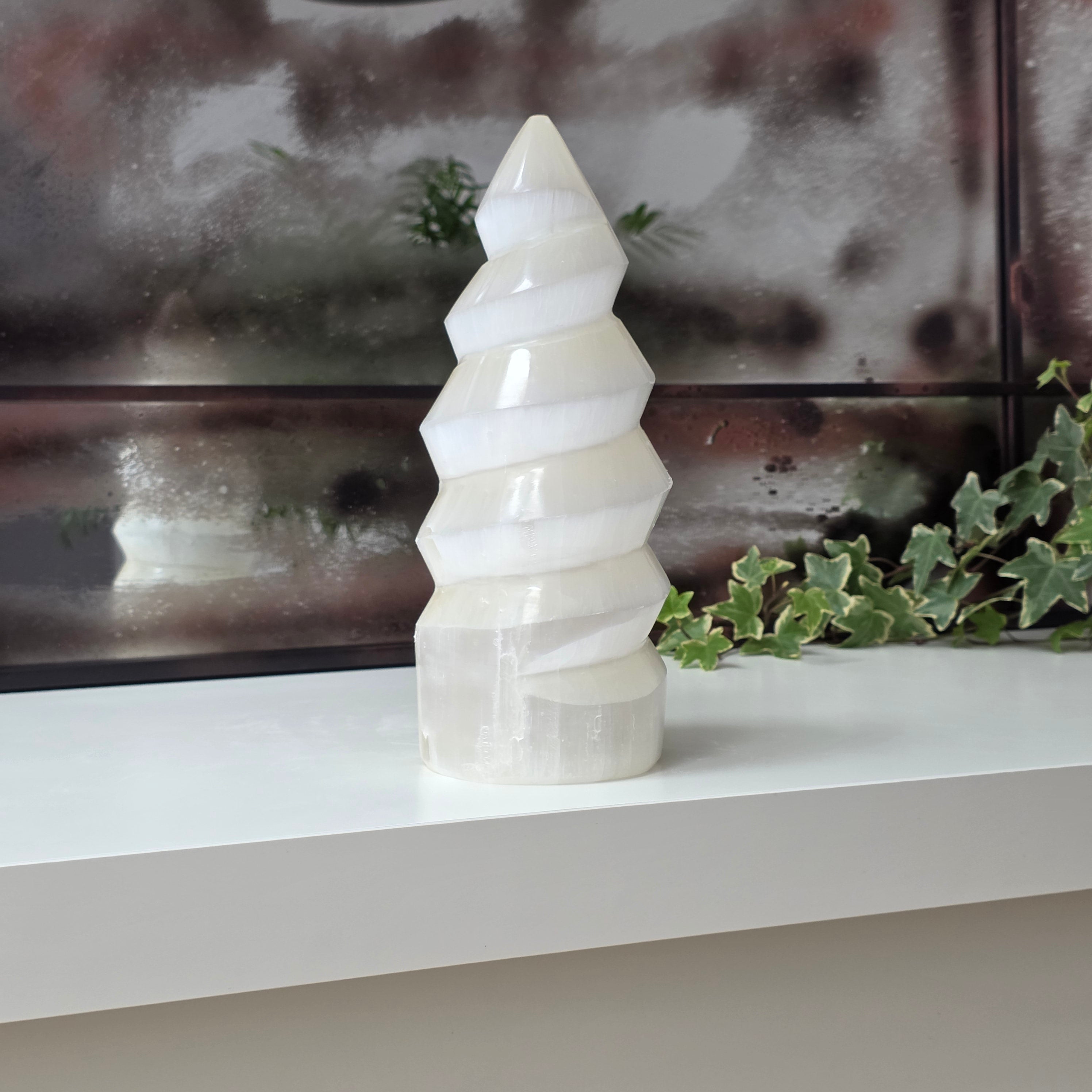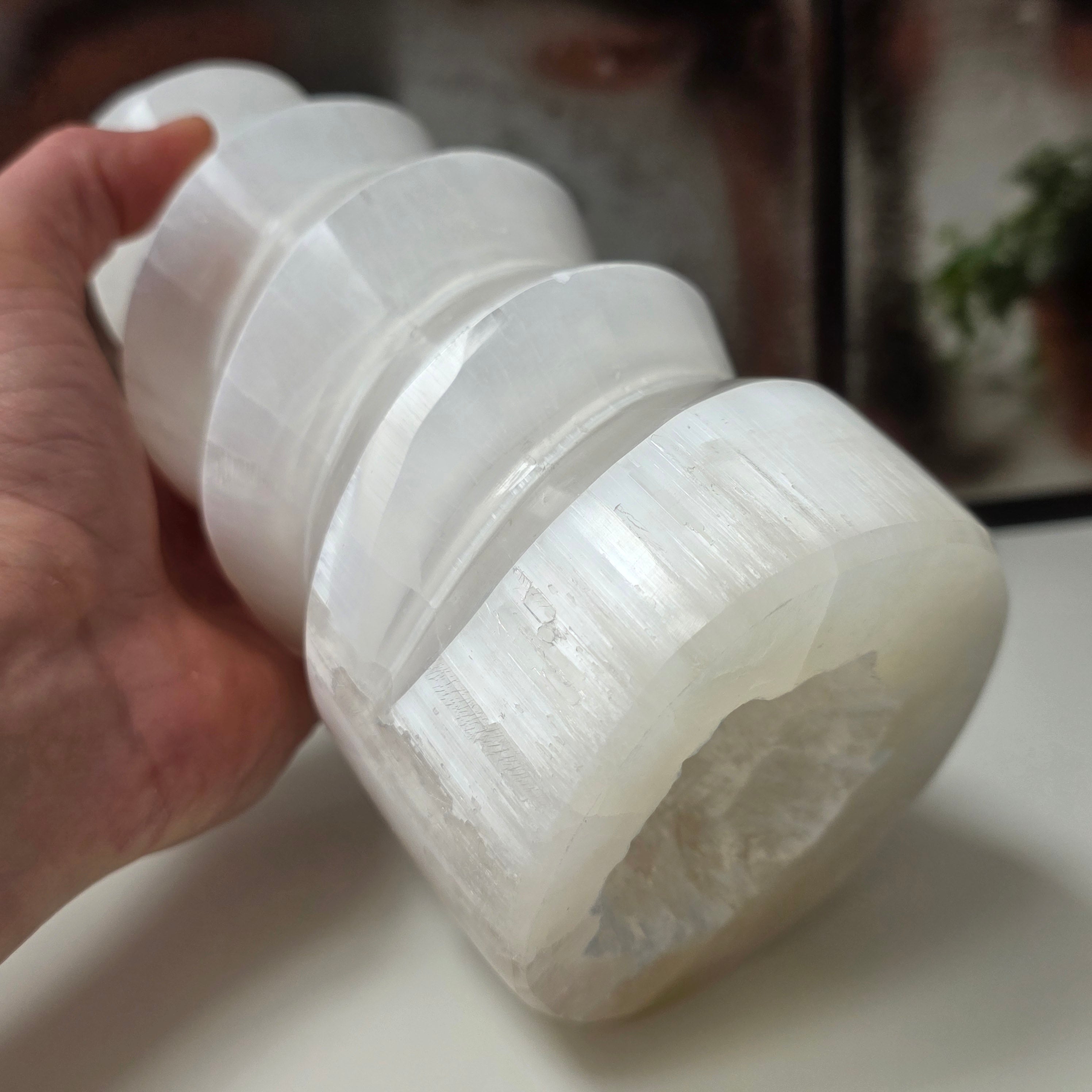 Ez a természetes szelenitből készült toronygyertyatartó varázslatot és fényt visz minden térbe. A szelenit a tisztaság és a belső béke kövének számít.