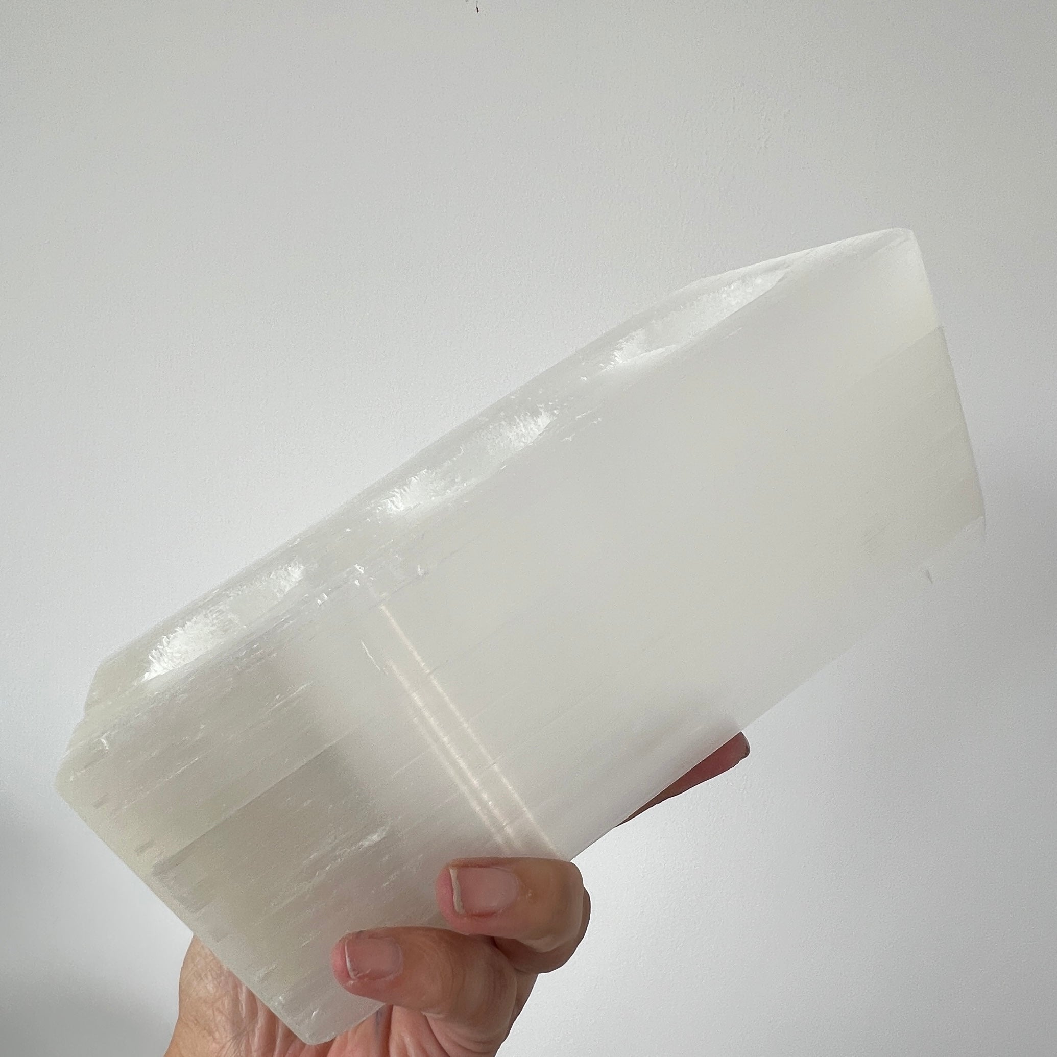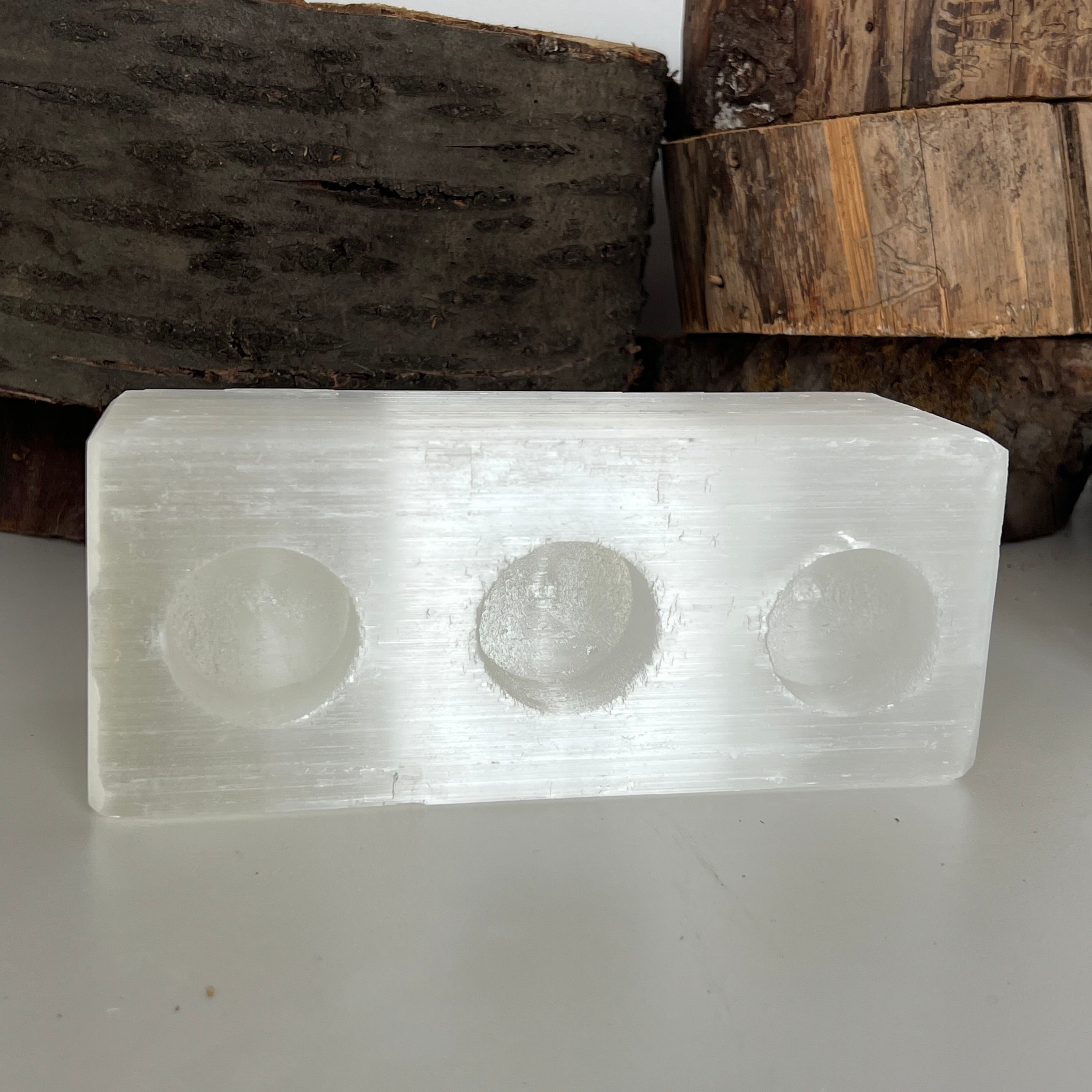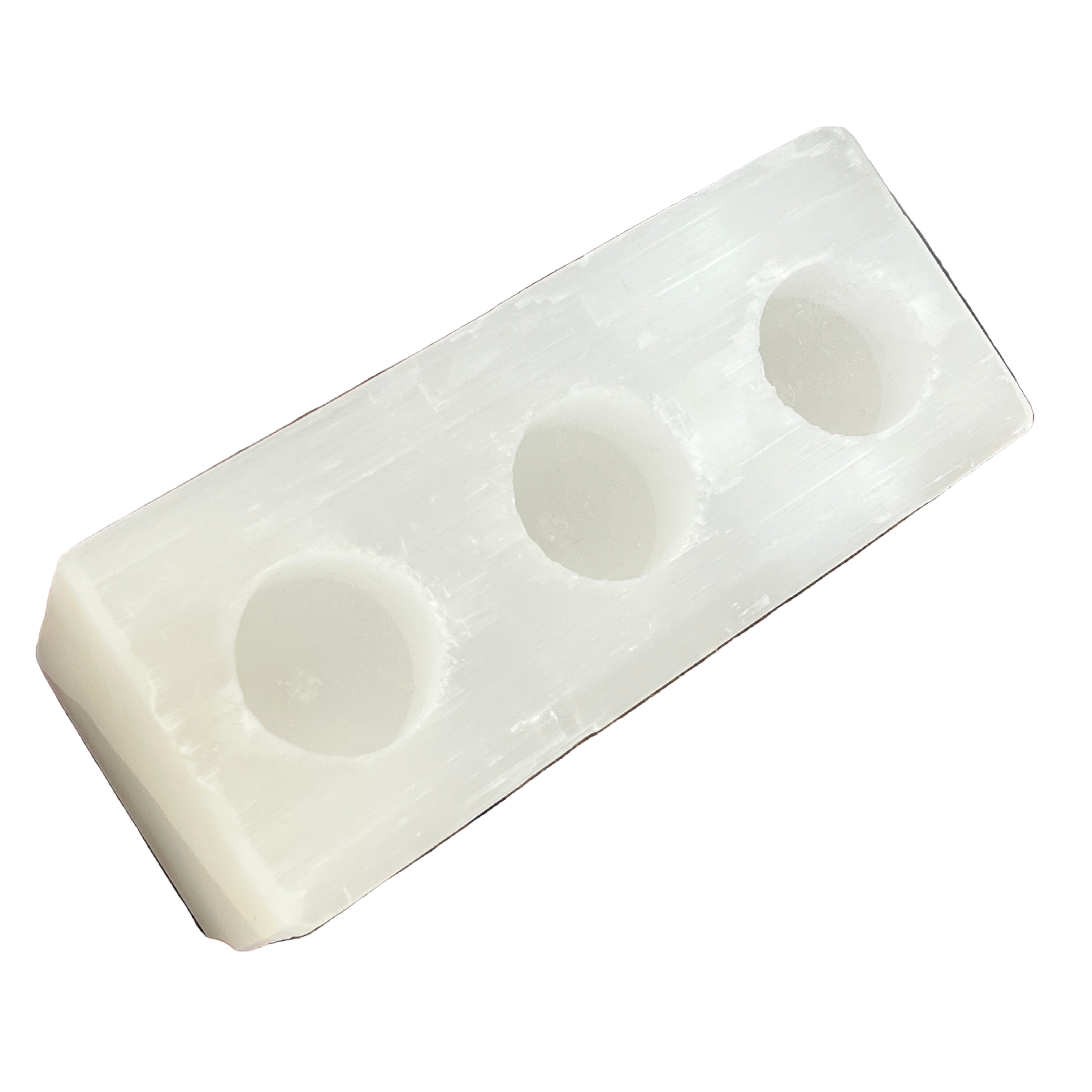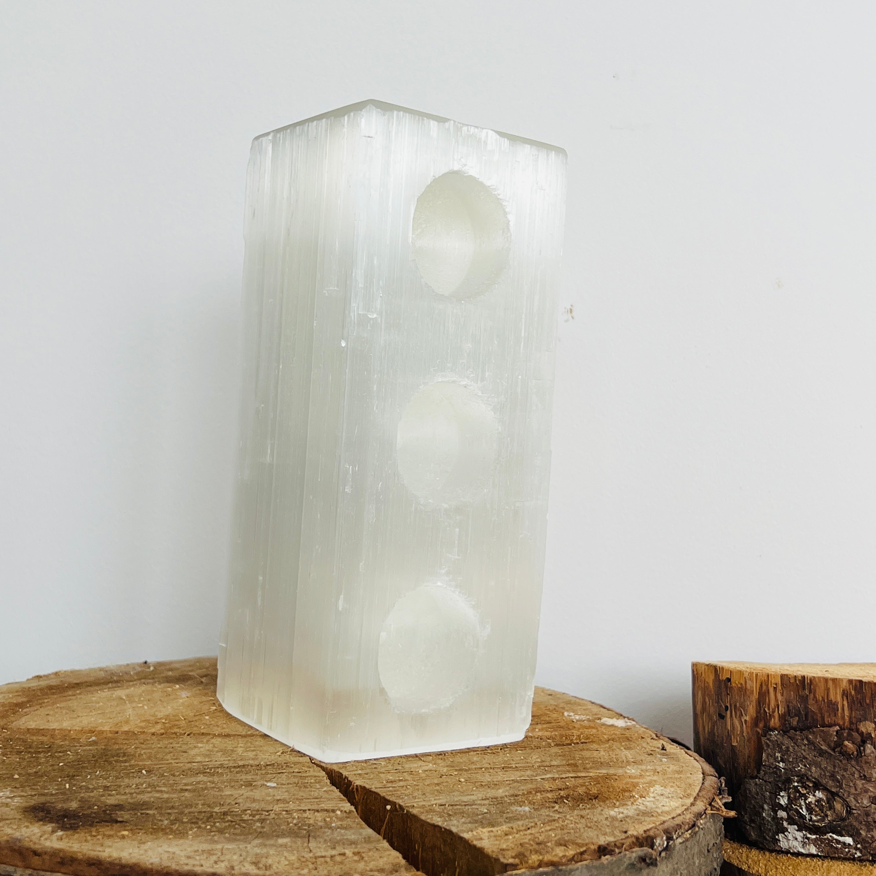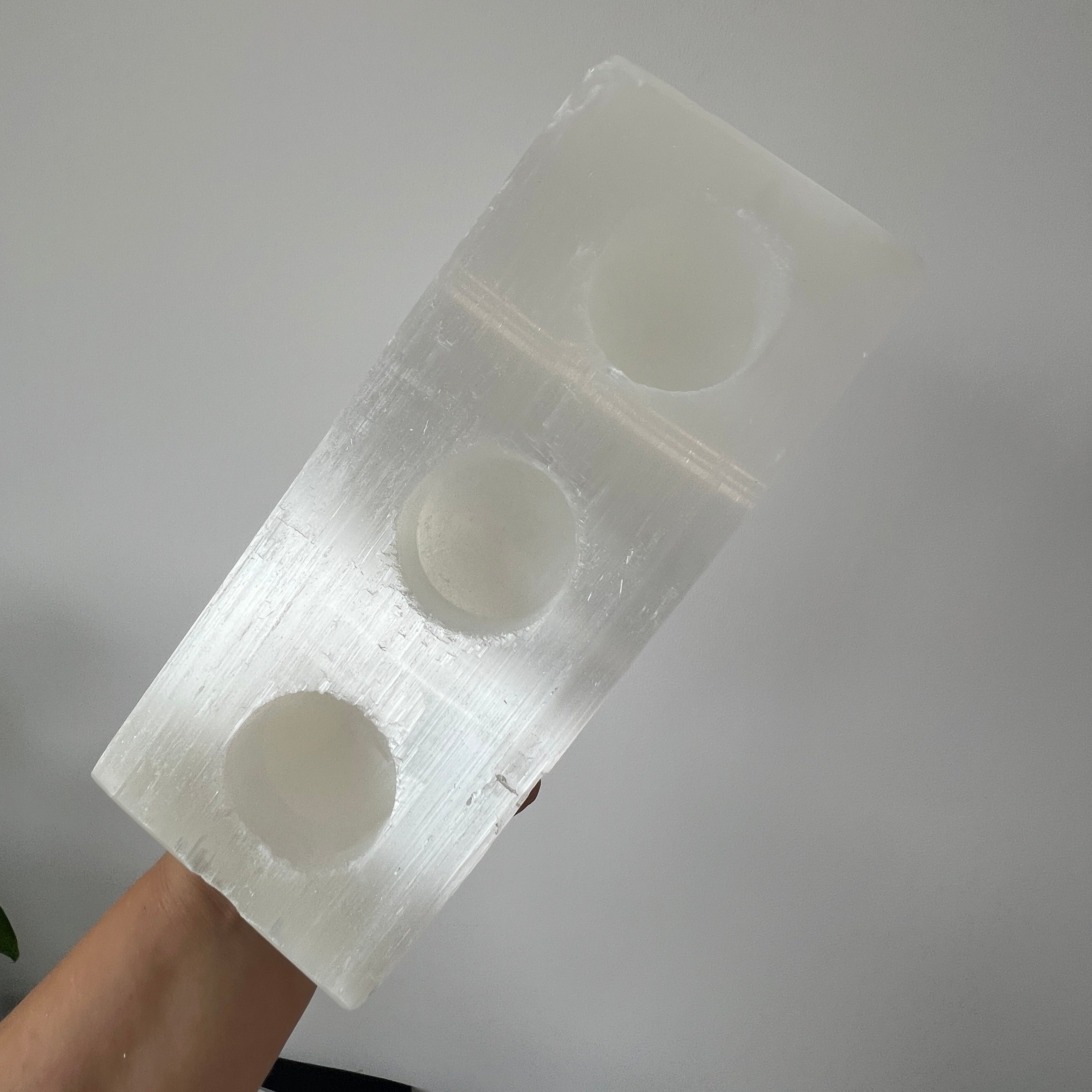 Ez a szelénit gyertyatartó elegáns és szimbolikus dekorációs darab. A 3 különleges gyertyatartó hely meleg és egyenletes fényt hoz létre, amely tükröződik a szelénit áttetsző szerkezetében, gyönyörű vizuális élményt nyújtva.