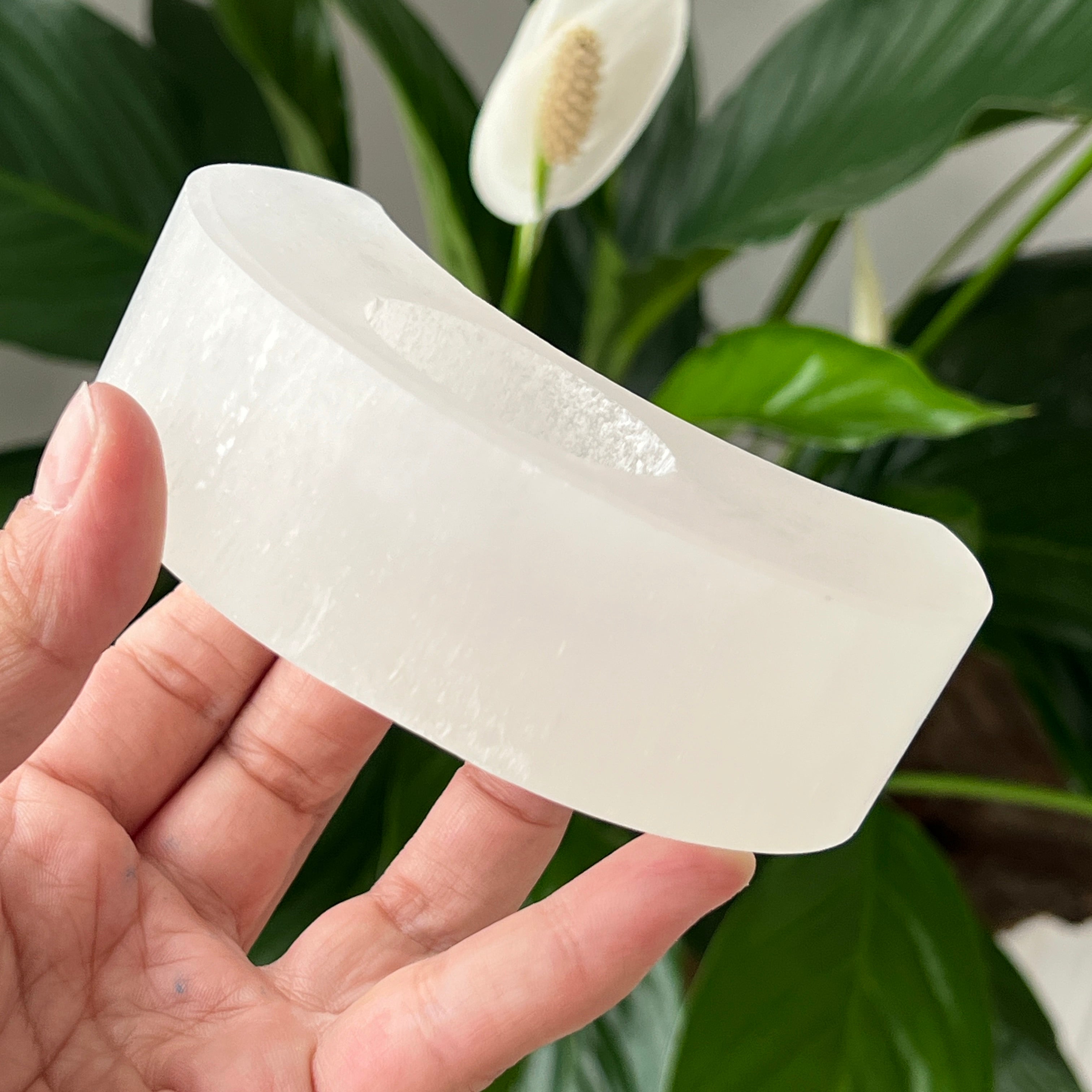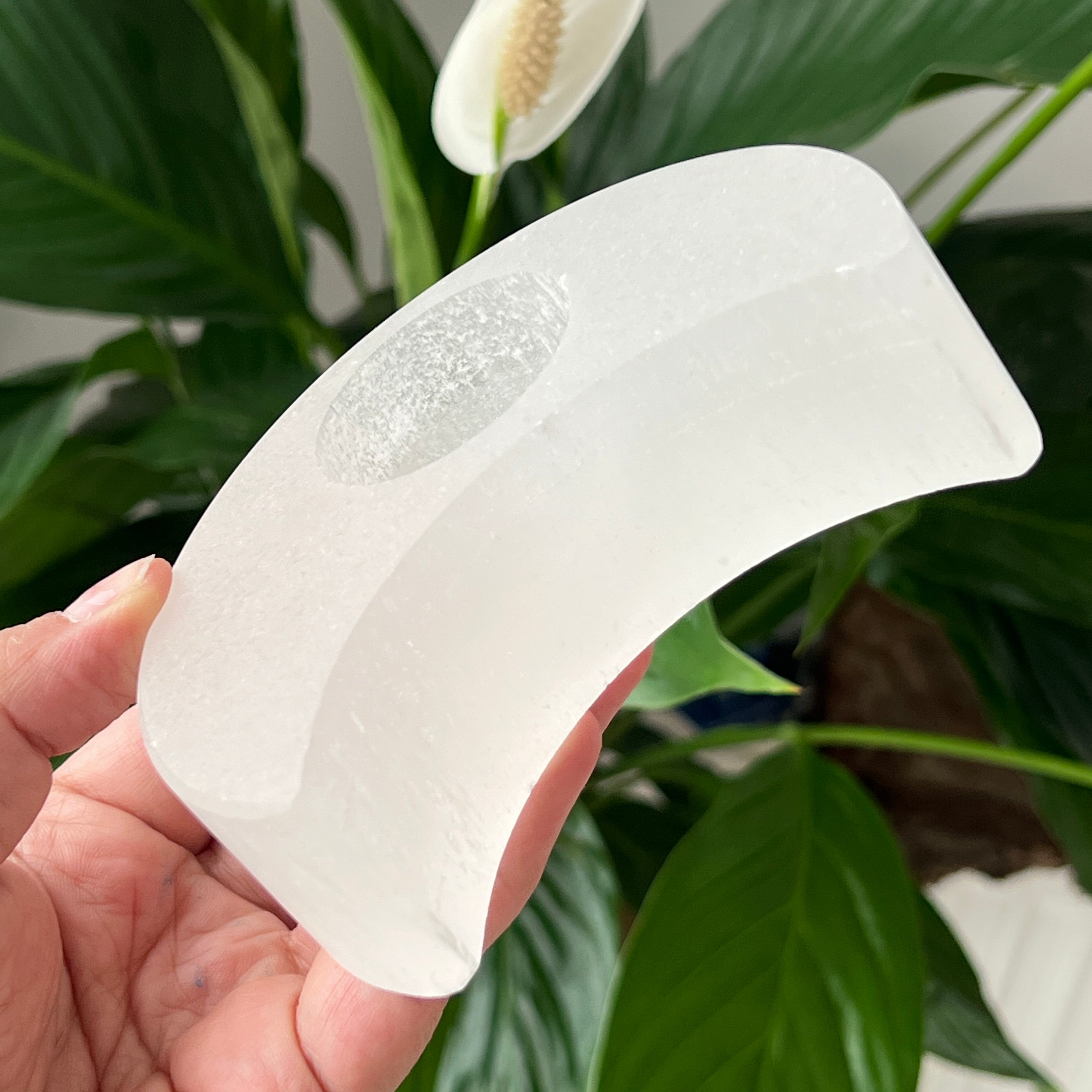 Ez a félhold alakú, természetes szelénitből készült gyertyatartó egy csipetnyi varázslatot és fényt hoz bármely térbe. A hold a nőiesség, az ismétlődés és az intuíció szimbóluma, és a szelénittel – ami a tisztaság és a belső béke köve – kombinálva mély rezgésű dekorációs darabot alkot.