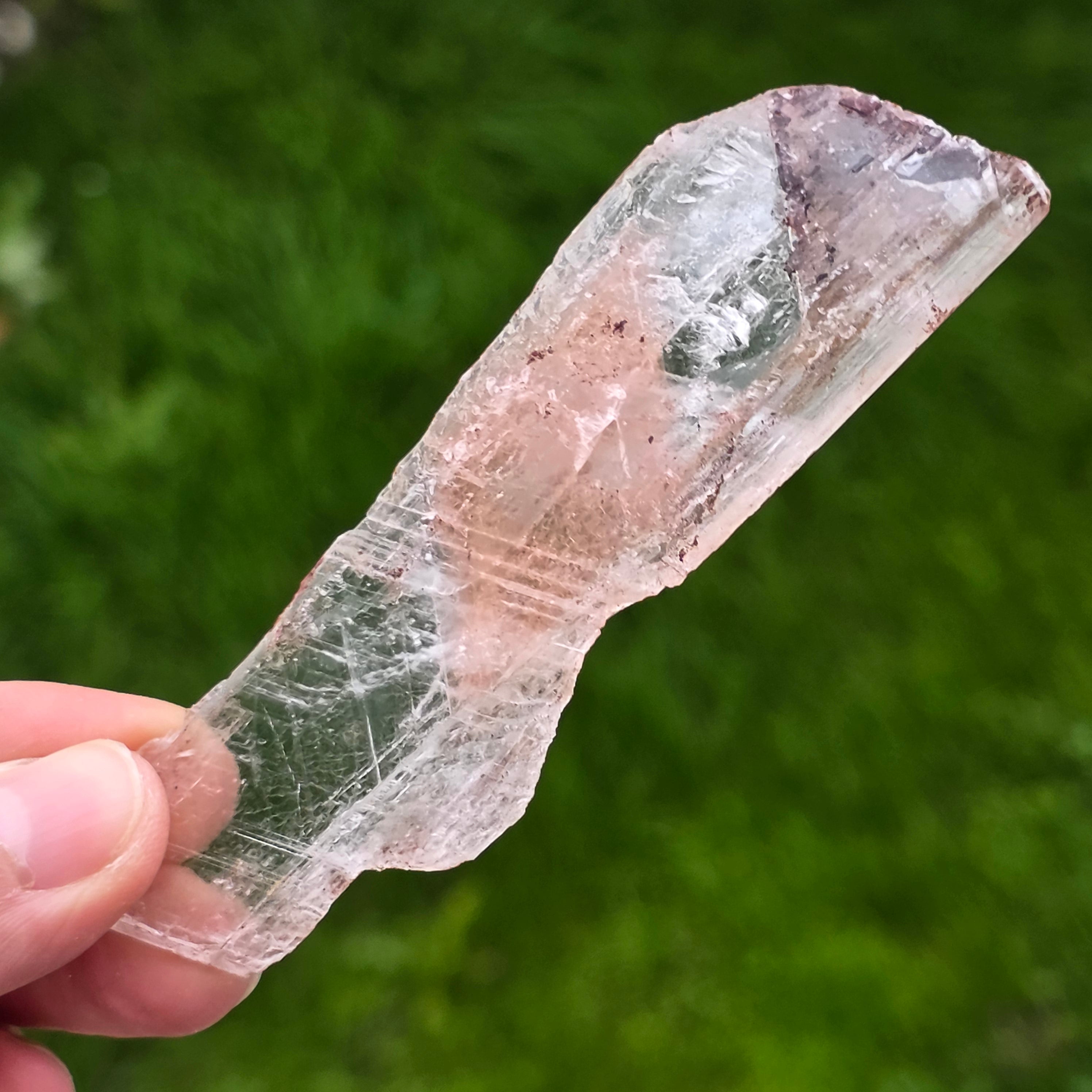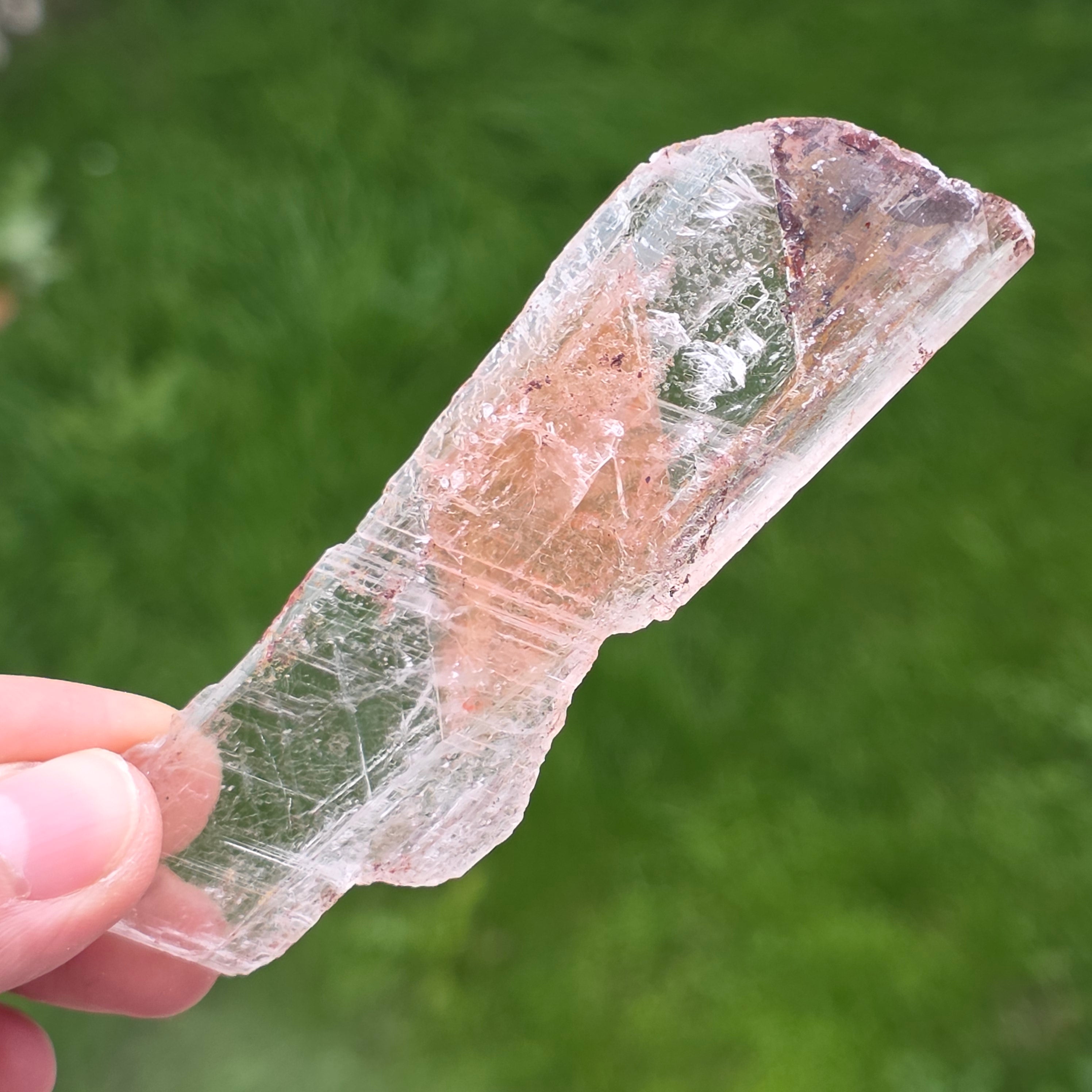 A szelenit formájában fordul elő hosszúkás kristályok vagy áttetsző lemezek, selymes fényű és finom textúrájú, míg a hematit formájában van jelen zárványok, filmek vagy természetes lerakódások, amely kiemeli a kristály szerkezetét és vizuális mélységet ad neki.