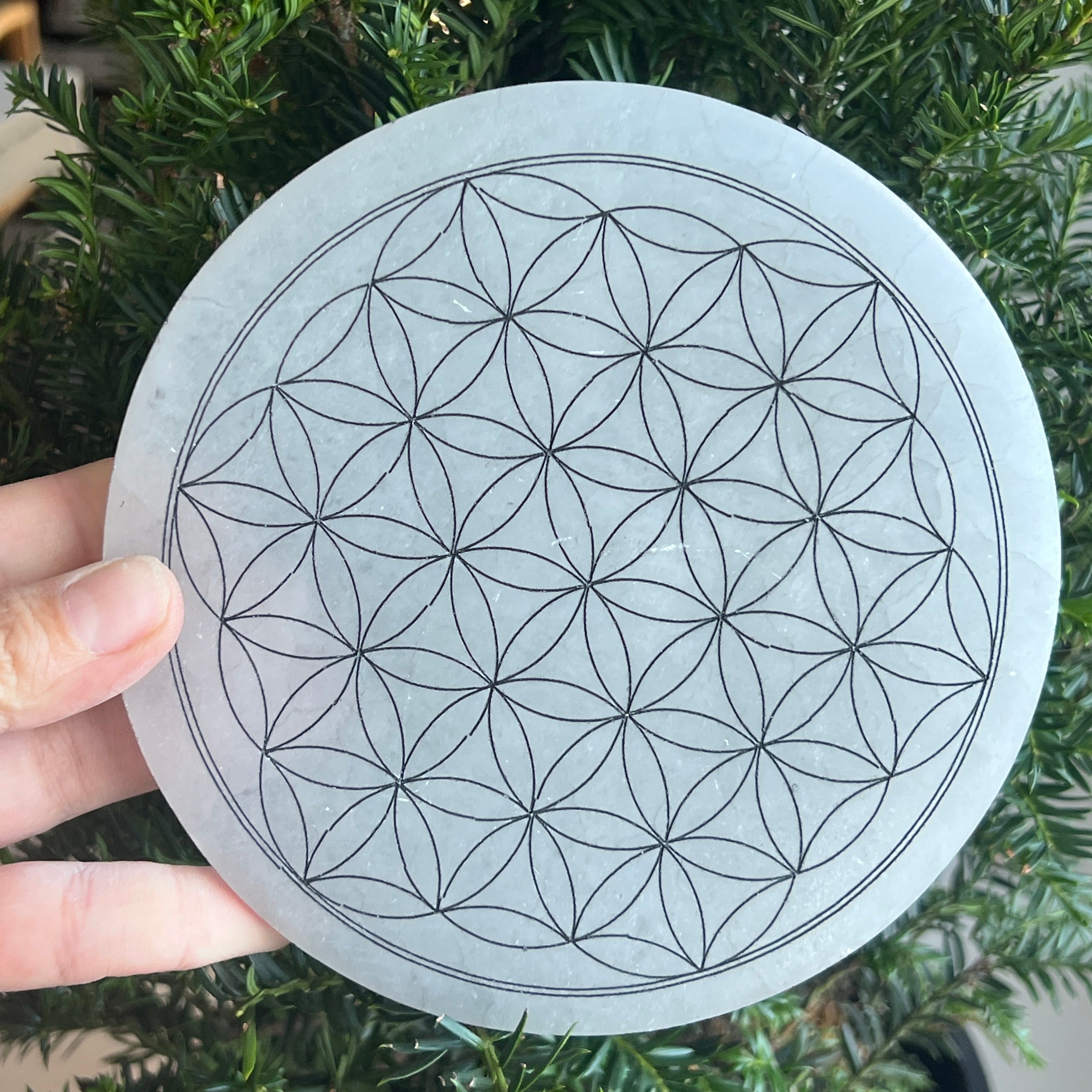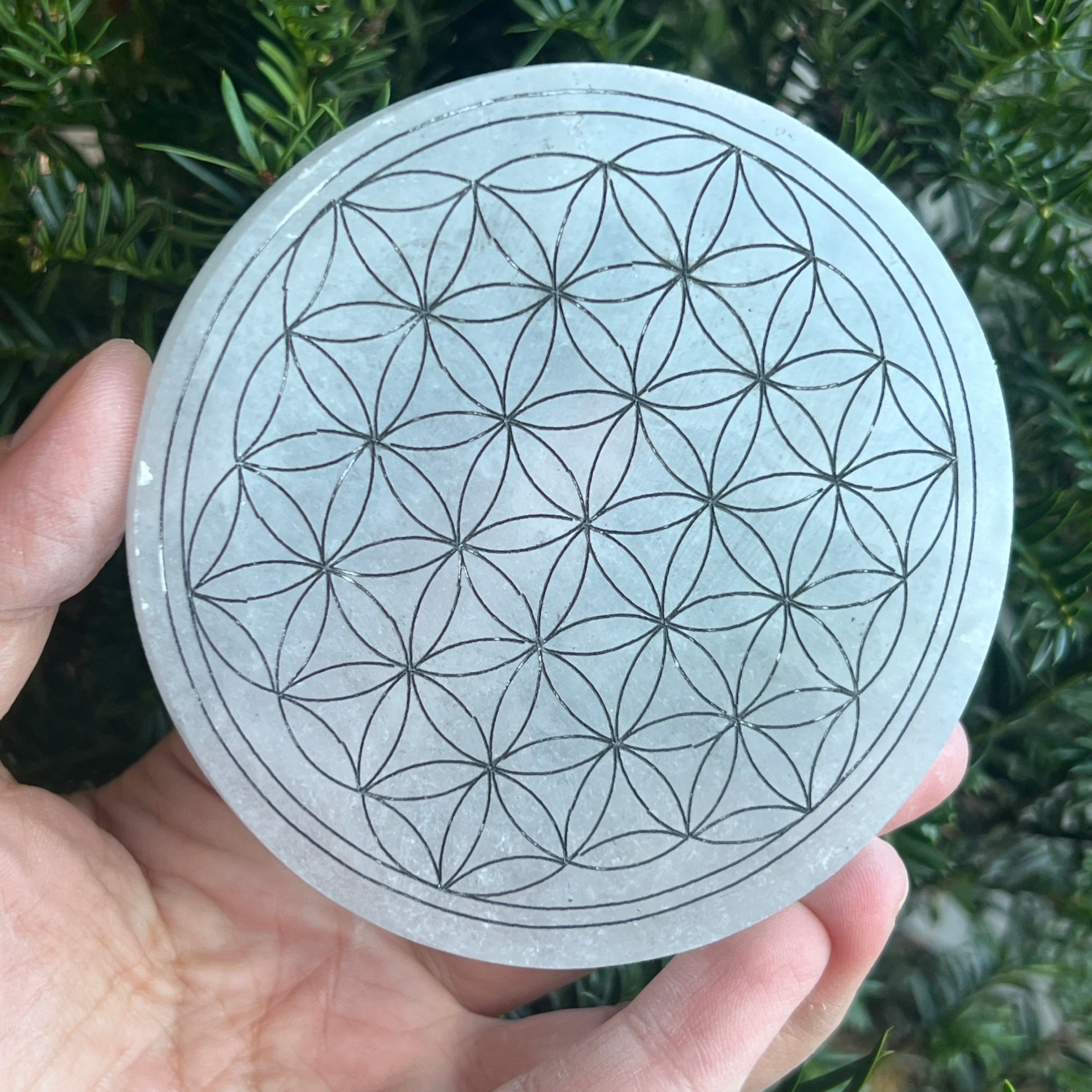Ez a természetes Szelénit korong, melyre az Élet virága / Flower of Life lett gravírozva, a fény és a szent geometria darabja, egy energetikai harmonizáló eszköz, amelyet mind a spirituális dekorációban, mind a meditációs gyakorlatok során használnak.