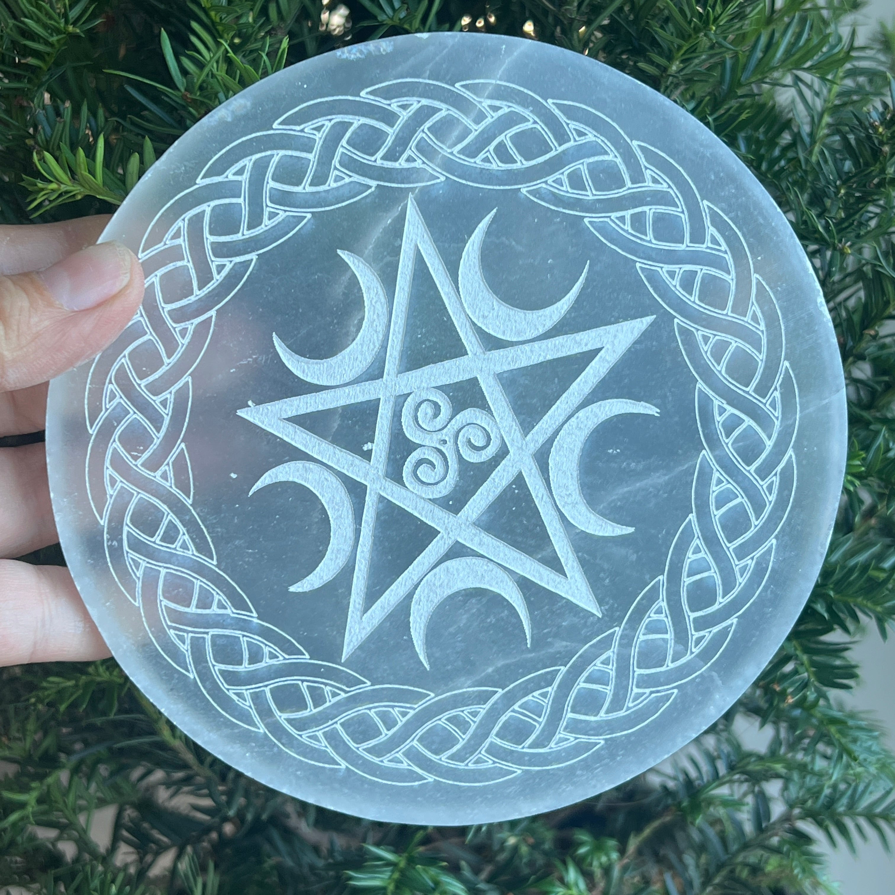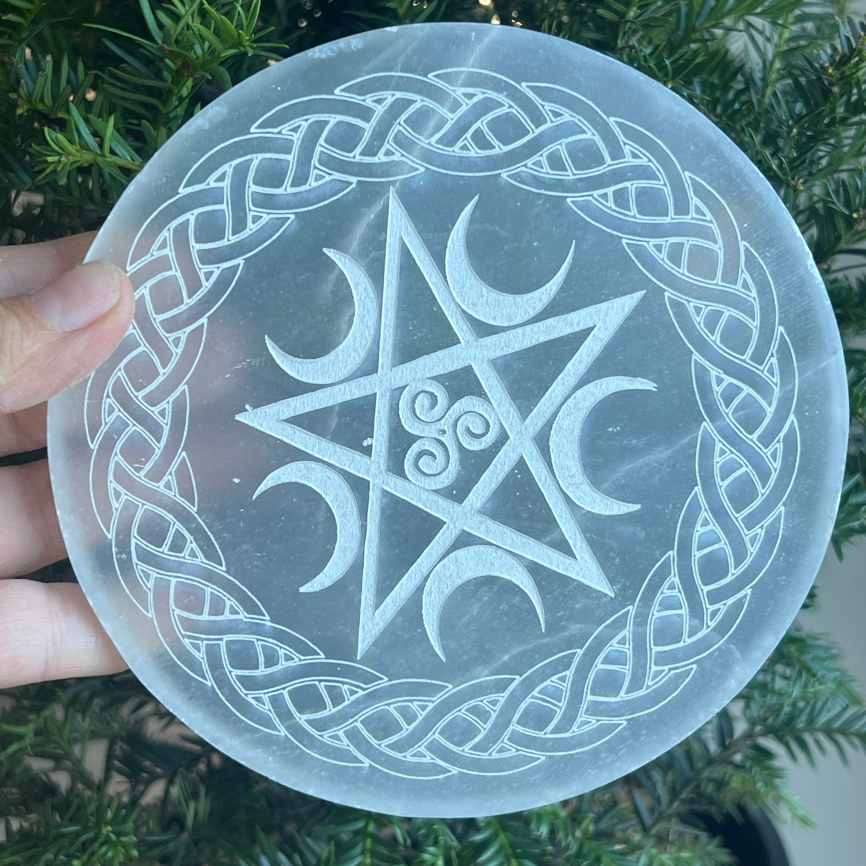A szent szimbólumokkal díszített Szelenit korong ideális kristályrácsokhoz, kristályok tisztításához, meditációhoz vagy központi elemként egy pihenőhelyiségben. Elhelyezhető hálószobában, nappaliban vagy irodában a nyugodt és tiszta légkör fenntartására.