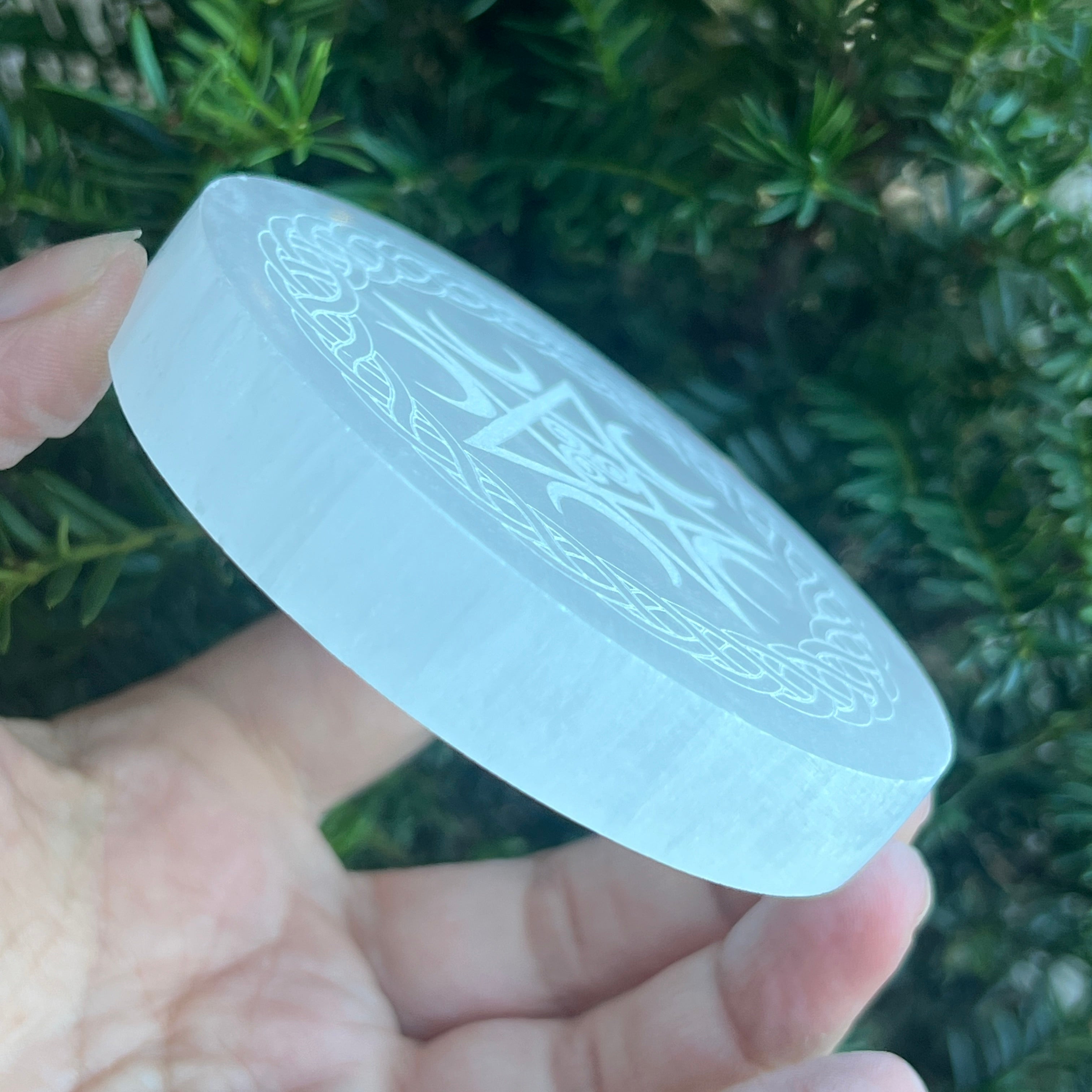 Válaszd most a Szent szimbólumokkal gravírozott szelenit korongot és hozd el otthonodba a védelmet, tisztaságot és fényt sugárzó rezgést. Egy elegáns és mélyen szimbolikus darab, amely a Föld tiszta energiájából született. 🤍✨