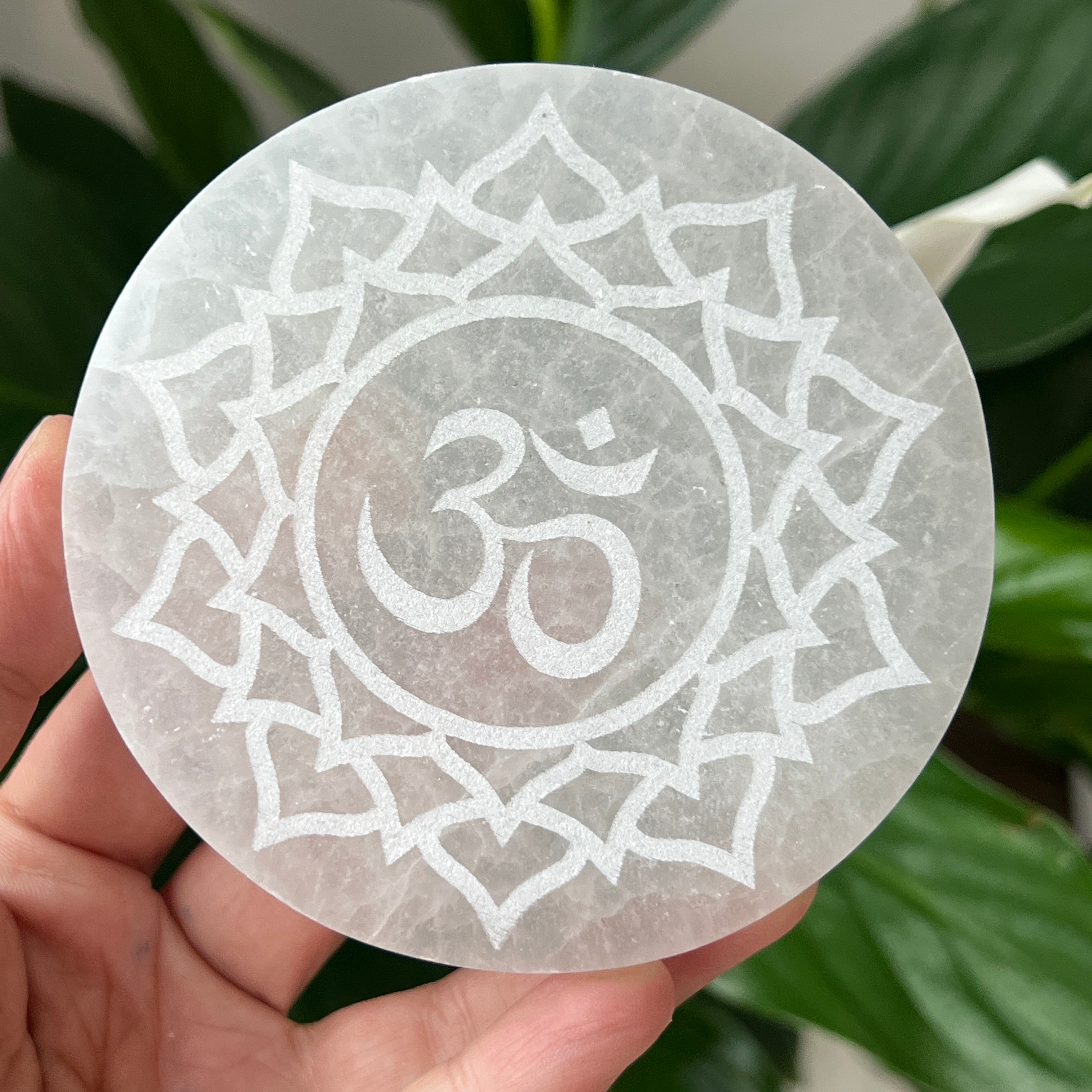 Ez a szelénit lemez, amelyet az Om szent szimbólummal gravíroztak, egy rendkívül szép és spirituálisan töltött darab. Az Om mandala az univerzum ősi rezgésétképviseli, az egység és a belső harmónia szimbóluma.