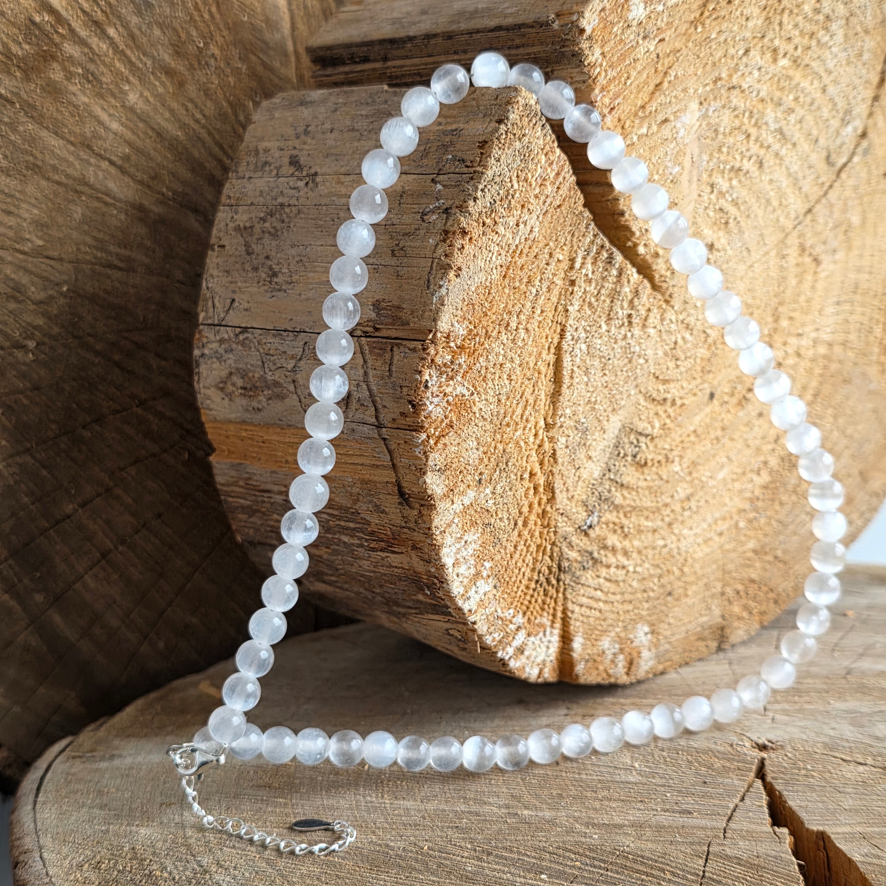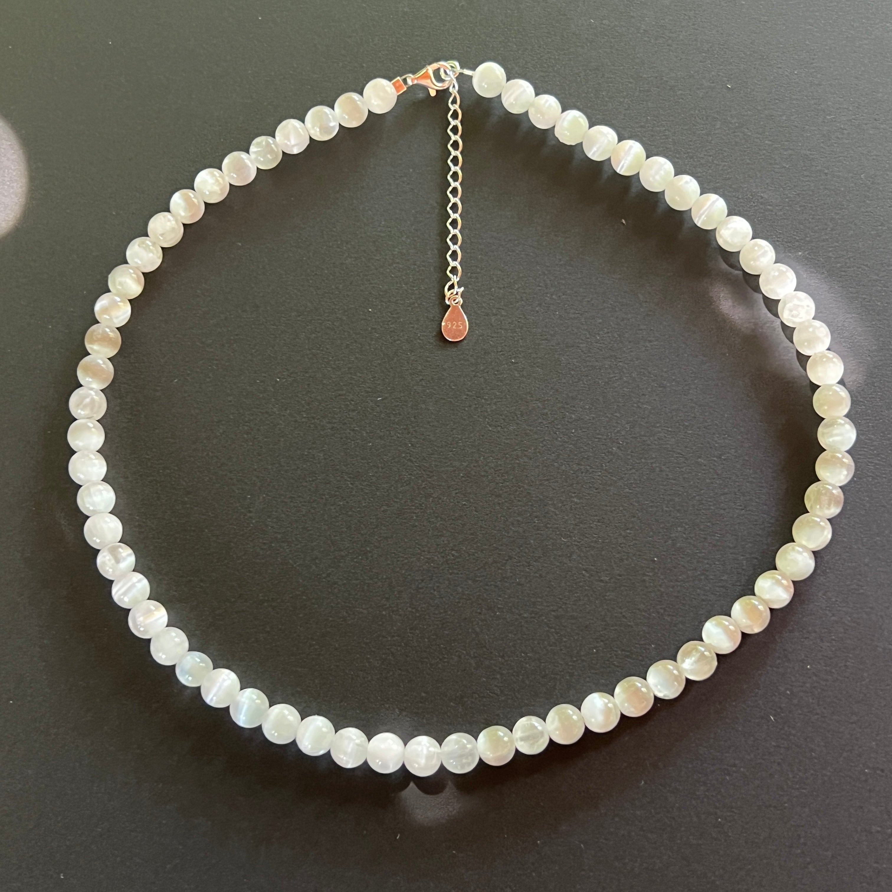 Egy nyaklánc, mint egy sugár, amely anyagba hullott – tökéletesen gömb alakú, 6 mm-es természetes szelénit gyöngyökből áll, amelyek mindegyike magában hordozza egy csendes, fehér reggel tisztaságát. A bársonyos és áttetsző felület szinte valótlan finomsággal tükrözi a fényt, mintha nyugalmat lélegezne.