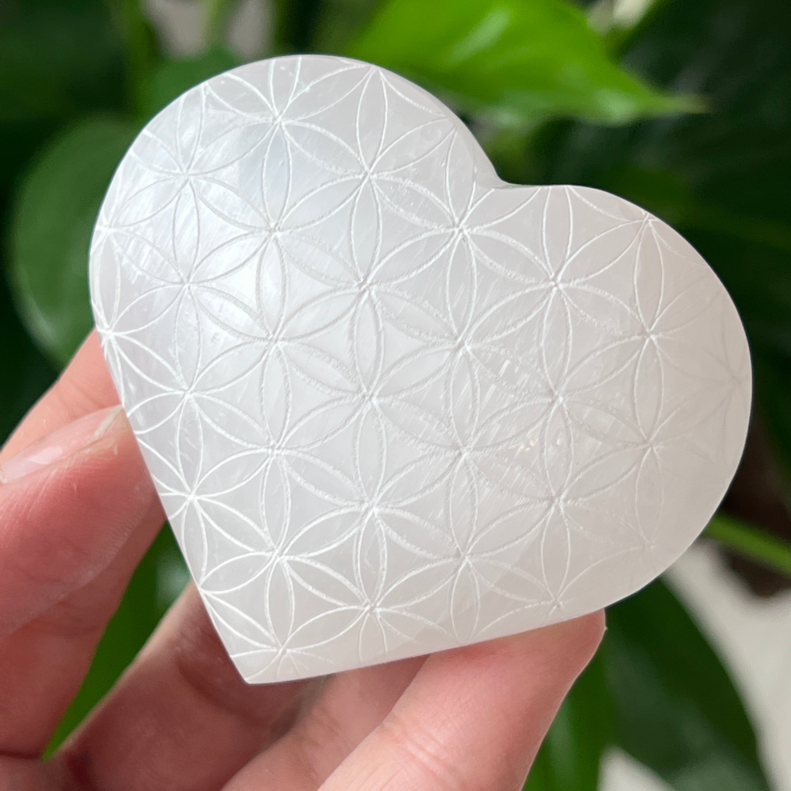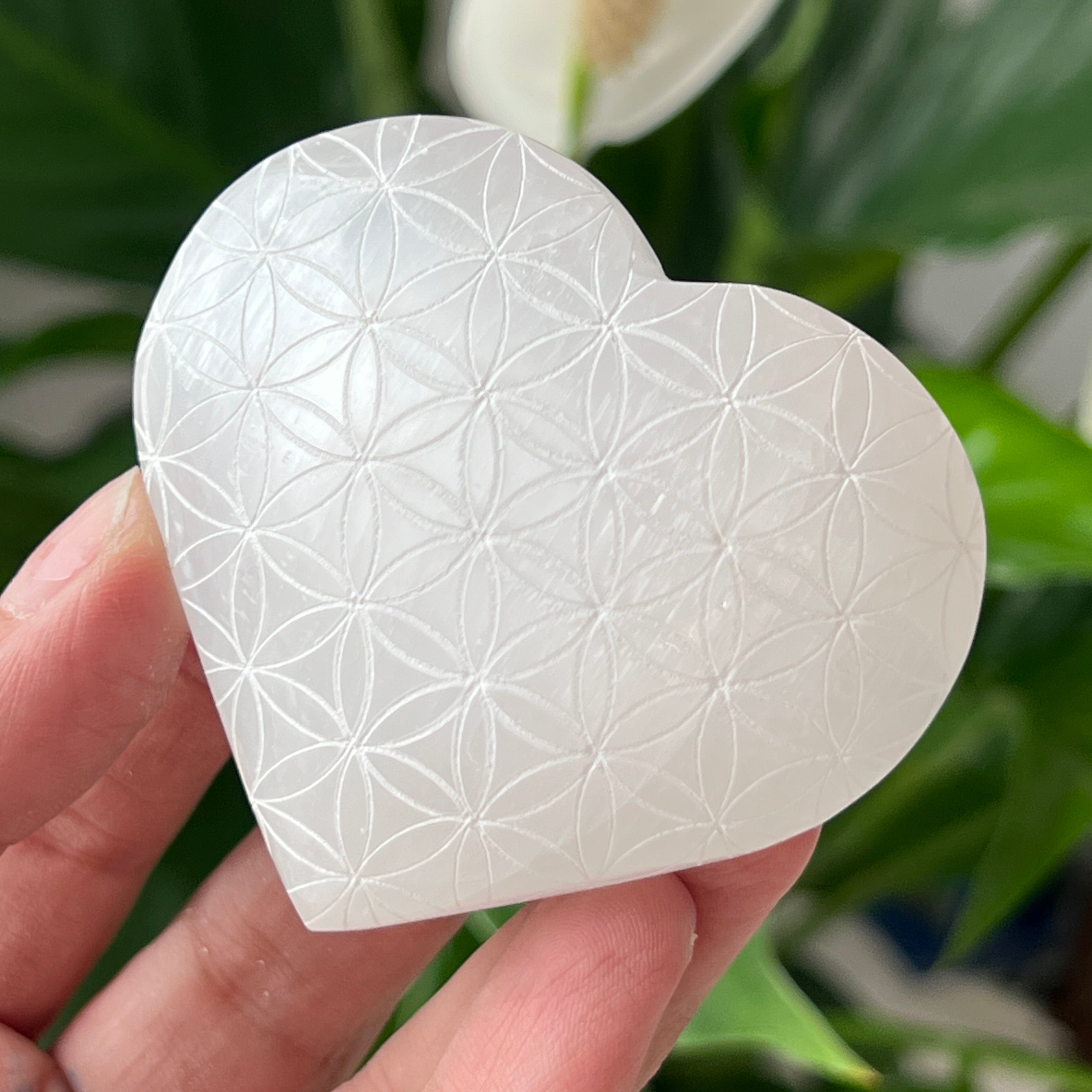 Ezt szelenit szívbe vésve az Élő Virágte / Élet Virága ez a finom szépség darabja és az egyetemes kapcsolat erőteljes szimbóluma. Az Élet Virágát a a harmónia, az egyensúly és a kozmikus energia szent archetípusa, a szelenit pedig a megtisztulás és tisztaság kristálya.