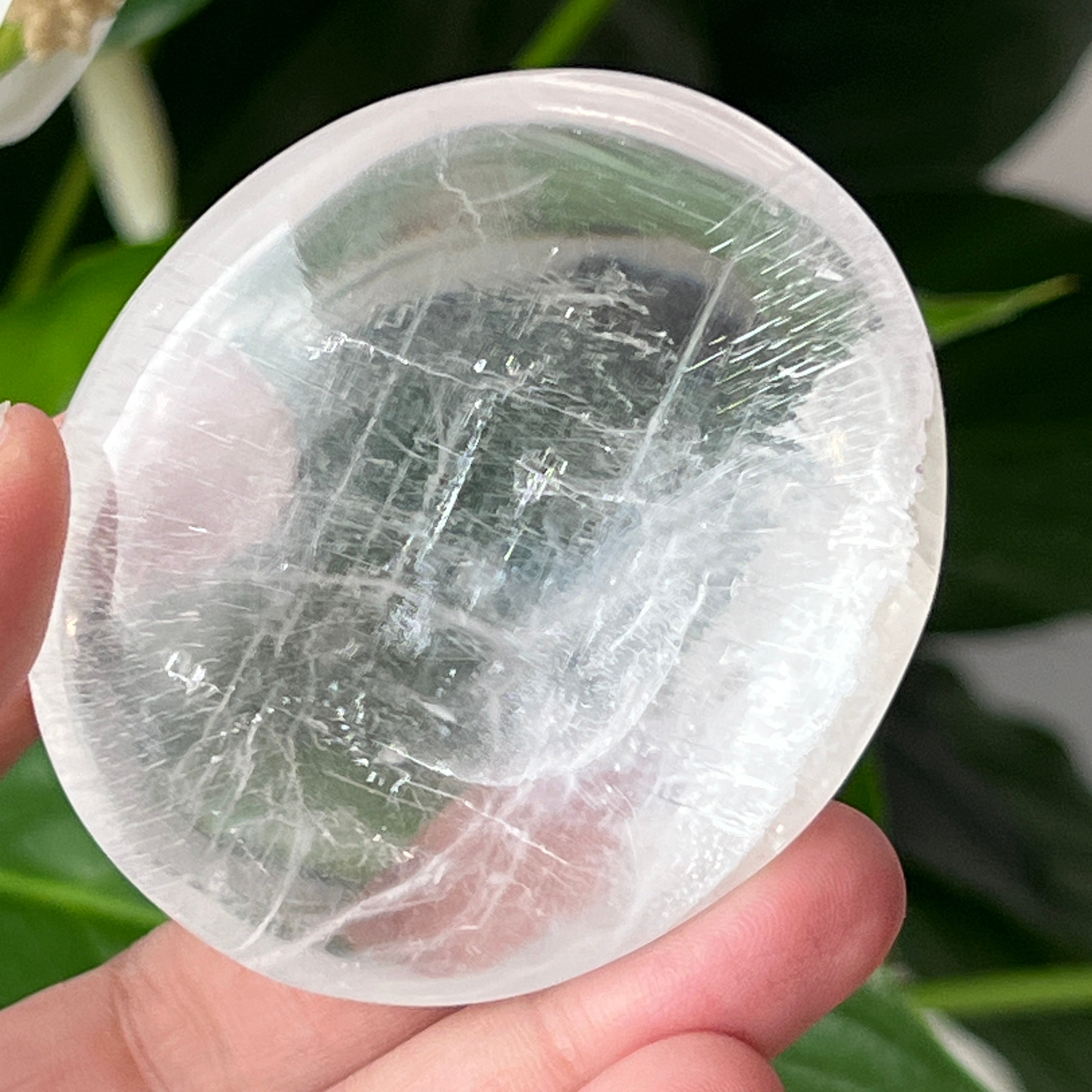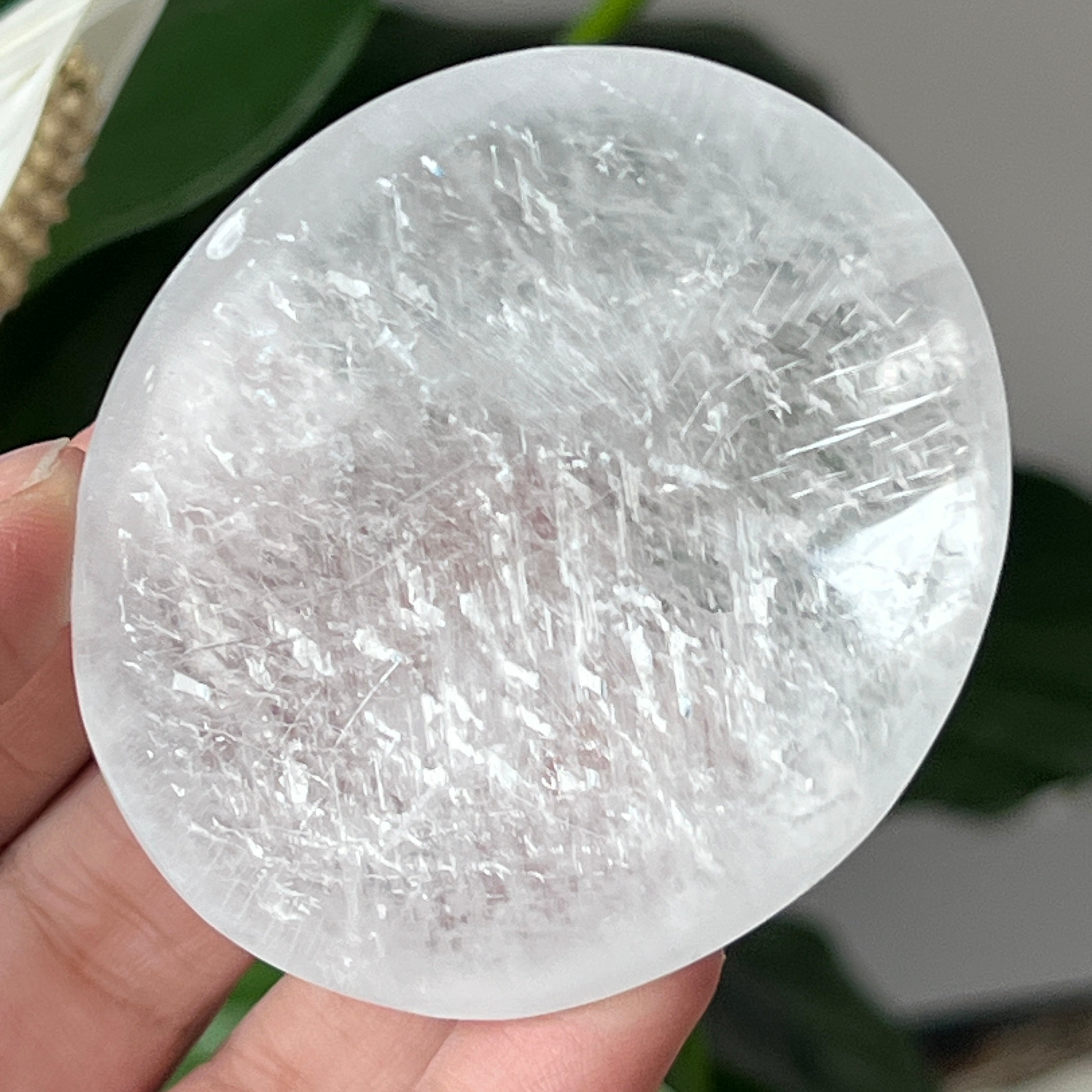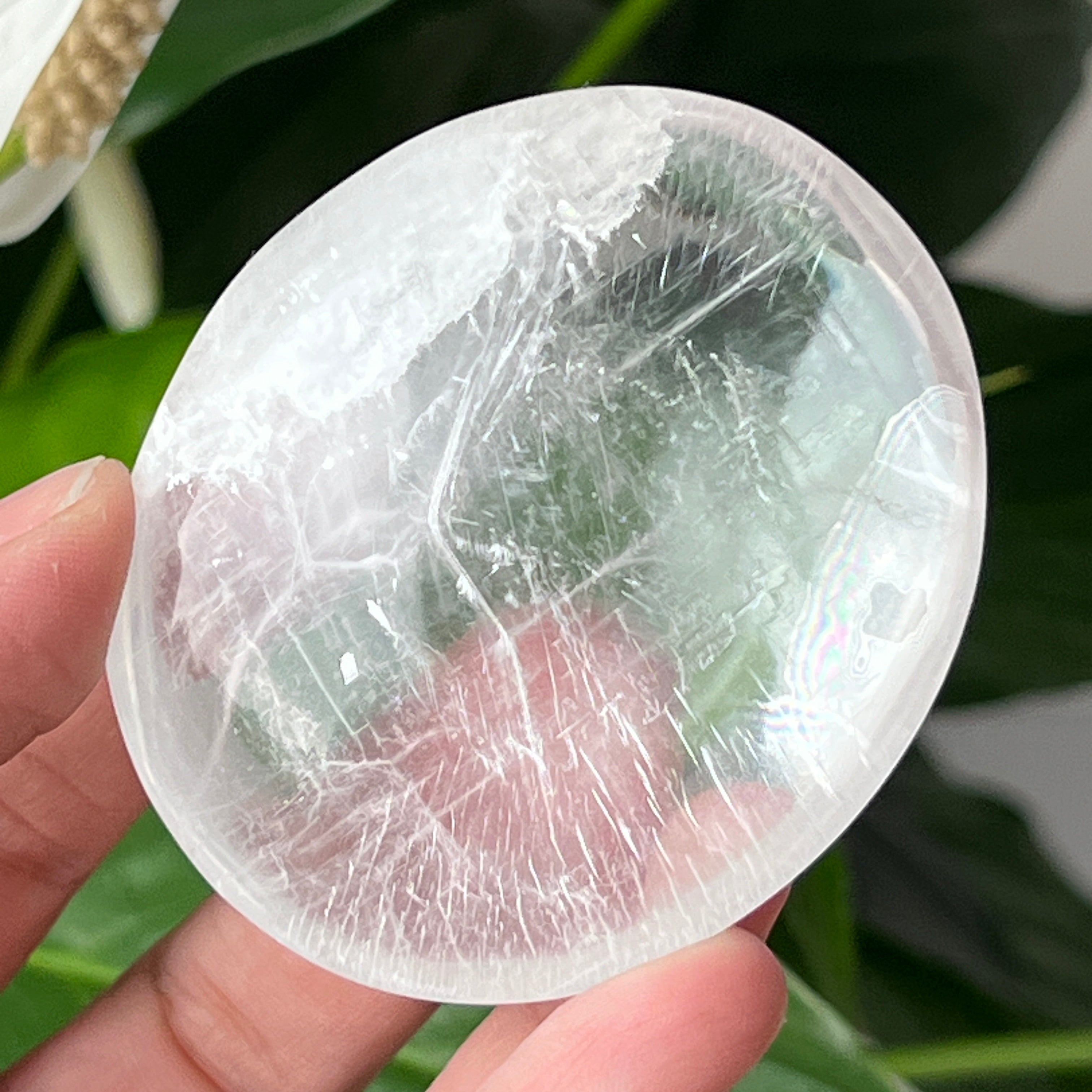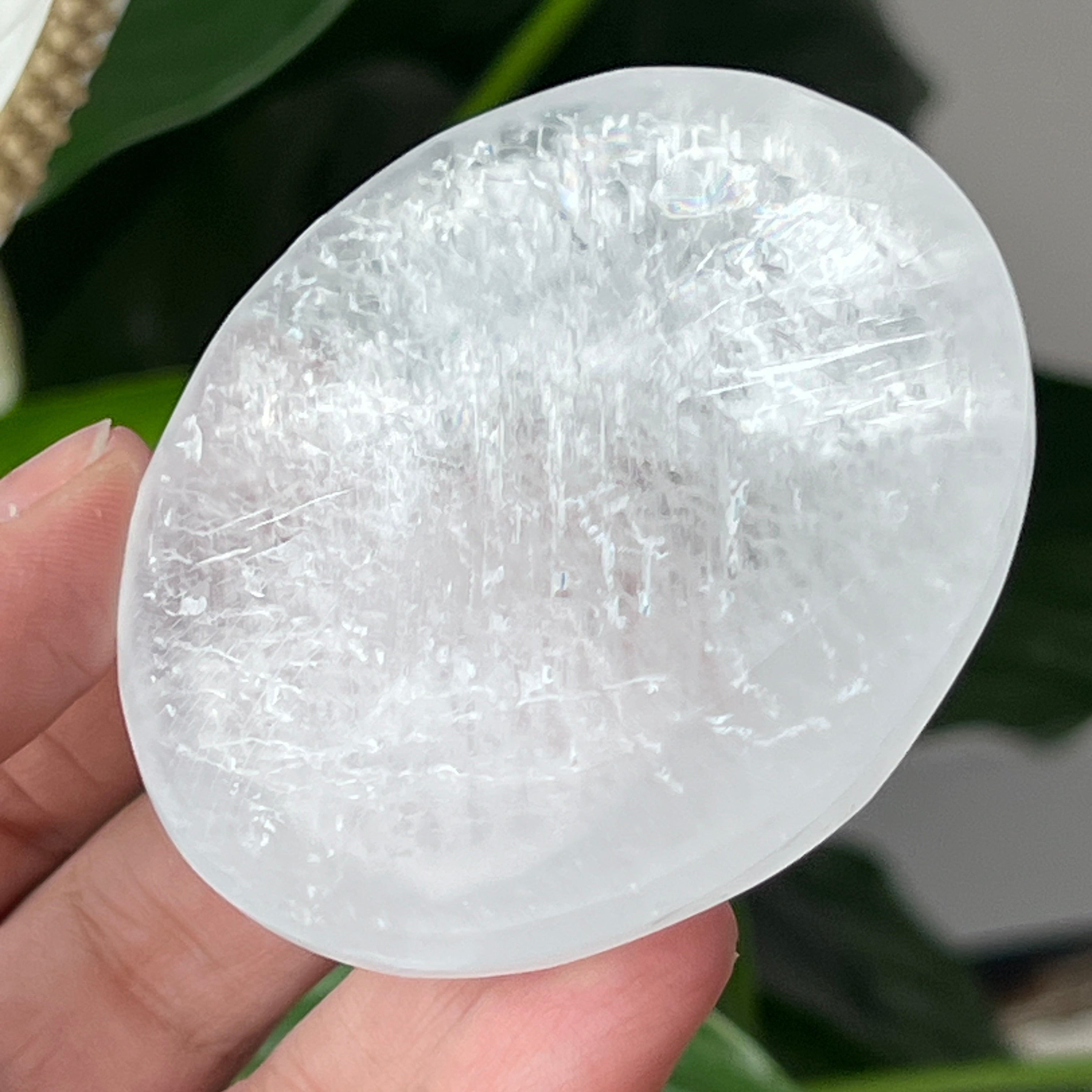 Ezt ovális szelenit üveges felülettel Marokkóból származik, és lenyűgöz áttetsző textúrájával és finom fényével. Az ovális forma, más néven "szappan" vagy pálmakő, ideális a tenyérben tartáshoz meditáció vagy relaxációs rituálék során.