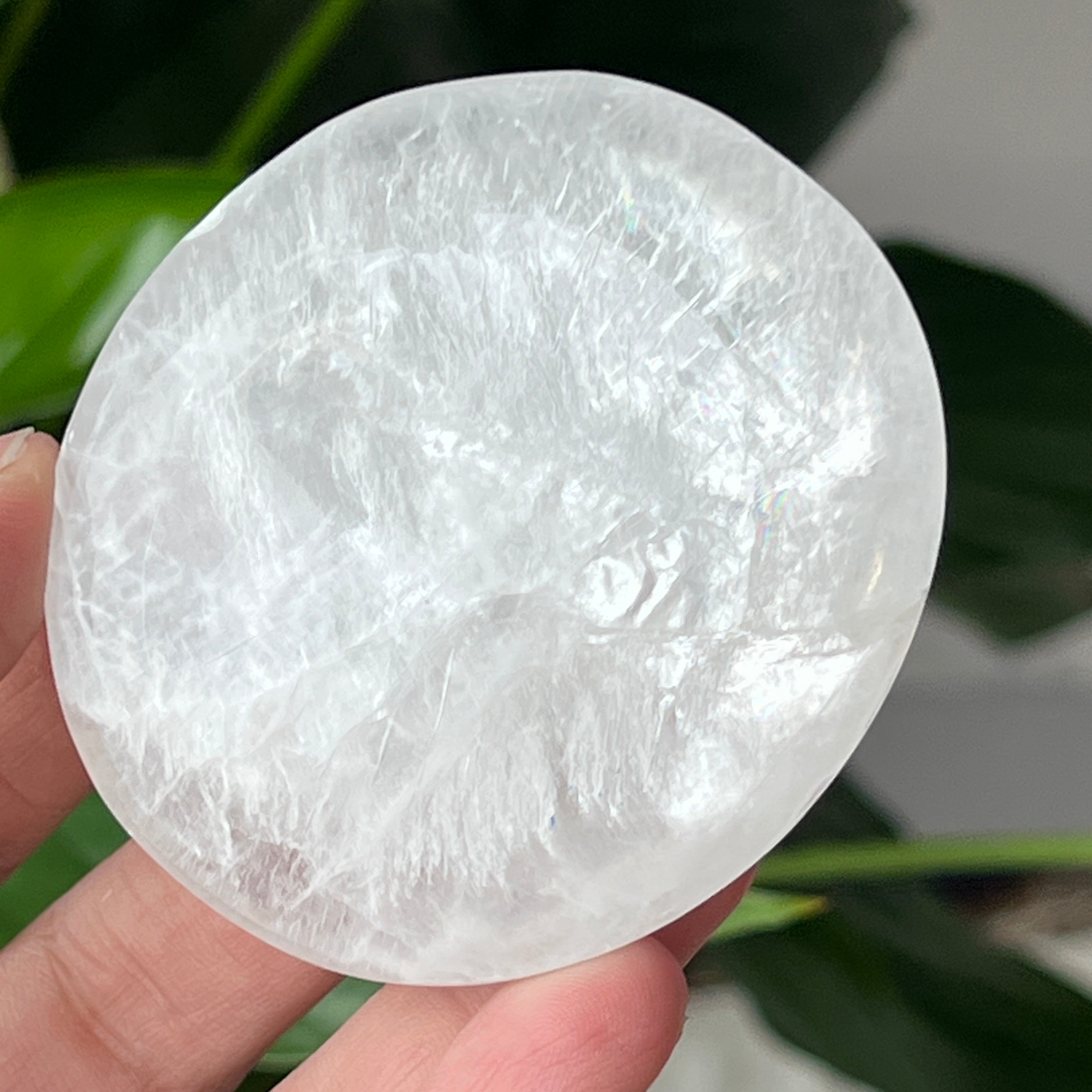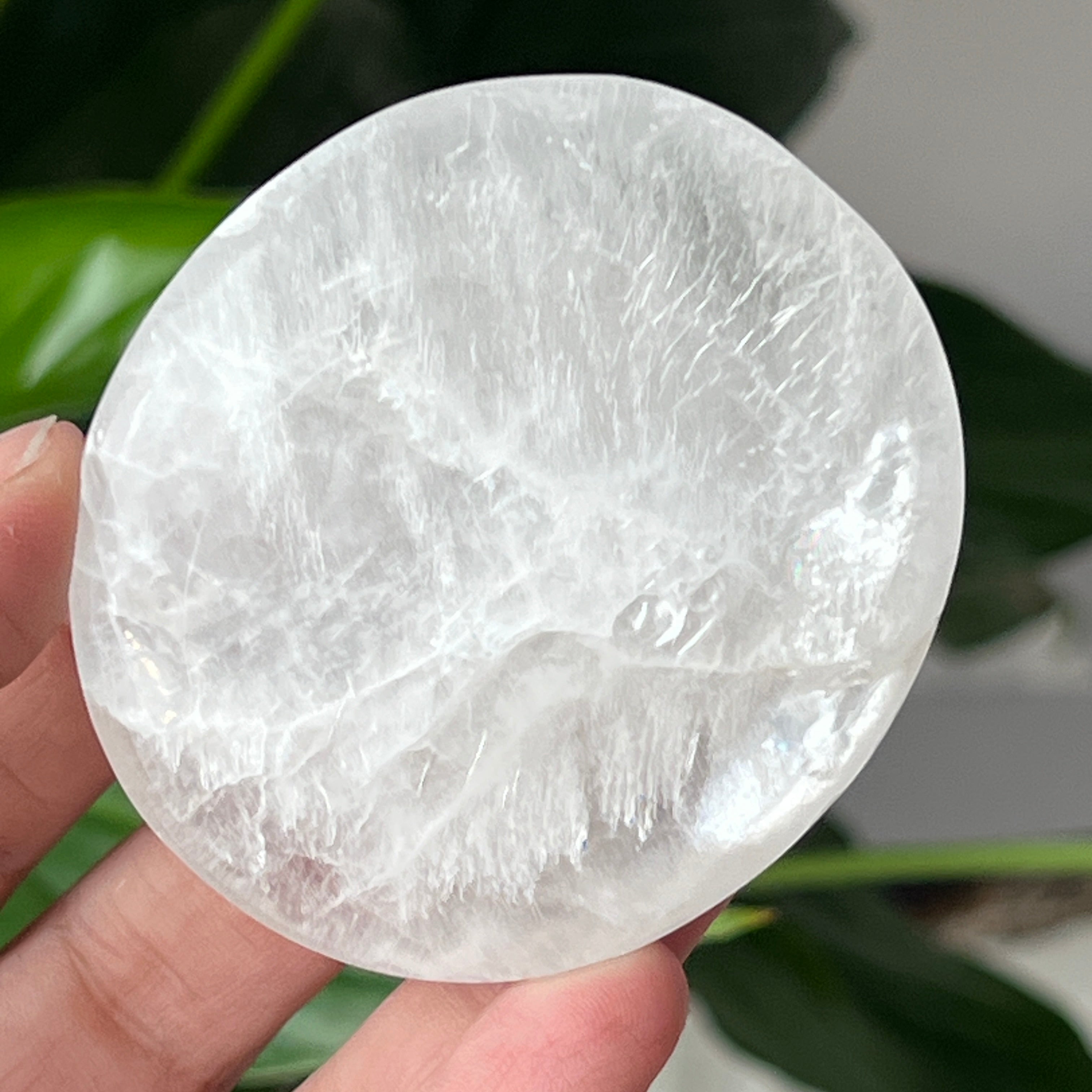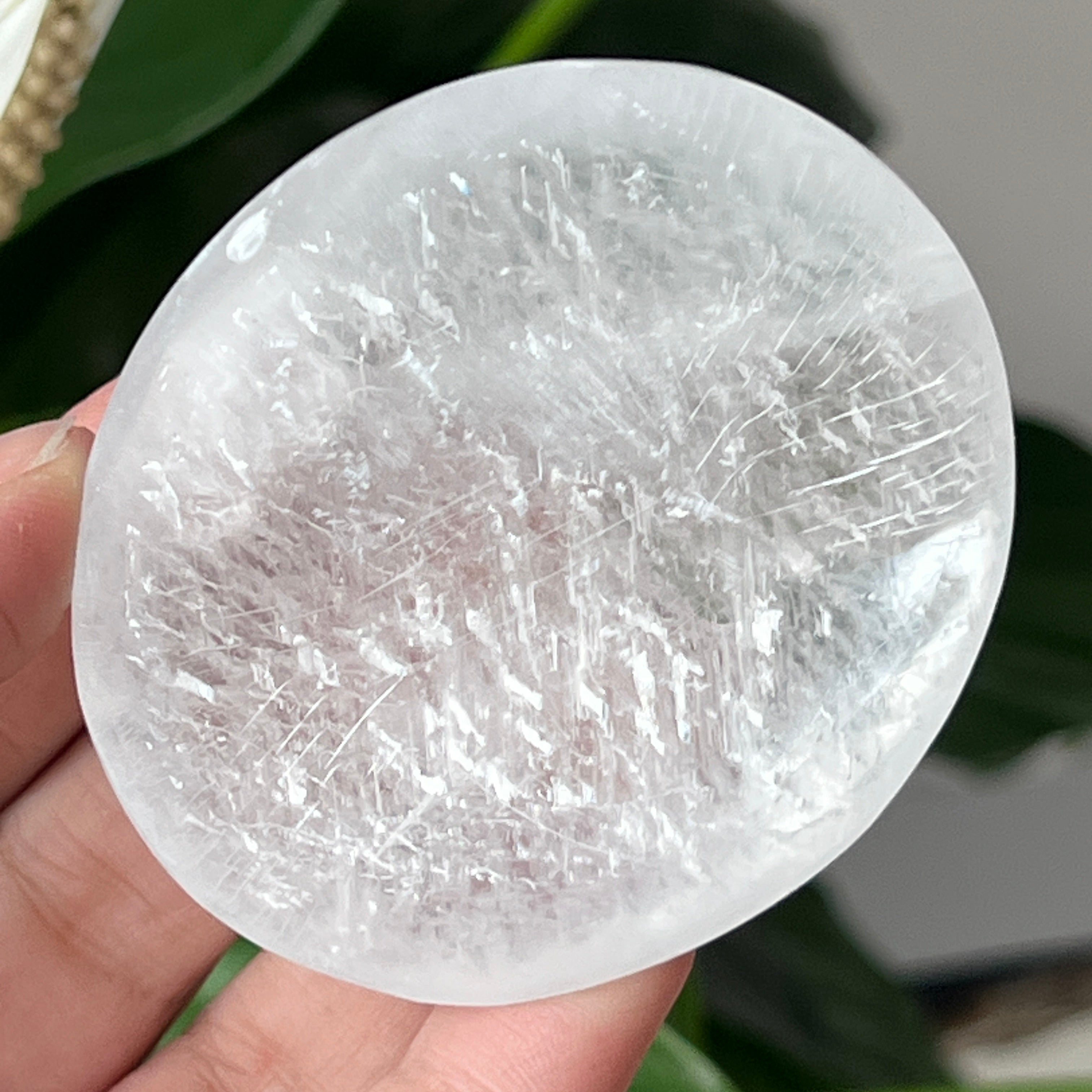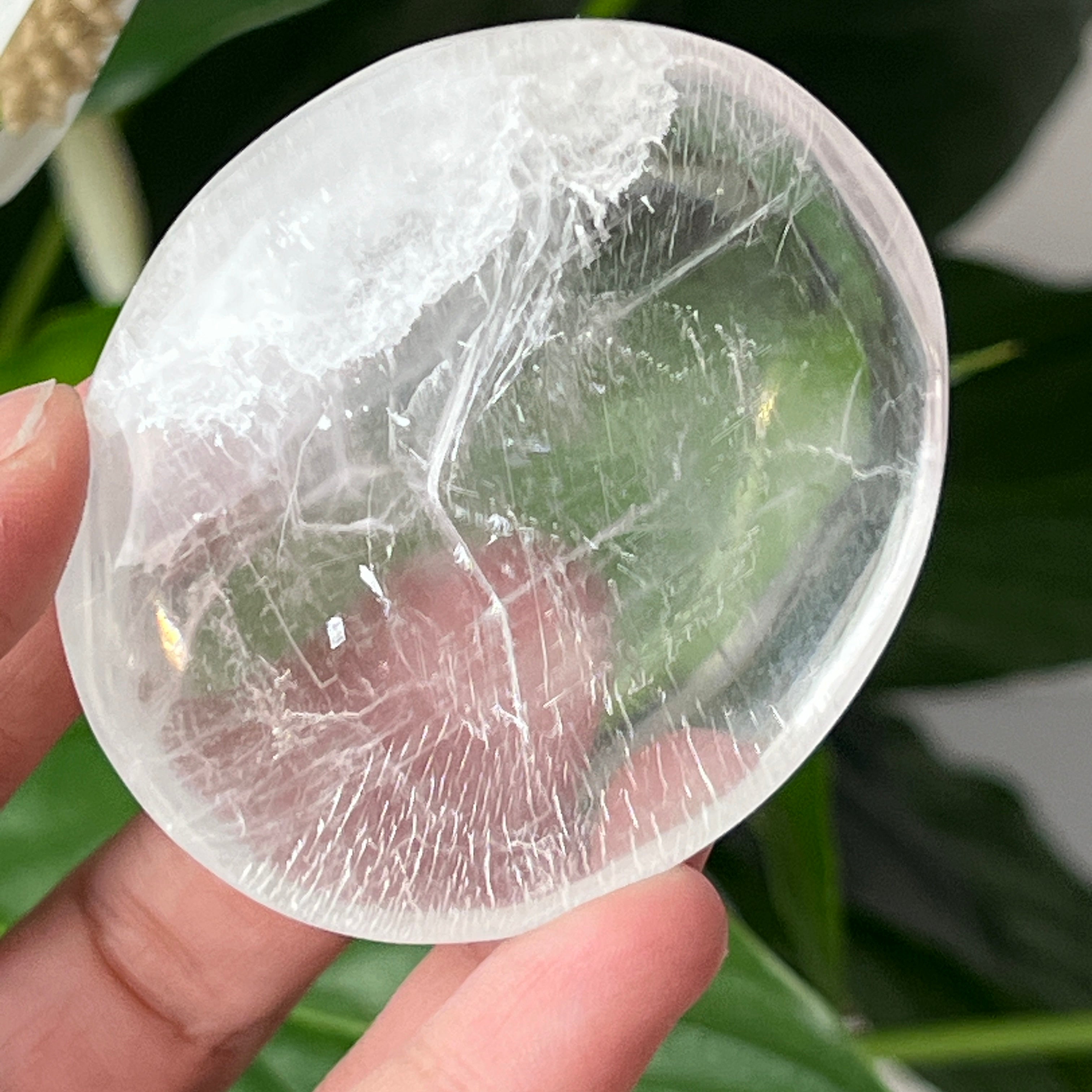 Ezt ovális szelenit üveges felülettel Marokkóból származik, és lenyűgöz áttetsző textúrájával és finom fényével. Az ovális forma, más néven "szappan" vagy pálmakő, ideális a tenyérben tartáshoz meditáció vagy relaxációs rituálék során.