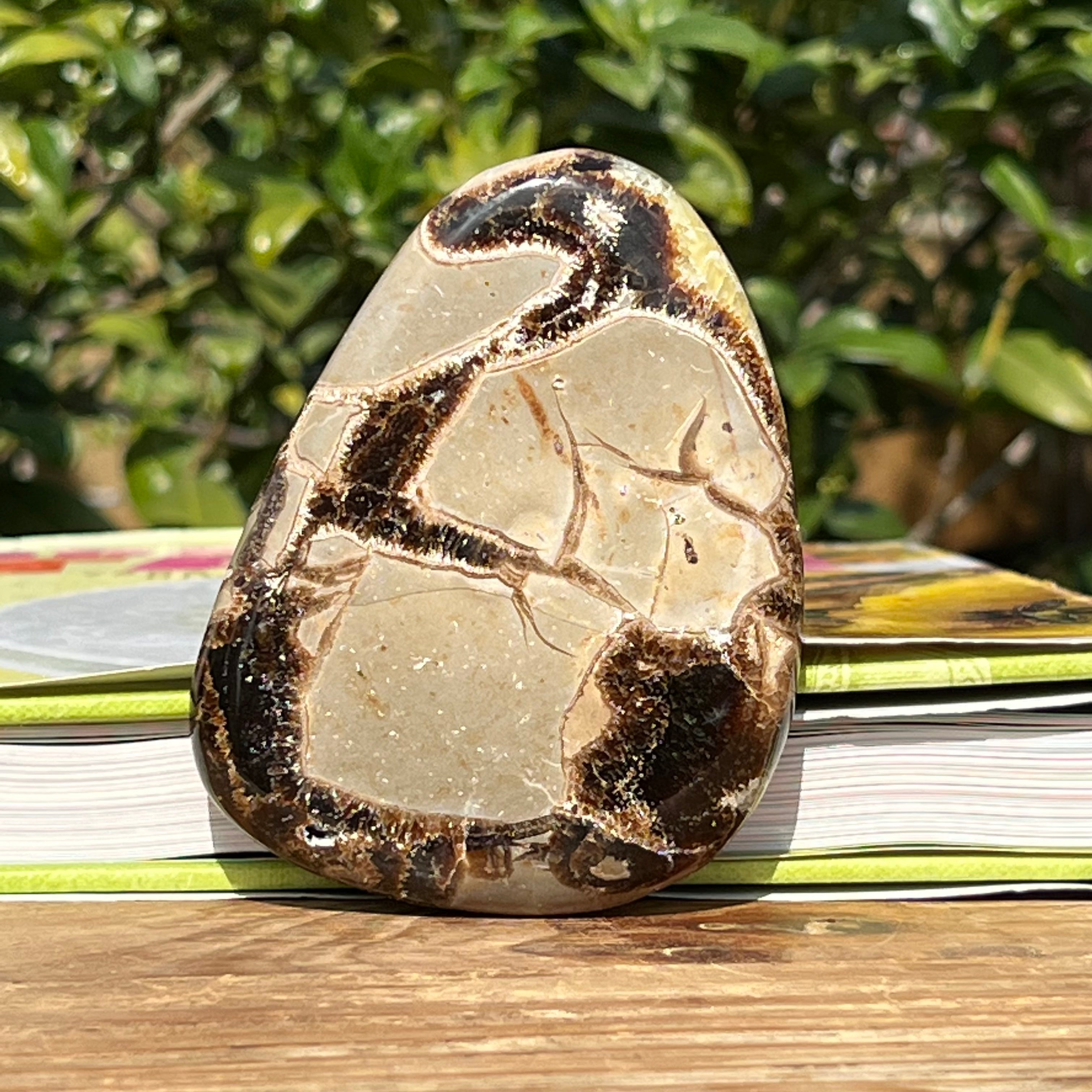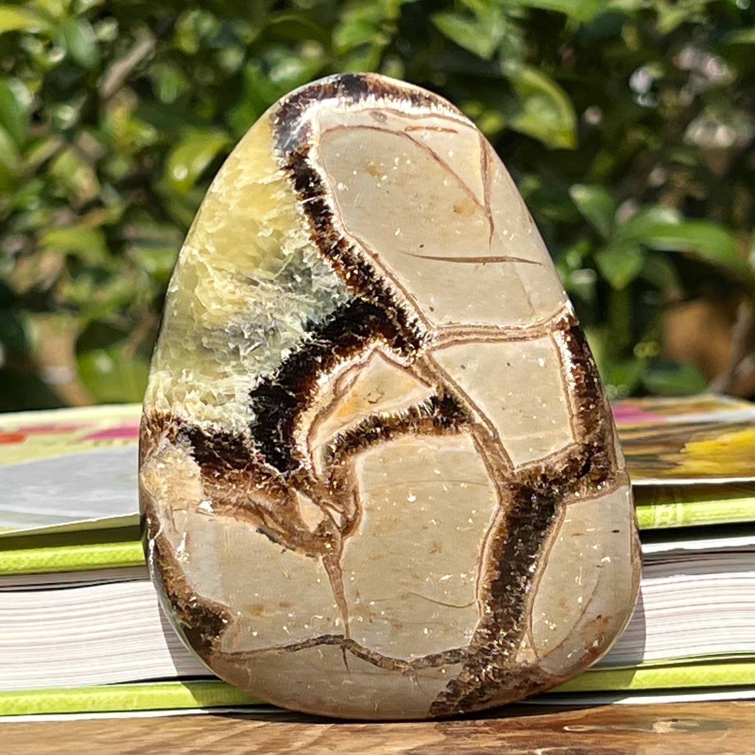 A Septaria kalcitból, limonitból, gipszből és baritból készül, olyan ásványokból, amelyek egyedi játékot alkotnak ebben a kőben, és különleges megjelenést kölcsönöznek neki.
