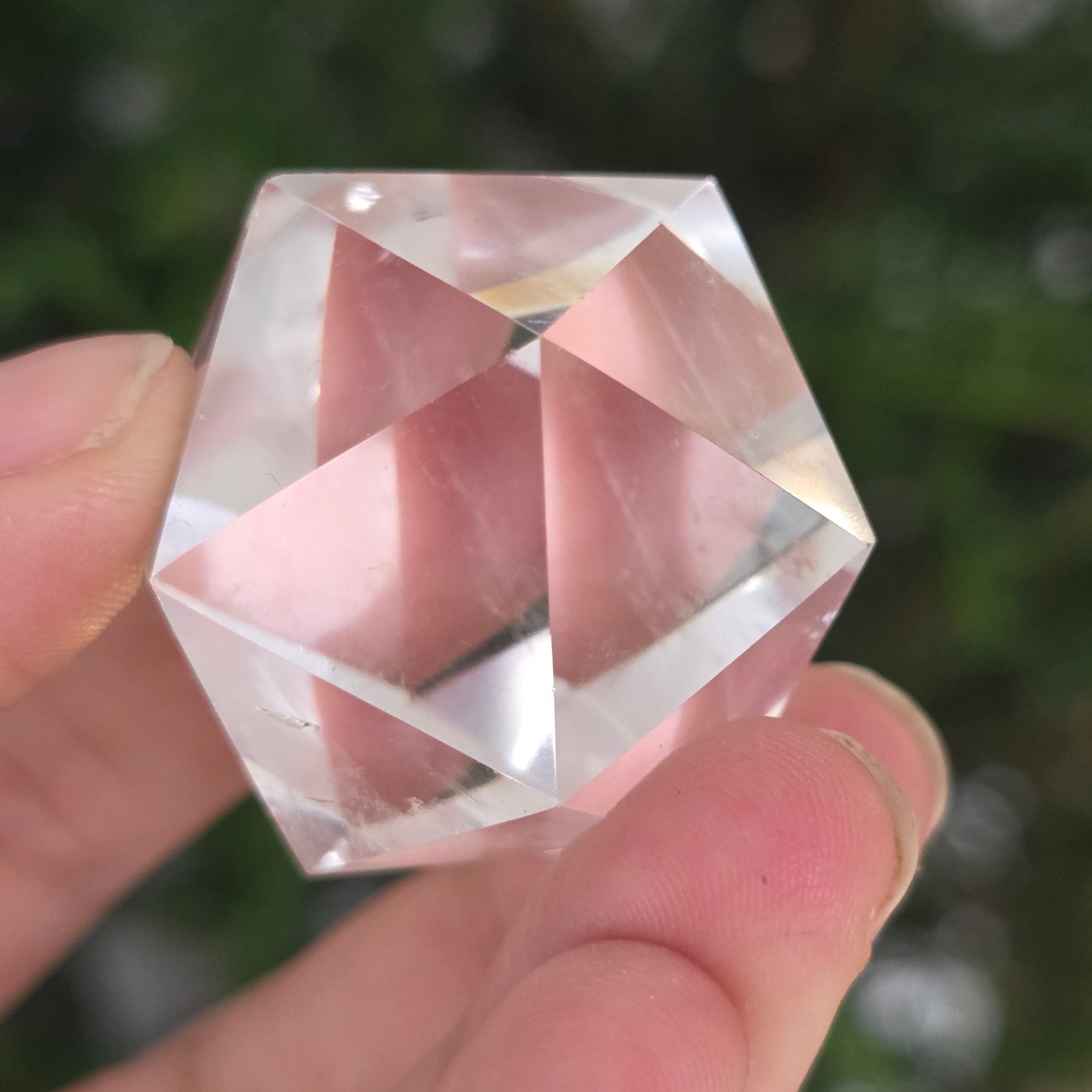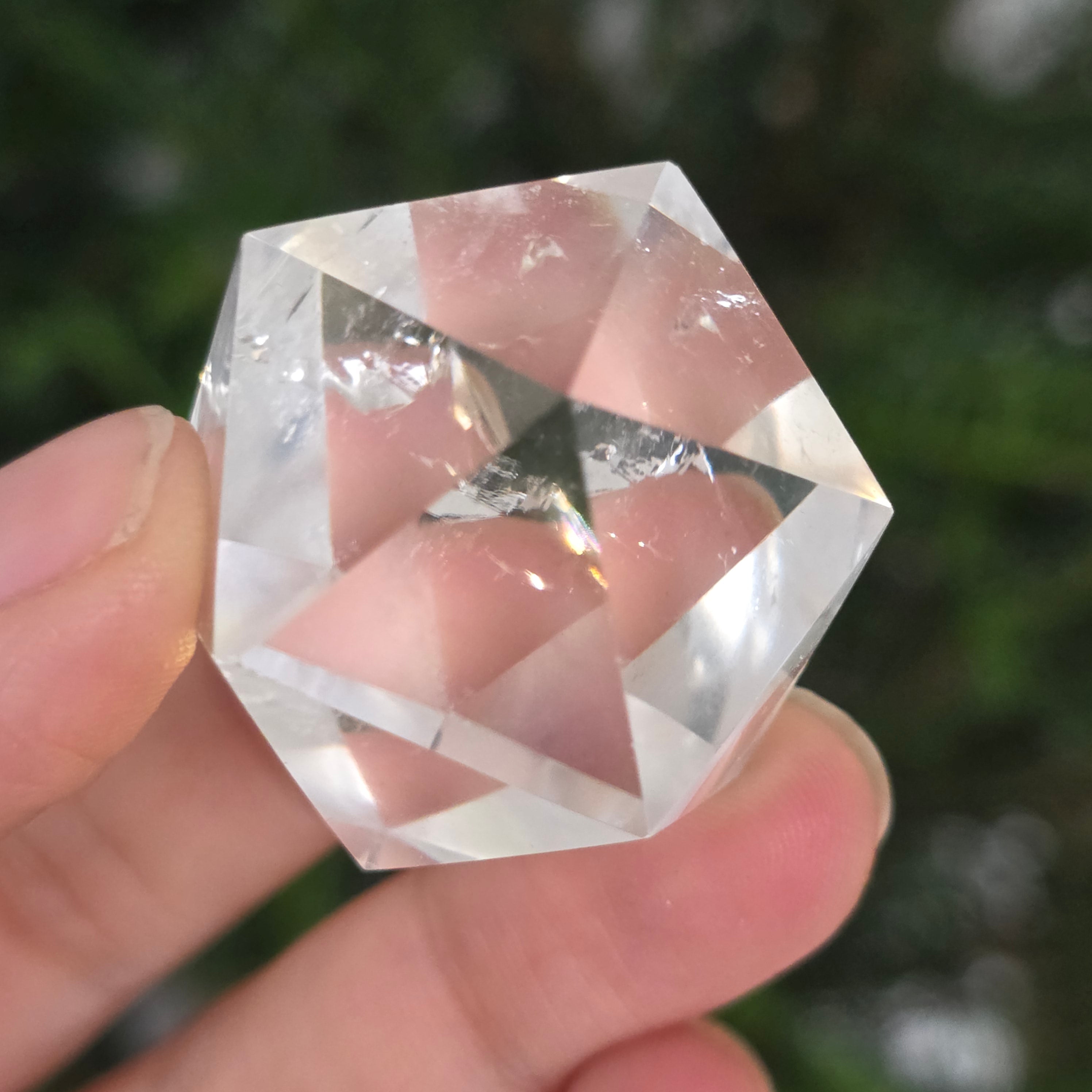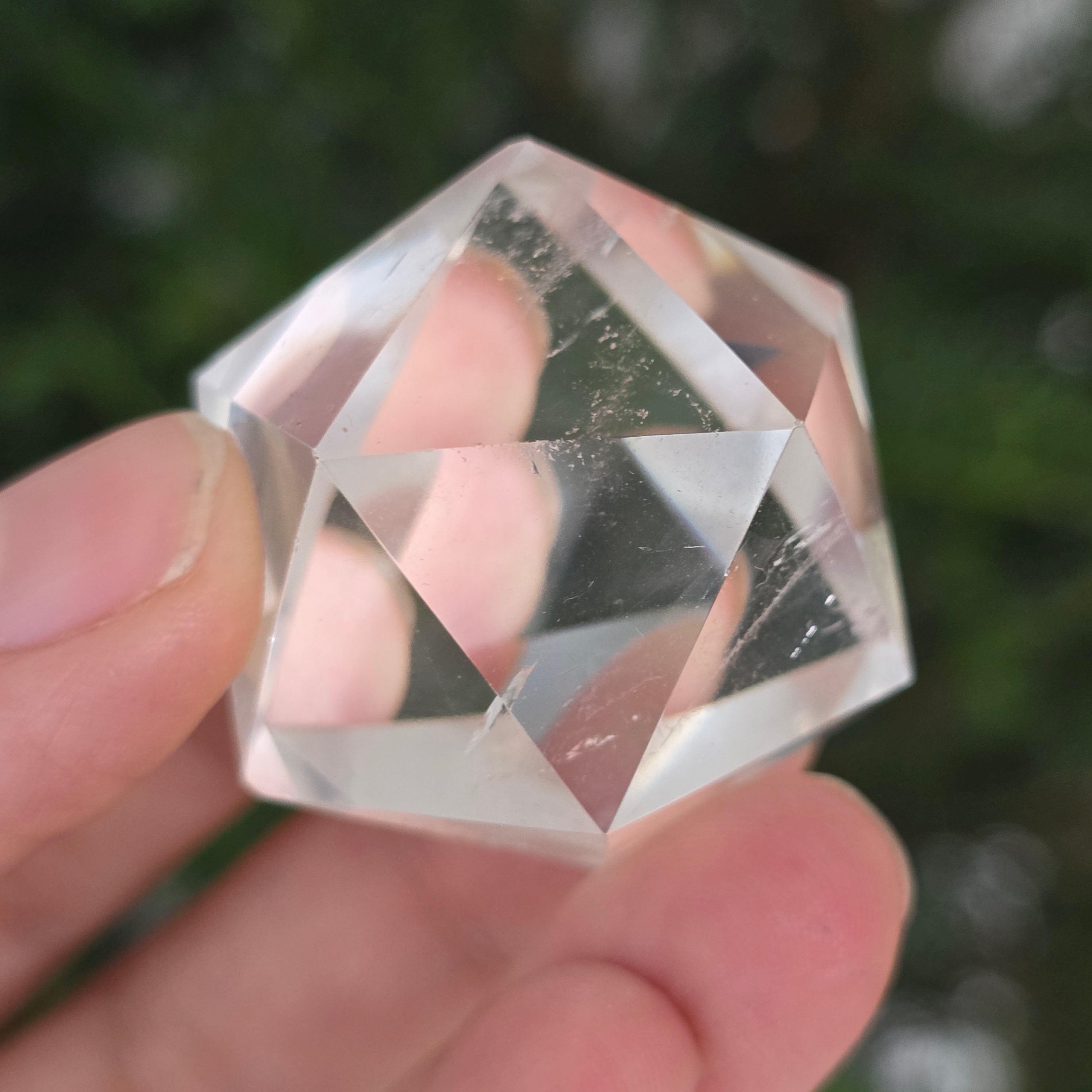 Színtelen kvarcból (hegyikristály) készült ikosaéder, amelyet kézzel precízen csiszoltak, és 20 egyenlő szárú háromszögből álló platóni test formáját ölti.