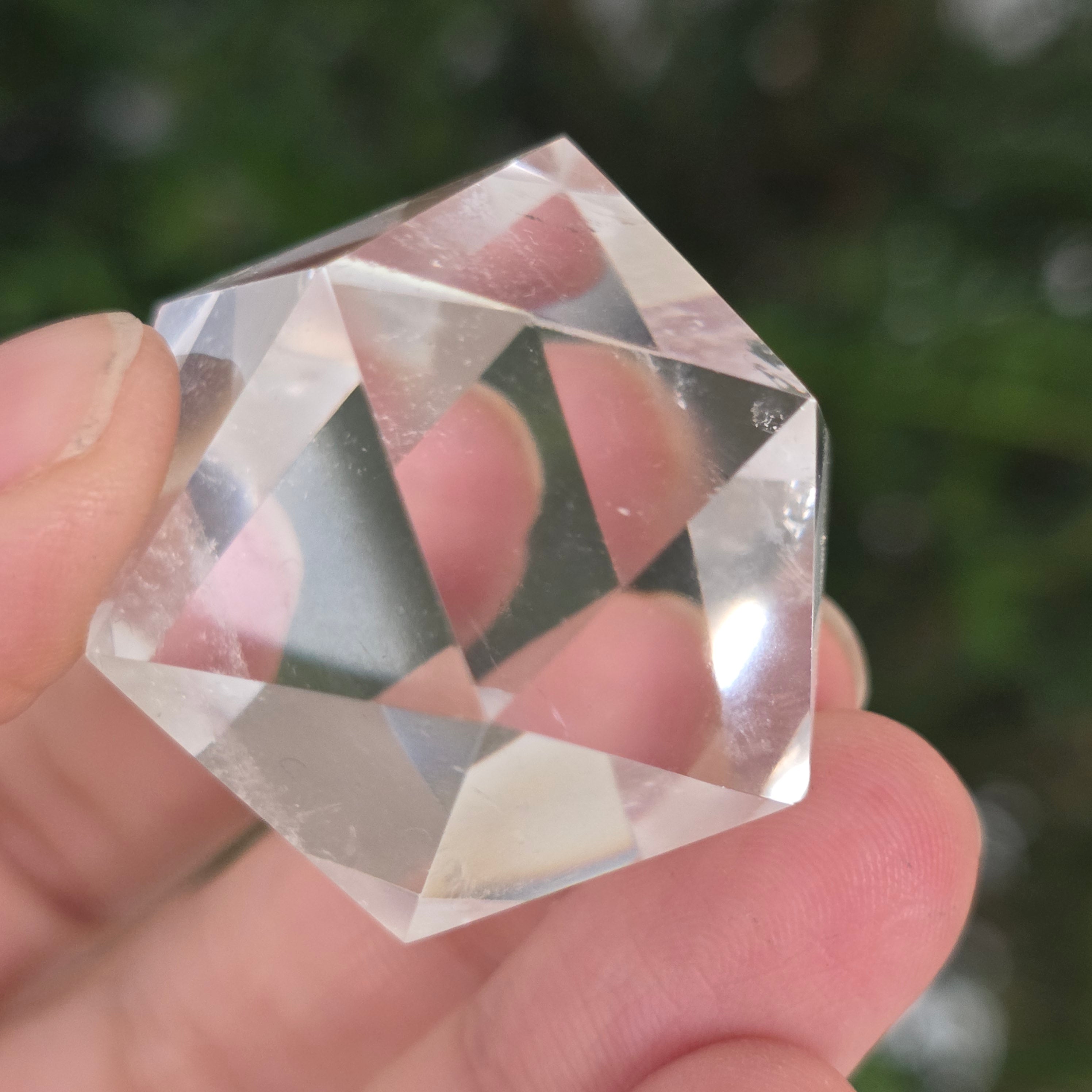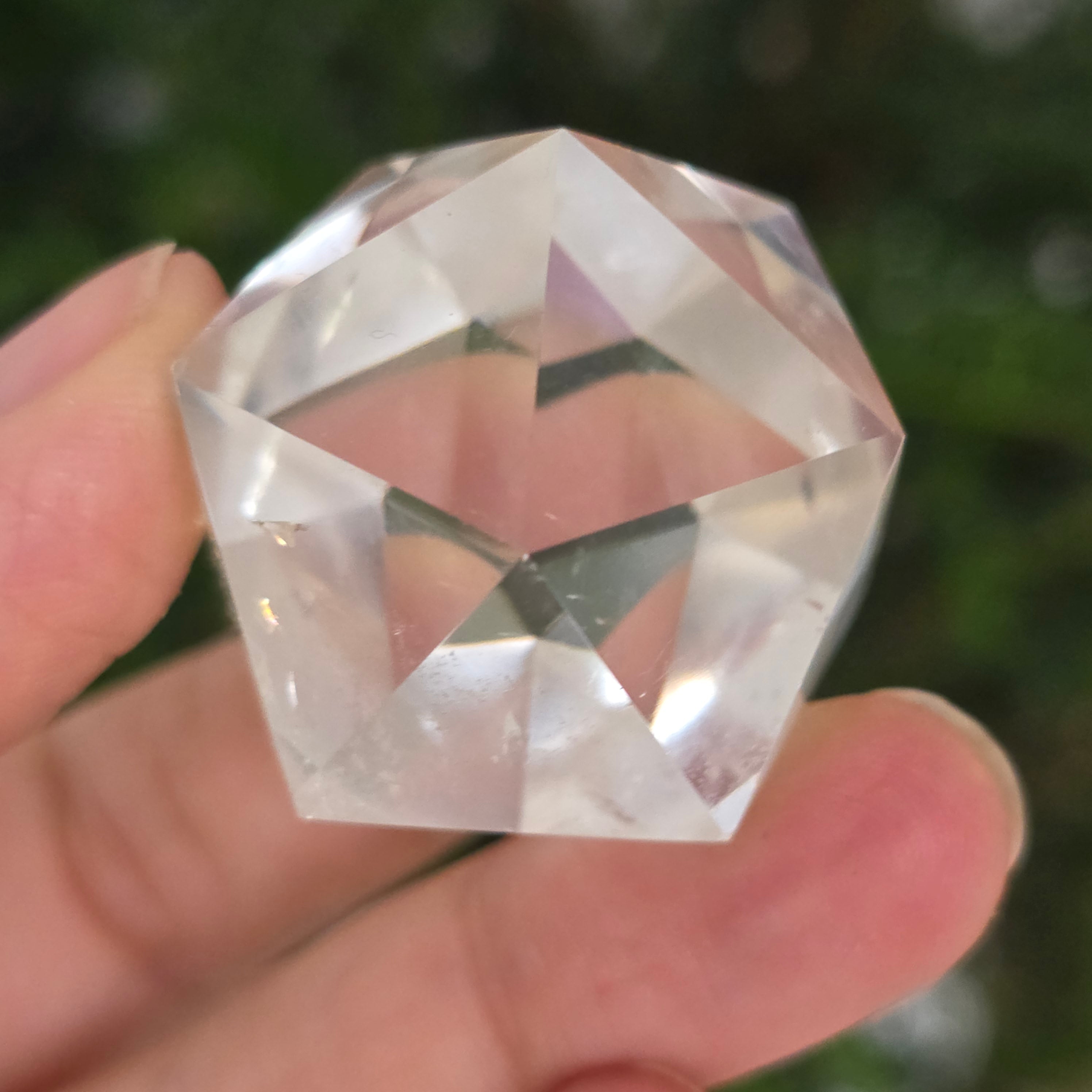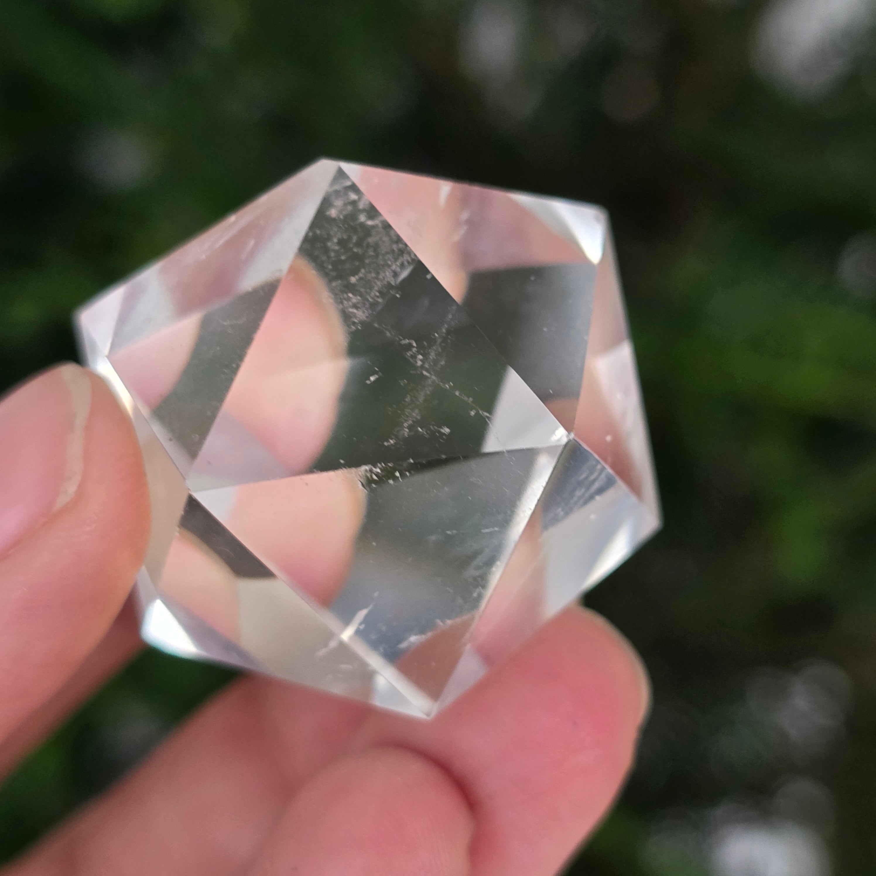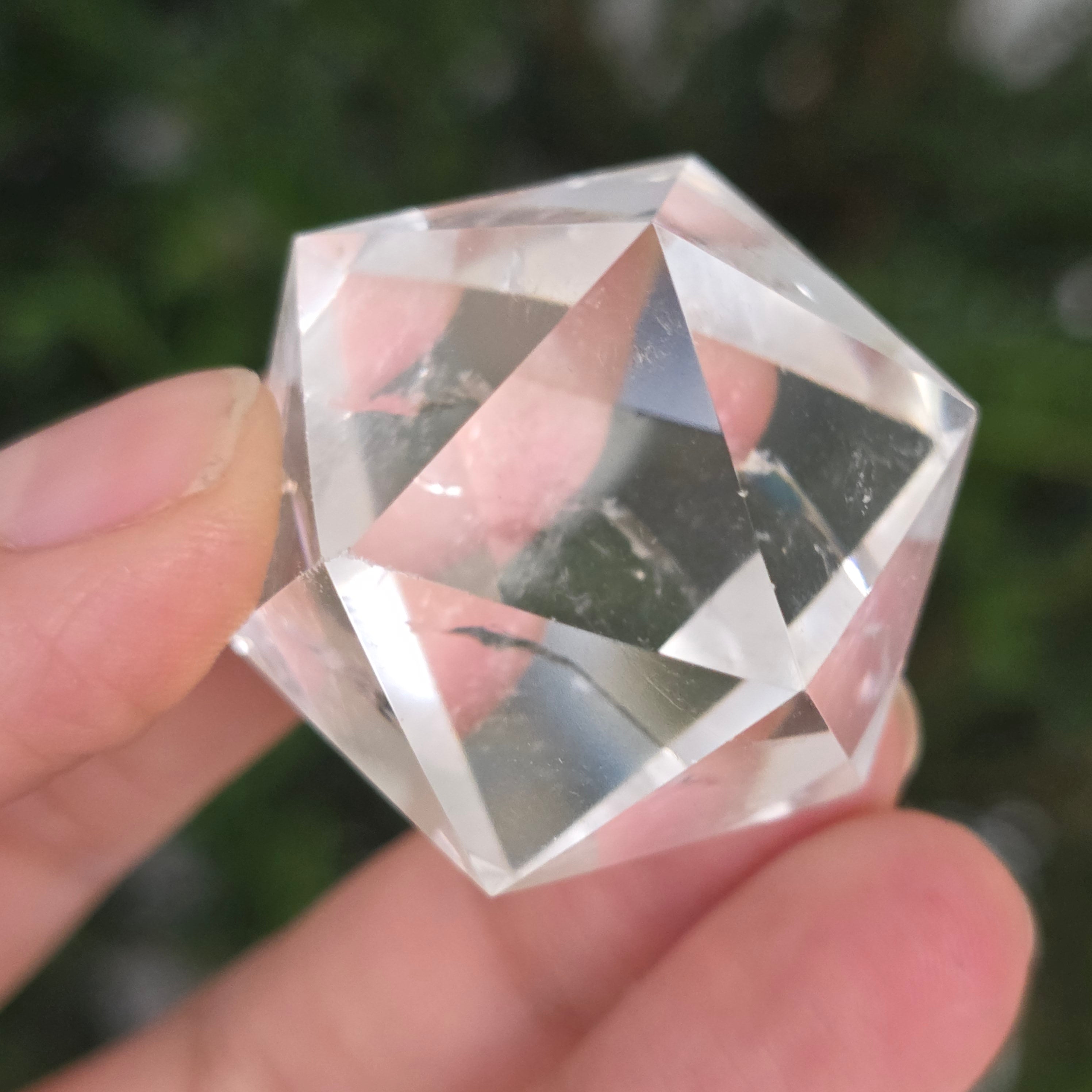 Színtelen kvarcból (hegyikristály) készült ikosaéder, amelyet kézzel precízen csiszoltak, és 20 egyenlő szárú háromszögből álló platóni test formáját ölti.
