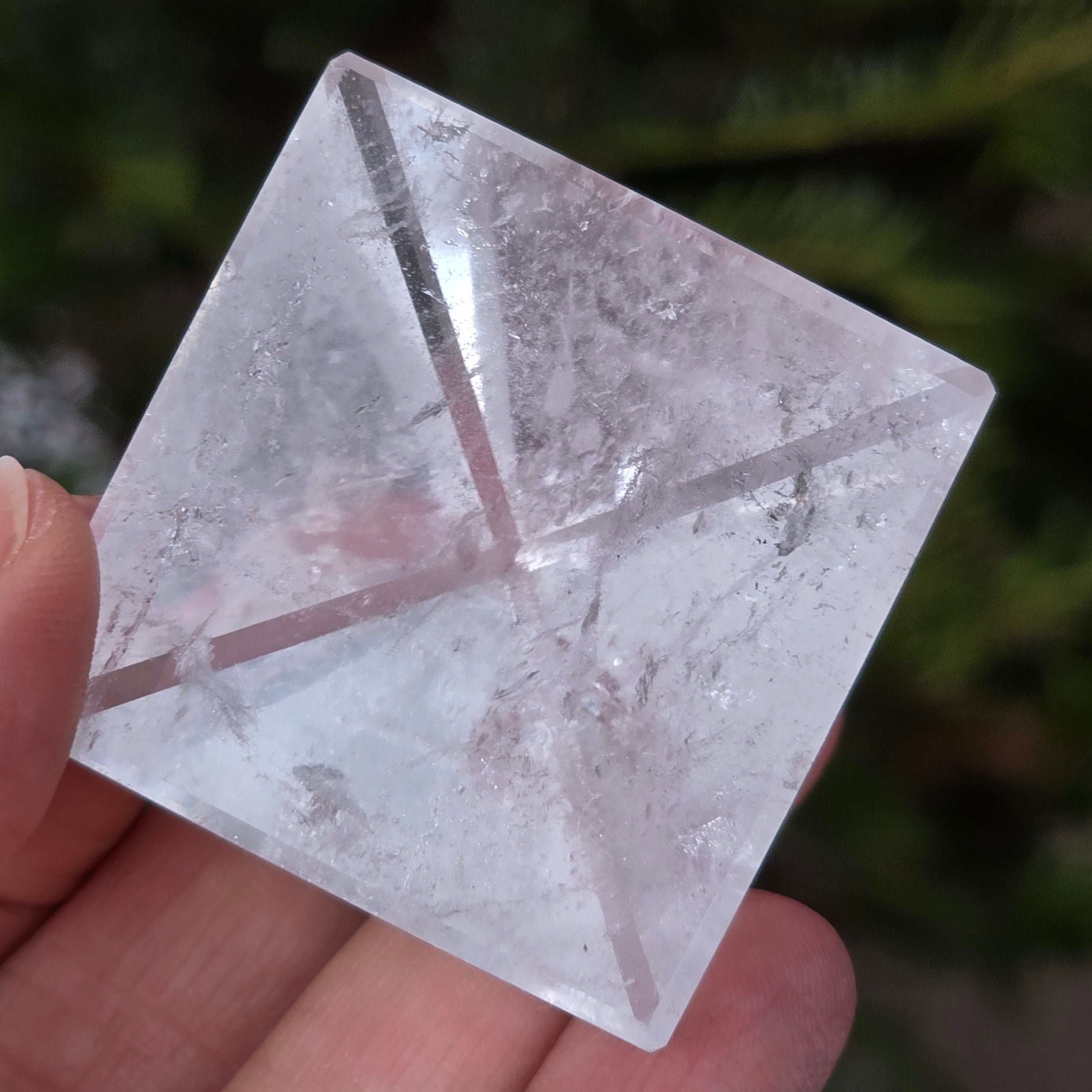 A színtelen kvarc piramis a tisztasággal, a szándék fokozásával és az energetikai egyensúllyal hozható összefüggésbe; formája rendezetten összpontosítja és irányítja az energiát. Gyakran használják az éles elme és a gondolat, érzelem és cselekedet közötti harmónia szimbólumaként.