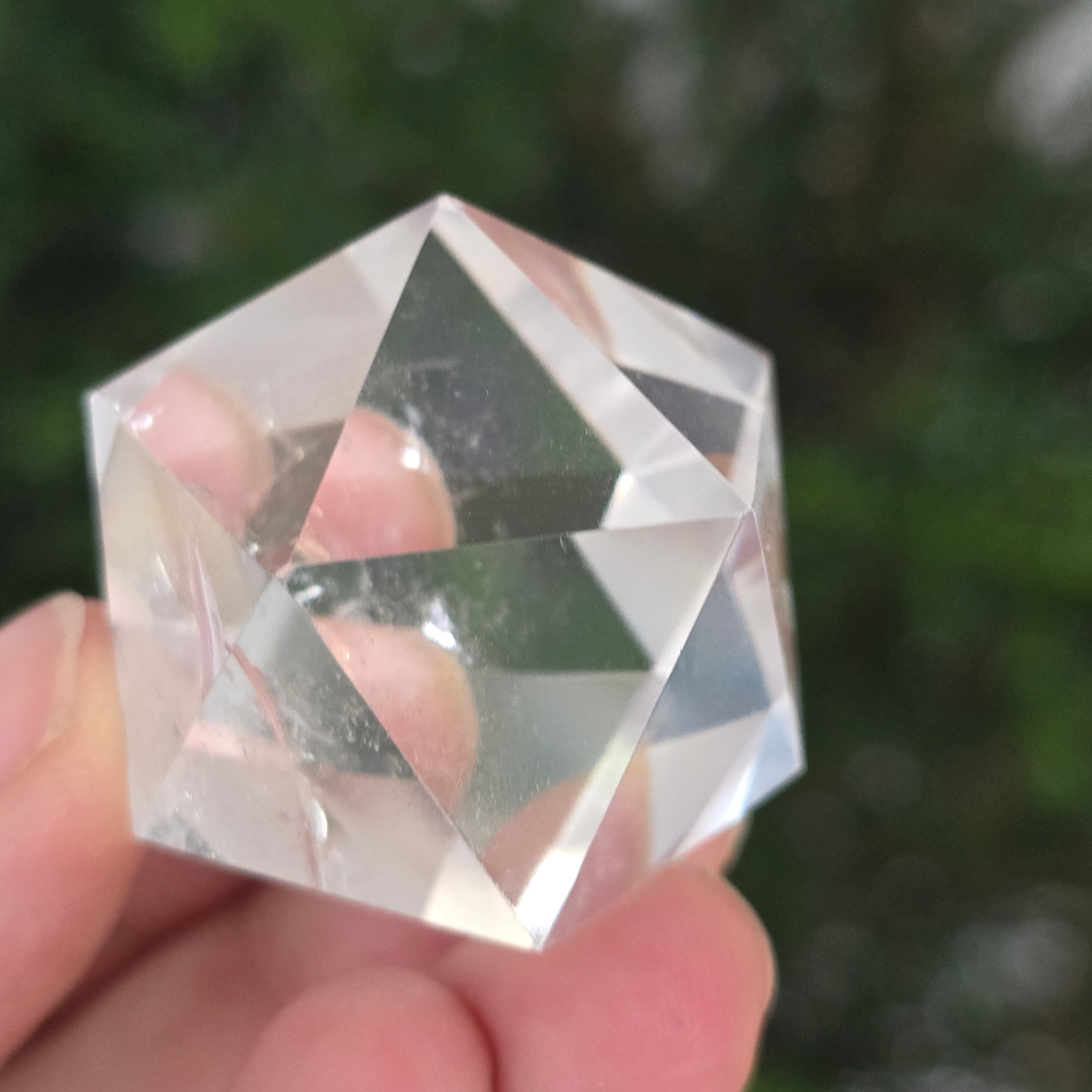 Színtelen kvarcból (sziklakristályból) készült icosaedron, kézzel precízen csiszolva, 20 egyenlő szárú háromszögből álló platóni test formára.