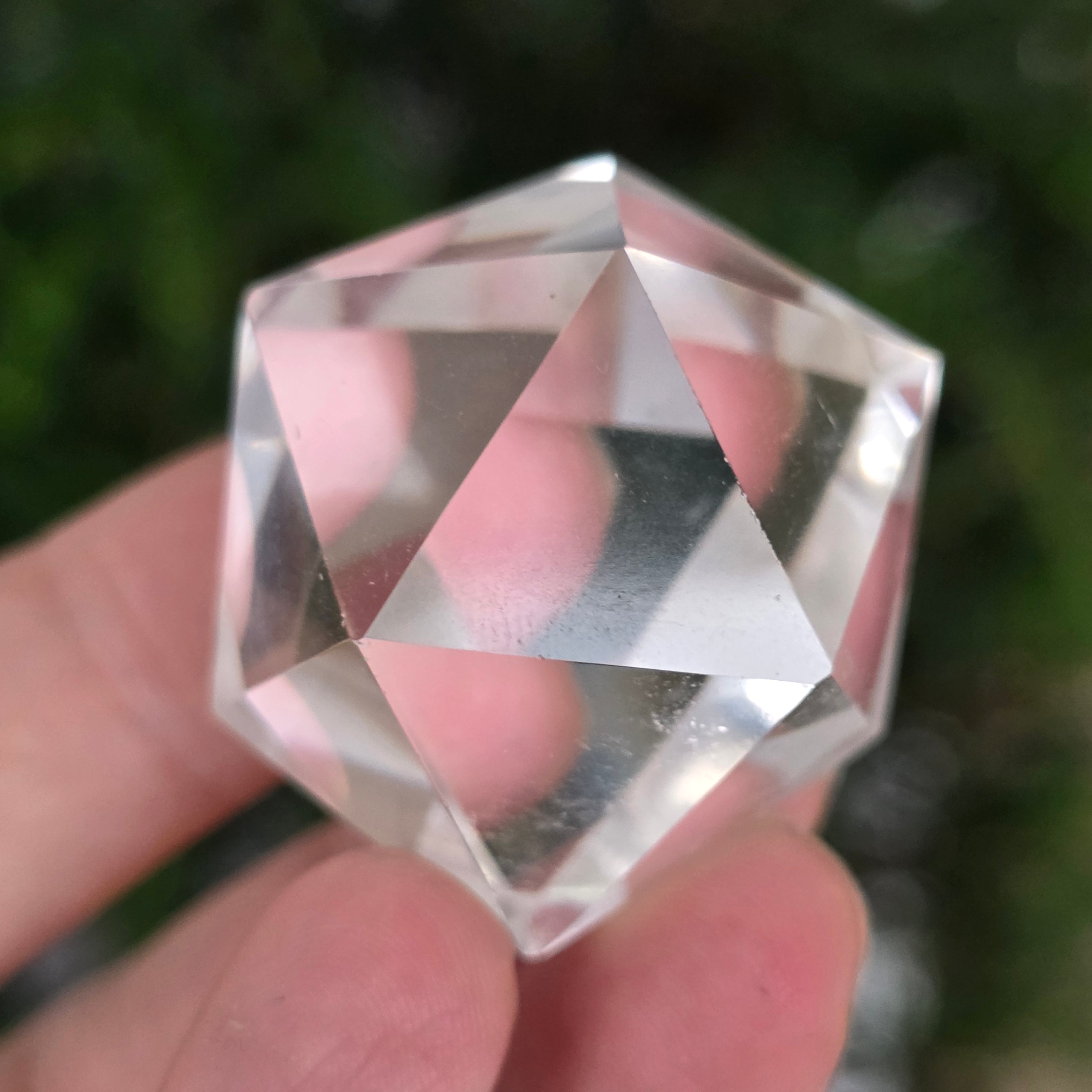 Színtelen kvarcból (sziklakristályból) készült icosaedron, finoman kézzel csiszolva, a platóni testek 20 egyenlő szárú háromszög alakú oldallapjának formájában.