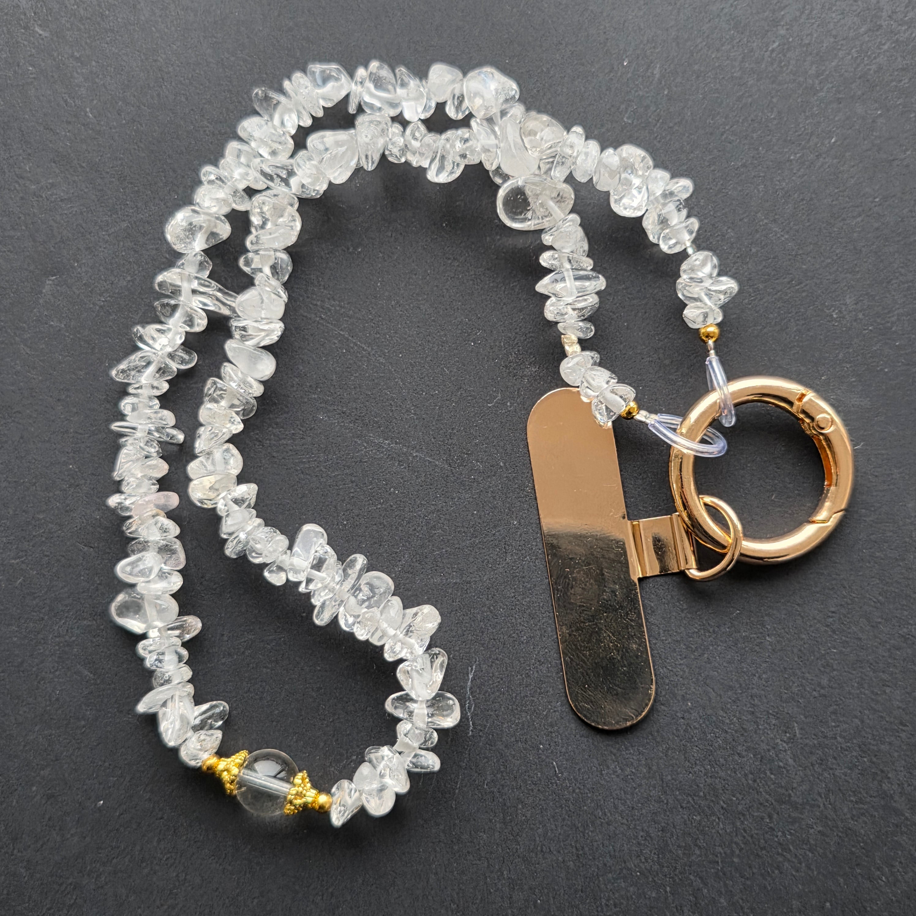 A színtelen kvarc telefontartó lánc olyan kiegészítő, amely ötvözi a kristályok természetes eleganciáját a modern élet mindennapi használatával. Valódi áttetsző kvarcszeletekből készült, minden darab apró csillogást vet, mint a jéggé fagyott cseppek, amelyek finoman táncolnak minden mozdulatra.